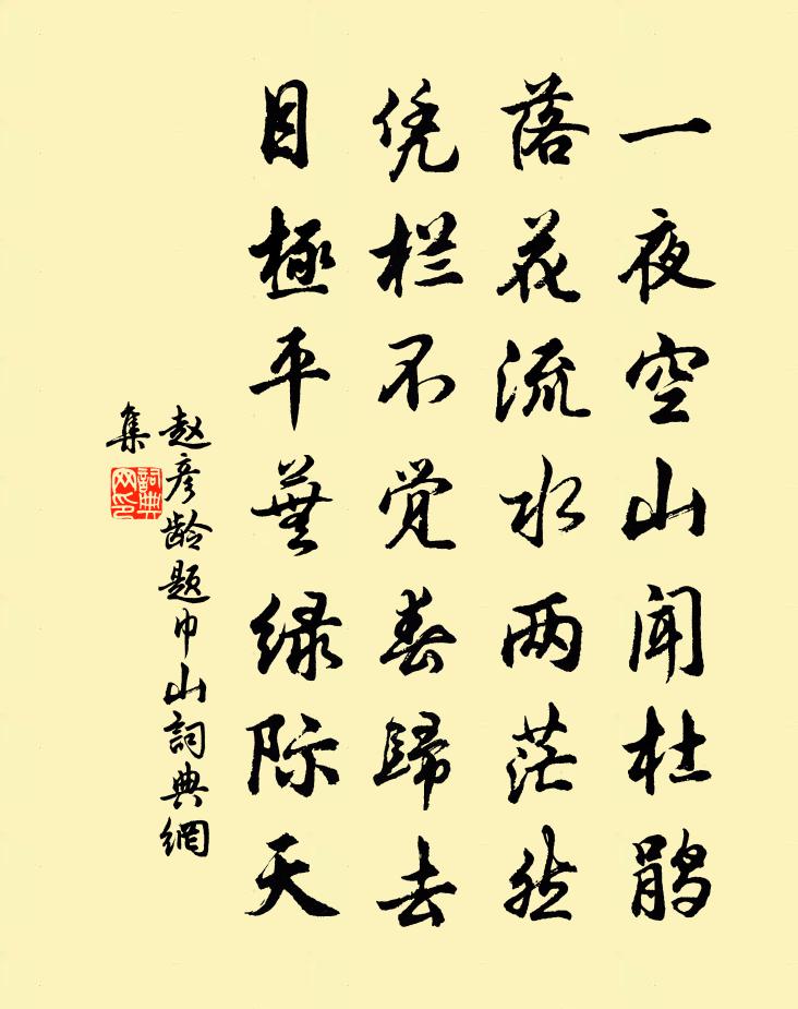 詩詞名句歷史字典書法欣賞書法字典國語詞典說文解字康熙字典古漢語字典標 題 作 者 詩 句 題巾山作者:趙彥齡 朝代:宋代題巾山原文一夜空山聞杜鵑,落花流水兩茫然。憑欄不覺春歸去,目極平蕪綠際天。詩詞問答問:題巾山的作者是誰?答:趙彥齡問:題巾山寫於哪個朝代?答:宋代趙彥齡題巾山書法欣賞題巾山書法作品詩詞推薦句袁說友〔宋代〕扁舟系柳向朱扉。雪夕奉陪天台明照禪師擁爐閒話錢惟演〔宋代〕藜燭檐香夜幄清,朔風窗際激飛英。鳳梨鴟芋煨將熟,坐擁豐貂話赤城。賀新郎 余家古瓶臘梅忽開,清香可愛,質之張之翰〔元代〕且雲,素難題詠,山谷簡齊但作小詩而已,在簡齊余作且勿論,偶不及東坡長句,何耶。因以樂府賀新郎見意不受贈別杜牧〔唐代〕眼前迎送不曾休,相續輪蹄似水流。門外若無南北路,人間應免別離愁。蘇秦六印歸何日?潘岳雙毛去值秋。莫怪故居鄭剛中〔宋代〕北山三十里,憶得舊書堂。小徑通蔬圃,新醅壓酒床。晚涼荷葉嫩,細雨橘花香。此夢今何許,隨緣又一方。屋角丹楓姜特立〔宋代〕金行肅物慾功成,一夜江楓點翠屏。不是天公愛紅葉,要驅小隱入丹青。鴛鴦湖棹歌 之七朱彝尊〔清代〕百尺紅樓四面窗,石樑一道鎖晴江。自從湖有鴛鴦目,水鳥飛來定自雙。 菩薩蠻王庭珪〔宋代〕武陵西上沅陵渡。扁舟忘了來時路。花外有人煙。相逢疑是仙。清尊留夜語。醉倒知何處。歸去客心驚。金雞嘲哳隆興書堂自警三十五首陳淳〔宋代〕事事物物間,私皆在所滌。一裘憾雖微,子路必勇克。嘉定六年皇后閣春貼子詞五首真德秀〔宋代〕殿稱觴早包,仙班擁翠翹。春來多樂事,人日是明朝。吳宮詞張嵲〔宋代〕新妝間花光,口脂雜蘂氣。相對兩生春,停杯自成醉。高歌白苧舞西施,半夜雨來宮錦移。明日重來歌舞地,宮水雜曲歌辭。昔昔鹽。倦寢聽晨雞趙嘏〔唐代〕去去邊城騎,愁眠掩夜閨。披衣窺落月,拭淚待鳴雞。不憤連年別,那堪長夜啼。功成應自恨,早晚發遼西。依韻奉和經略司徒侍中清明興慶池上之作強至〔宋代〕後騎前騶拂曉晴,風光初轉繡旗明。功名上相班春樂,談笑西戎計日平。煙際飛禽屏上見,水邊游妓鑒中行。勸公南歌子·萬萬千千恨辛棄疾〔宋代〕萬萬千千恨,前前後後山。傍人道我轎兒寬。不道被他遮得、望伊難。今夜江頭樹,船兒系那邊。知他熱後甚時眠浙江有感王回〔宋代〕候潮門外浙江西,曾憶浮舟自此歸。萬古波濤今日是,一身蹤跡昔人非。愁侵壯齒頭先白,淚入秋風眼易眵。日暮宿島徑夷山舍陳陶〔唐代〕百里床遵島徑,床蓬徵信邅床回。暝依床漁樵宿,似過黃金台。缺齧心未理,寥寥夜猿哀。山深石床冷,海近腥氣昭潭十愛梅摯〔宋代〕我愛昭州水,湘漓共一源。本無汙泥滓,去有棹歌喧。沃野藤溪道,浮琛玉海門。有時新雨漲,多半是君恩。送秦州從事羅隱〔唐代〕一枝何足解人愁,拋卻還隨定遠侯。紫陌紅塵今別恨,九衢雙闕夜同游。芳時易失勞行止,良會難期且駐留。若到宿巫山下李白〔唐代〕昨夜巫山下,猿聲夢裡長。桃花飛綠水,三月下瞿塘。雨色風吹去,南行拂楚王。高丘懷宋玉,訪古一沾裳。夜酌趙侯家聞合流曹光道詣府遂訪之一夕縱談梅堯臣〔宋代〕方與舊將飲,談兵燈燭前。聞有故交至,心喜輒論邊。跨馬踏明月,往見競留連。且共語出處,子懷予久然。男兒名句推薦零落成泥碾作塵,只有香如故。陸游《卜運算元·詠梅》 杯酒相延,今夕不應慳。陳著《江城子·中秋早雨晚晴》 金谷園中柳,春來似舞腰。李益《上洛橋》 細草微風岸,危檣獨夜舟。杜甫《旅夜書懷》 志不強者智不達。墨子《墨子·02章 修身》 天不再與,時不久留,能不兩工,事在當之。呂不韋《呂氏春秋·覽·孝行覽》 繡帳已闌離別夢,玉爐空裊寂寥香。馮延巳《浣溪沙·春到青門柳色黃》 雲霞出海曙,梅柳渡江春。杜審言《和晉陵陸丞早春遊望》 曾與美人橋上別,恨無訊息到今朝。劉禹錫《楊柳枝 / 柳枝詞》 槐葉初勻日氣涼,蔥蔥鼠耳翠成雙。范成大《夏日田園雜興》