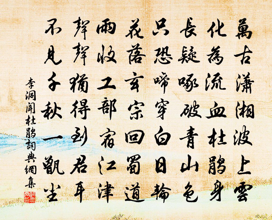 詩詞名句歷史字典書法欣賞書法字典國語詞典說文解字康熙字典古漢語字典標 題 作 者 詩 句 聞杜鵑作者:李洞 朝代:唐代聞杜鵑原文萬古瀟湘波上雲,化為流血杜鵑身。長疑啄破青山色,只恐啼穿白日輪。花落玄宗回蜀道,雨收工部宿江津。聲聲猶得到君耳,不見千秋一甑塵。詩詞問答問:聞杜鵑的作者是誰?答:李洞問:聞杜鵑寫於哪個朝代?答:唐代問:聞杜鵑是什麼體裁?答:七律李洞聞杜鵑書法欣賞聞杜鵑書法作品注釋全唐詩:卷723-21詩詞推薦奉和奧屯都事秋懷馬祖常〔元代〕靈河七夕巧雲稠,墜露聲清夜得秋。月冷桂花飄左界,山寒荔子落東甌。人憐紈縞裁衣袂,誰借蒲葵剪扇頭。竹影跋劉敏叔畫楊誠齋先生探梅圖左謨〔宋代〕沖寒踏雪行溪路,對月看梅太瘦生。莫道親曾陪杖屨,只今見畫也心清。梅花盛開有粉蝶沖寒而至胡仲弓〔宋代〕翩翩拍舞下瑤階,知是東君間諜來。深入粉香人不見,花心搖落卻飛回。和陳守喜雨詩陳元晉〔宋代〕垤鸛無聲口舌乾,誰驅雷雨遍千山。頓蘇赤地千里旱,特出黃堂一念間。澤物功深無德色,豐年願遂有歡顏。為霖五老宋伯仁〔宋代〕髀肉豐腴鬢髮疏,將軍健飯待何旭。七禽不了中原事,羞讀君問勞書。萬州守潘拉登魯池觀荷花荔枝魏了翁〔宋代〕分隨猿鶴老隈支,趨詔重來兩鬢絲。解後一觴莫辭凸,能禁二十載差池。【雙調】快活年盍西村〔元代〕閒來乘興訪漁樵,尋林泉故交。開懷暢飲兩三瓢,只願身安樂。笑了重還笑,沉醉倒。無夢令 贈蓬萊散人馬鈺〔元代〕一志孤清守道。十地遍生芝草。百行謹行持,千日煉成真寶。真寶。真寶。萬劫容光轉好。謝張芸窗劉啟之〔宋代〕夜深檛鼓醉紅裙,半世侯門熟稔聞。自是東籬窺宋玉,非關司馬挑文君。蒼頭誤送香羅帕,簧舌翻成貝錦文。幸賴碁釋行海〔宋代〕一著臨期下手難,但尋活路向前行。從教對面成千里,黑白分明不用爭。齋中雜興十首以丈夫貴壯健慘戚非朱顏為韻陸游〔宋代〕閒居寂無客,柴門晝常關。孤舟小於葉,放浪煙水間。樹暗楊梅村,露下白蓮灣,釣魚樵風涇,買酒石帆山,向來遣懷釋紹嵩〔宋代〕落拓無生計,放懷使所便。托心時散帙,即事偶成篇。此道欣逢泰,平生祗信緣。殷勤伴幽獨,松亞小窗前。賀王實之得第二子劉克莊〔宋代〕臞翁活計未全迂,老驥新生汗血駒。攀桂肯輸郎罷否,分梨還讓阿兄無。應陳俎豆為嬉戲,想見詩書補抹塗。報與步步高佚名〔宋代〕四更里,玄圃清風細。來往無凝滯。解垢衣。心月高懸照雲溪。上天梯。獨折蟾宮桂。三界十方惟獨步。認得曹溪鄭主簿宅看雪訪梅聽僧撫琴偶成四韻倩蕭中立陳藻〔宋代〕鵝毛散亂三朝雪,烏帽沾濡六出花。梅吐萬枝香滿室,桐聽幾曲興乘槎。蓬萊借問仙仇覽,人世何妨醉釋迦。騷客過般若庵釋正覺〔宋代〕重軒瘦立曲欄頭,島嶼青微冷枕流。望眼解隨沙水轉,賞心真與岸雲浮。平分野色連延屋,點破江光相趁舟。般若依韻和江鄰幾癸巳六月十日同刁吳韓楊飲范景梅堯臣〔宋代〕江翁多感慨,飲散來直廬。題蹤有舊友,連蹇常與渠。昨歸天祿下,念昔悲有餘。未久復外補,安能戀清虛。得請廣陵送趙主簿自蜀歸絳州寧覲戴叔倫〔唐代〕將歸汾水上,遠省錦城來。已泛西江盡,仍隨北雁回。暮雲征馬速,曉月故關開。漸向庭闈近,留君醉一杯。米元章曹子建應詔詩帖贊岳珂〔宋代〕呼嗟乎丕,摧乾弱支。予讀此詩,何異乎煮豆而燃萁。弔古以詩,觀帖以奇。瑤鈿銀泥,以侈厥題。劍門關曹宗旦〔宋代〕鑿開千里地,通得一隅天。疊嶂連三峽,重門扼兩川。名句推薦江碧鳥逾白,山青花欲燃。杜甫《絕句二首》 弔影分為千里雁,辭根散作九秋蓬。白居易《望月有感》 酒美梅酸,恰稱人懷抱。李清照《蝶戀花·上巳召親族》 良馬難乘,然可以任重致遠;良才難令,然可以致君見尊。墨子《墨子·01章 親士》 無奈朝來寒雨,晚來風。李煜《相見歡·林花謝了春紅》 巨屨小屨同賈,人豈為之哉。孟子《孟子·滕文公章句上·第四節》 卜鄰近三徑,植果盈千樹。孟浩然《田園作》 玉可碎而不可改其白,竹可焚而不可毀其節。羅貫中《三國演義·第七十六回》 家有常業,雖飢不餓;國有常法,雖危不亡。韓非及後人《韓非子·飾邪》 家童掃蘿徑,昨與故人期。錢起《谷口書齋寄楊補闕》