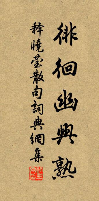 詩詞名句歷史字典書法欣賞書法字典國語詞典說文解字康熙字典古漢語字典標 題 作 者 詩 句 句作者:釋曉瑩 朝代:宋代句原文徘徊幽興熟。詩詞問答問:句的作者是誰?答:釋曉瑩問:句寫於哪個朝代?答:宋代釋曉瑩句書法欣賞句書法作品詩詞推薦賦得蜀都褚亮〔唐代〕列宿光參井,分芒跨梁岷。沉犀對江浦,駟馬入城闉。英圖多霸跡,歷選有名臣。連騎簪纓滿,含章詞賦新。得上走筆送義興令趙宣輔徐鉉〔唐代〕聞君孤棹泛荊谿,隴首雲隨別恨飛。杜牧舊居憑買取,他年藜杖願同歸。送夏侯秀才李中〔唐代〕江村搖落暮蟬鳴,執手臨岐動別情。古岸相看殘照在,片帆難駐好風生。牽吟一路逢山色,醒睡長汀對月明。況是石瓮寺儲光羲〔唐代〕遙山起真宇,西向盡花林。下見宮殿小,上看廊廡深。苑花落池水,天語聞松音。君子又知我,焚香期化心。紅岩感懷四首白玉蟾〔宋代〕草青兮煙冷,山蒼蒼兮水楚楚。山深兮地僻,青鳥不來兮悽苦。斷煙兮芒草。挽意一徐樞二首劉克莊〔宋代〕長公宿草幾番春,猶幸天留一潁濱。士欲捧盤定盟主,上看折檻記忠臣。翟門昔有張羅嘆,徐墓今無掛劍人。夫子效張文潛雪體蘇泂〔宋代〕布衾如鐵衣生角,學道終宵免醉昏。兒女呻吟惟有睡,老人獨自起開門。自笑鄭剛中〔宋代〕他人將錢買田園,尚患生才不神遠。我今貸錢買僻書,方且貪多懷不足。較量緩急堪倒置,安得瓶中有儲粟。自笑正宮醉太平鍾嗣成〔元代〕風流貧最好,村沙富難交。拾灰泥補砌了舊磚窯,開一個教乞兒市學。裹一頂半新不舊烏紗帽,穿一領半長不短黃韓子華石淙莊蘇軾〔宋代〕絳侯百萬兵,尚畏書牘背。功名意不已,數與危機會。我公抱絕識,凜凜鎮橫潰。欲收伊呂跡,遠與巢由對。誓言八月十七日,復登望海樓,自和前篇,是日榜蘇軾〔宋代〕亂山遮曉擁千層,睡美初涼撼不*。昨夜酒行君屢嘆,定知歸夢到吳興。偈頌一百二十三首釋崇岳〔宋代〕 * ,悟個什麽。咄咄咄,驪珠擊碎蒼龍窟。張耆年教授置酒官舍環碧散步上園煎桃花茶曾幾〔宋代〕何許清尊對物華,廣文官舍似僧家。向人只合供談笑,領客猶能辦咄嗟。光動杯盤環碧水,香隨珠履上園花。公如對月懷秉文趙蕃〔宋代〕有此佳風月,溪上更復奇。山陰應接際,赤壁誦歌時。恨子不同載,寫懷聊作詩。平生三五夕,咫尺又乖期。次韻樂著作送酒蘇軾〔宋代〕少年多病怯杯觴,老去方知此味長。萬斛羈愁都似雪,一壺春酒若為湯。次韻樂著作天慶觀醮濁世紛紛肯下臨,夢中秋夜洞庭圓月姚合〔唐代〕素月閒秋景,騷人泛洞庭。滄波正澄霽,涼葉未飄零。練彩凝葭菼,霜容靜杳冥。曉棲河畔鶴,宵映渚邊螢。圓彩楚妃嘆五首曹勛〔宋代〕日晚章華翠輦歸,寂寥深院鎖重扉。非緣掩鼻移恩寵,自是新人巧用機。饒娥廟祀神歌馬廷鸞〔宋代〕自我天覆,雲之油油。大田多稼兮,屯膏是憂。雄虹朝隮兮,雌霓夕虬。觸石兮通氣,雷車兮電幟。雨甚至兮,神渡江雲(壽婦人集曲名)陳夢協〔宋代〕瑞雲濃,縹緲弦月當庭,天香滿院。玉女傳言,把真珠簾卷。擁鵲橋仙,引江城子,醉蓬萊宴。吹紫玉簫,唱黃金哭季長陸游〔宋代〕我荷鋤時君賜環,君歸我復造清班,無由促席暫握手,每得寄聲聊解顏。造物不令成老伴,著書猶喜在名山。半年名句推薦風雨梨花寒食過,幾家墳上子孫來?高啟《送陳秀才還沙上省墓》 三冬暫就儒生學,千耦還從父老耕。陸游《觀村童戲溪上》 世間無限丹青手,一片傷心畫不成。高蟾《金陵晚望》 古之為政,愛人為大戴聖《禮記·哀公問》 凍風時作,作則飛沙走礫。袁宏道《滿井遊記》 憑闌半日獨無言,依舊竹聲新月似當年。李煜《虞美人·風回小院庭蕪綠》 人生百年有幾,念良辰美景,休放虛過。元好問《驟雨打新荷》 還作一段相思,冷波葉舞愁紅,送人雙槳。吳文英《解蹀躞·醉雲又兼醒雨》 浩氣清英,仙材卓犖,下土難分別丘處機《無俗念·靈虛宮梨花詞》 持而盈之,不如其已。揣而銳之,不可長保。金玉滿堂,莫之能守。富貴而驕,自遺其咎。功成身退,天之道。老子《老子·道經·第九章》