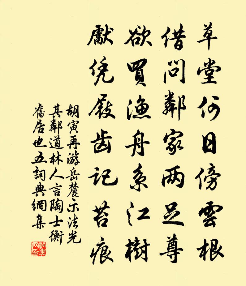 詩詞名句歷史字典書法欣賞書法字典國語詞典說文解字康熙字典古漢語字典標 題 作 者 詩 句 再游嶽麓示法光其鄰道林人言陶士衡舊居也五作者:胡寅 朝代:宋代原文草堂何日傍雲根,借問鄰家兩足尊。欲買漁舟系江樹,先憑屐齒記苔痕。詩詞問答問:《再游嶽麓示法光其鄰道林人言陶士衡舊居也五》的作者是誰?答:胡寅問:該詩寫於哪個朝代?答:宋代書法欣賞再游嶽麓示法光其鄰道林人言陶士衡舊居也五書法作品詩文賞析【原題】:再游嶽麓示法光其鄰道林人言陶士衡舊居也五絕詩詞推薦福山寺危固〔宋代〕覆船山色翠峨峨,栽石藏雲不厭多。達理禪師超彼岸,莫疑身外有風波。桃花菊朱翌〔宋代〕菊花忽作桃花面,放眼難看九月黃。花不見桃惟見菊,又將紅雨學啼妝。夜飲元稹〔唐代〕燈火隔簾明,竹梢風雨聲。詩篇隨意贈,杯酒越巡行。漫唱江朝曲,閒征藥草名。莫辭終夜飲,朝起又營營。讀林去華居厚主簿省題五邁〔宋代〕病夫夜不眠,五鼓始交睫。懶起比吳蠶,清夢飛莊蝶。恭承高軒過,不及倒屣接。惠我百篇詩,珠璣何煒燁。五言十二月三日對月王冕〔元代〕今夜初生月,客中仍獨看。遙憐吾老幼,未解脫饑寒。破壁簞瓢壘,疏梅霜雪團。再思先子訓,默默淚闌乾。偈頌一百一十七首釋紹曇〔宋代〕善護菩提樹有年,金枝玉葉蔭兒孫。大功難紀人間世,千佛名書補處尊。菩薩蠻陳義〔宋代〕去年共飲菖蒲酒。今年卻向僧房守。好事更多磨。教人沒奈何。主人恩義重。知我心頭痛。待要賞新荷。爭知疾愈將為鄞江之游先寄正仲三首舒岳祥〔宋代〕相思不在遠,道地一來難。殘月中峰見,疏星半夜看。江湖青草遠,風雨小窗寒。鄞水饒魚米,何由得共餐。寶岩寺姚愈〔宋代〕浮圖插雲表,列嶂環古剎。平湖眇澄波,萬態天光發。我來陟層巔,秀氣助毫末。扁舟返明月,萬頃玻璃滑。明道親享先農十首佚名〔宋代〕將躬黛耜,先陟靈壇。嘉玉量幣,樂光禮殫。神既至止,福亦和安。千斯積詠,萬國多嘆。導引佚名〔宋代〕重親萬壽,八帙衍新元。禮典備文孫。溫溫和氣迎長日,寶冊煥瑤琨。徽音顯號自堯門。德行已該存。更期昌算齊挽趙秋曉張登辰〔宋代〕自古名而壽,宗臣罕有之。嘗陵終落魄,賀白不期頤。天涸璇源派,霜摧玉樹枝。遊魂歸故國,忍見黍離離。楊叔武北堂夜話蔡襄〔宋代〕歲晏物景薄,層陰向晚饒。輕雲隱微月,殘雪棲枯條。夫君有高適,顧我慰寂寥。瀟灑開北堂,拂榻延良宵。前幾唐律寄呈父鳳山提舉十首汪元量〔宋代〕愁來不可更禁當,望鬼門關斷盡腸。無處告訴只欲死,有時顛倒忽成狂。三湘風雨失舟檝,萬里路岐多雪霜。遙憶寒夜施肩吾〔唐代〕三復招隱吟,不知寒夜深。看看西來月,移到青天心。投徐運使趙蕃〔宋代〕白社多年井逕荒,有孫還復以詩昌。此懷願識亦已久,茲日能識亦已久,茲日能來豈所望。萸後菊前霜錯落,地長浪花王宷〔宋代〕一江秋水浸寒空,漁笛無端弄晚風。萬里波心誰折得?夕陽影里碎殘紅。龍潭太室一筍穿入露滿其上因賦之樓鑰〔宋代〕一筍入屋照座寒,凌晨仍有清露漙。益信露珠自根起,正如真水朝泥丸。廈屋不應為汝穿,不肯屈節斜倚欄。乾霄偈頌三十首釋印肅〔宋代〕打折達磨西來腳,莫令有誤本來人。當處得心非向背,九年面壁寂光明。庭中立雪憨痴漢,海裹口乾渴愛津。如今送三八弟歸九江王遂〔宋代〕弟從尋陽來,四閱槐庭夏。謹重子所優,淑艾吾猶寡。拜官京洛裹,歸思康廬下。學力要日新,聖言當具寫。名句推薦雪暗凋旗畫,風多雜鼓聲。楊炯《從軍行》 凡學之道,嚴師為難。戴聖《禮記·學記》 岸容待臘將舒柳,山意沖寒欲放梅。杜甫《小至》 菊花信待重陽久,桂子香聞上界留。慧霖《閏中秋玩月》 唯天下至誠,為能盡其性;能盡其性,則能盡人之性。子思《中庸·第二十二章》 君不見,黃河之水天上來,奔流到海不復回。李白《將進酒》 夜來城外一尺雪,曉駕炭車輾冰轍。白居易《賣炭翁》 何處秋風至?蕭蕭送雁群。劉禹錫《秋風引》 北國風光,千里冰封,萬里雪飄。 * 《沁園春·雪》 立身之道何窮,只得一敬字,便事事皆整。王永彬《圍爐夜話·第一六三則》