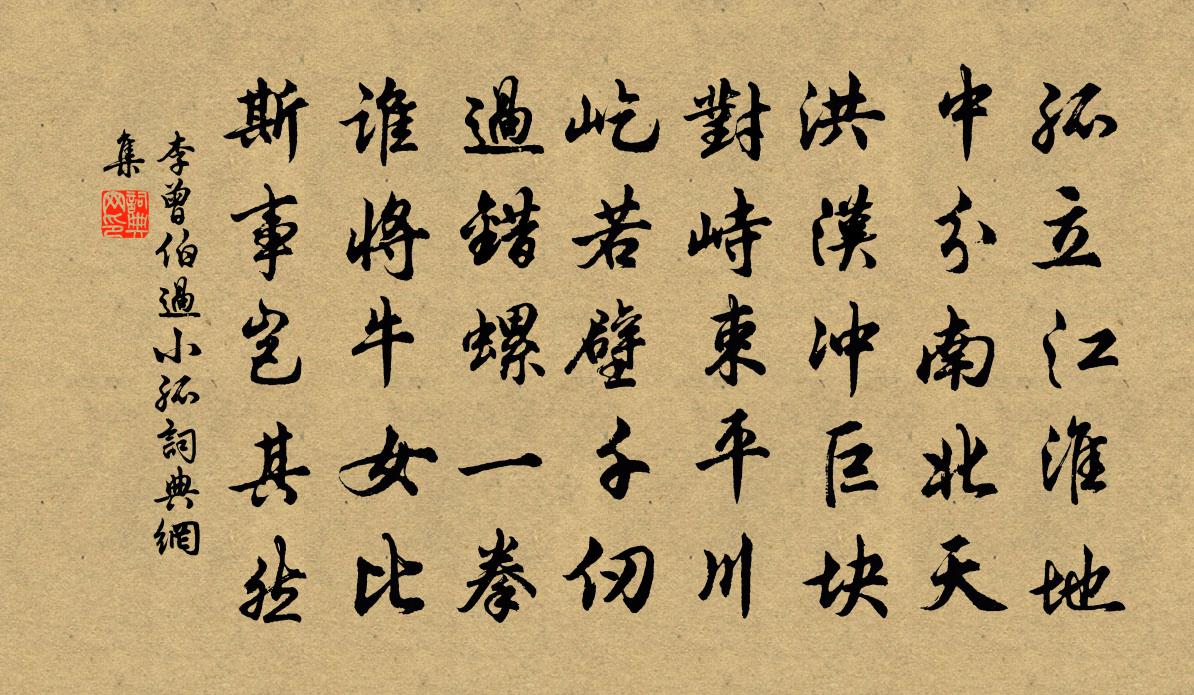 詩詞名句歷史字典書法欣賞書法字典國語詞典說文解字康熙字典古漢語字典標 題 作 者 詩 句 過小孤作者:李曾伯 朝代:宋代過小孤原文孤立江淮地,中分南北天。洪漢沖巨塊,對峙束平川。屹若壁千仞,過錯螺一拳。誰將牛女比,斯事豈其然。詩詞問答問:過小孤的作者是誰?答:李曾伯問:過小孤寫於哪個朝代?答:宋代李曾伯過小孤書法欣賞過小孤書法作品詩詞推薦晨興劉子翬〔宋代〕晨興訪蕭寺,爽氣清如沐。坐看雨離山,飛陰斷平陸。歸途阻夕漲,佇立驚幽獨。曳杖聽殘鍾,卻寄僧坊宿。謁慈恩寺題奘法師房李治〔唐代〕停軒觀福殿,游目眺皇畿。 * 含日轉,花蓋接雲飛。翠煙香綺閣,丹霞光寶衣。幡虹遙 * ,定水迥分暉。蕭然無夢令馬鈺〔元代〕信步如同雲水。看遍秦川入水。不似棟樑間,萬派逆留神水。神水。神水。便是山侗真水。贈易數朱俊甫胡仲弓〔宋代〕三絕韋編及太玄,潛虛象數究先天。前人推算空勞力,不似而今賣得錢。禪人並化主寫真求贊釋正覺〔宋代〕視之其夷,聽之曰希。真聲真色,何是何非。春山潤而雲起,秋水澄而月歸。見聞斷痕而外分變化,功勳轉處而內寄萍鄉唐稟正字齊己〔唐代〕新書聲價滿皇都,高臥林中更起無。春興酒香薰肺腑,夜吟雲氣濕髭鬚。同登水閣僧皆別,共上漁船鶴亦孤。長憶送程給事知越州元絳〔宋代〕四十年來出處同,交情偏見歲寒中。相先各上 * ,斗在俱為白髮翁。萬里厭勞方稍稍,一麾乘興又怱怱。清風望早日朱慶餘〔唐代〕窗下聞雞後,蒼茫映遠林。才分天地色,便禁虎狼心。是處程塗遠,何山洞府深。此時堪佇望,萬象豁塵襟。雜劇·楚昭王疏者下佚名〔元代〕第一折(沖末扮吳王領卒子上,詩云)太伯當年曾遜避,至今子姓居吳地。延陵何事慕高風,幾使孤家不承繼。某鷓鴣天·祖國沉淪感不秋瑾〔清代〕祖國沉淪感不禁,閒來海外覓知音。金甌已缺總須補,為國犧牲敢惜身!嗟險阻,嘆飄零。關山萬里作雄行。休言胡笳曲王貞白〔唐代〕隴底悲笳引,隴頭鳴北風。一輪霜月落,萬里塞天空。戍卒淚應盡,胡兒哭未終。爭教班定遠,不念玉關中。伊州歌王維〔唐代〕清風明月苦相思,盪子從戎十載餘。征人去日殷勤囑,歸雁來時數附書。梁鞞舞歌 明之君 一沈約〔南北朝〕七梁七百始。天監三元初。聖功澄宇縣。帝德總車書。熙熙億兆臣。其志皆歡愉。聞勸農二使渡江訪胡丞隱居夏竦〔宋代〕宅臨殷羨投書渚,門擁維摩問疾人。詔使艤舟應訪道,雨花交影隔西津。水調歌頭 慶壽周權〔元代〕天上有仙客,家世說南州。精神炯炯秋水,胸次納青丘。帶取括蒼風月,來聽蓬萊環佩,笑閱幾春秋。袖有如椽筆臨江仙牧常晁〔元代〕服氣咽精吞七耀,存思想化三車。飛罡*水散名花。詞章勤奏達,吟詠酌流霞。外事何乾於內境。有為功力何賒。次韻賦海棠胡仲弓〔宋代〕萬樹嫣紅壓錦城,此花宜雨又宜晴。睡中銀燭層層照,醉後朱唇暈暈輕。攜酒獨來蘇學士,逸詩笑殺杜先生。雪兒重幸武功李世民〔唐代〕代馬依朔吹,驚禽愁昔叢。況茲承眷德,懷舊感深衷。積善忻餘慶,暢武悅成功。垂衣天下治,端拱車書同。白水感遇之十四陳子昂〔唐代〕臨歧泣世道。天命良悠悠。昔日殷王子。玉馬遂朝周。寶鼎淪伊谷。瑤台成古丘。西山傷遺老。東陵有故侯。和毅齋喜雪何夢桂〔宋代〕阿滕試手下祥霙,散入郊原一尺盈。春近園林先富貴,夜深天地更分明。懶隨柳絮夸安石,浪入梅花妒廣平。明日名句推薦莫驚鷗鷺,四橋儘是,老子經行處。蘇軾《青玉案·送伯固歸吳中》 多少六朝興廢事,盡入漁樵閒話。張昪《離亭燕·一帶江山如畫》 重鑄鋤犁作斤,姑舂婦擔去輪官,輸官不足歸賣屋。元稹《田家詞 / 田家行》 家童掃蘿徑,昨與故人期。錢起《谷口書齋寄楊補闕》 一身轉戰三千里,一劍曾當百萬師。王維《老將行》 天上若無修月戶,桂枝撐損向西輪。米芾《中秋登樓望月》 君子恥不修,不恥見污。荀子《荀子·非十二子》 長安大雪天,鳥雀難相覓。張孜《雪詩》 一壺酒,一竿身,快活如儂有幾人。李煜《漁父·浪花有意千里雪》 池塘生春草,園柳變鳴禽。謝靈運《登池上樓》
