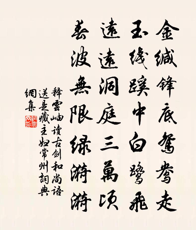 詩詞名句歷史字典書法欣賞書法字典國語詞典說文解字康熙字典古漢語字典標 題 作 者 詩 句 讀古劍和尚語送是藏主婦常州作者:釋雲岫 朝代:宋代原文金緘鋒底鴛鴦走,玉線蹊中白鷺飛。遠遠洞庭三萬頃,春波無限綠漪漪。詩詞問答問:《讀古劍和尚語送是藏主婦常州》的作者是誰?答:釋雲岫問:該詩寫於哪個朝代?答:宋代書法欣賞讀古劍和尚語送是藏主婦常州書法作品詩詞推薦九鎖山路口王宗賢〔宋代〕九鎖山深隱洞天,一峰柱聳現雲巔。從茲可達棲真境,透入青霄會眾仙。頌石頭和尚草庵歌釋印肅〔宋代〕結草為庵莫生退,百鳥銜花也不來。花開還被風吹落,不得春風花不開。明日重九亦以病不赴述古會再用前韻蘇軾〔宋代〕月入秋帷病枕涼,霜飛夜簟故衾香。可憐吹帽狂司馬,空對親舂老孟光。不作雍容傾座上,翻成骯髒倚門旁。人間蘭江常均〔宋代〕波翻雪浪養雲濤,亭壓蘭江意氣高。楚國興亡何處問,佩蘭人去有離騷。送省己上人歸太原周賀〔唐代〕惜別聽邊漏,窗燈落燼重。寒僧回絕塞,夕雪下窮冬。出定聞殘角,休兵見壞鋒。何年更來此,老卻倚階松。醉中懷眉山舊遊陸游〔宋代〕勁酒少和氣,哀歌無歡情。故鄉不敢思,登高望錦城。錦城那得去,髣佛蟆頤路。遙知尊前人,指我題詩處。我雖即席次必強六絕句李新〔宋代〕且倚東風拚酒酣,莫將食口配春蠶。還家更有無窮興,曲水飄香滿舍南。句沈樞〔宋代〕沽酒頻留客,圍棋不計功。和天休舍人奉祠太一宮見寄宋祁〔宋代〕順祝齋琳館,翛然隔世埃。空歌靈鵠下,祠節寶雞來。瑞木千尋竦,仙圖幾卷開。如無清夜唱,誰識帝車回。頌古九首釋普信〔宋代〕收來輥去事方圓,獨許漁郎上鉤船。明月蘆花同一色,落霞孤鶩共遙天。奉和堯夫強至〔宋代〕固窮終不悔沉淪,滿腹深藏上古珍。手寫新詩成幾卷,亦教餘事照千春。目眚六言一首劉克莊〔宋代〕暮年因耽黃卷,雙瞳不省盲如。來生願為蒼頡,四目造鳥跡書。山中玩物雜言十首戴表元〔宋代〕燕是孝義鳥,常棲孝義家。堂檐白日暖,上下靜無嘩。以此托軀羽,禍福審不差。誰雲知數歷,俗士義之夸。金處士歌楊維楨〔元代〕蘇州古隱君,實始虞仲,隱居放言,中乎清與權。次曰澹臺氏,言不枝,行不徑,未嘗匐走諸侯前。五噫之夫,將靖安縣幽谷亭曾鞏〔宋代〕橫江舍輕楫,對面見青山。行盡車馬塵,豁見水石寰。地氣方以潔,崖聲落潺潺。雖為千家縣,正在清華間。風煙江南秋日殷文圭〔唐代〕水國由來稱道情,野人經此頓神清。一篷秋雨睡初起,半硯冷雲吟未成。青笠漁兒筒釣沒,蒨衣菱女畫橈輕。冰綃句吳璋〔宋代〕始訝長郊從此斷,忽驚行客近前來。送蘇祠部通判洪州余靖〔宋代〕天家頓綱極詳延,果見鴻風頌得賢。庭拜外官聊試治,史分新策入編年。江淹賦筆雖傷別,郭泰歸舟只恐仙。南國將赴黔州先寄本府中丞李頻〔唐代〕八月瞿塘到底翻,孤舟上得已銷魂。幕中職罷猶趨府,闕下官成未謝恩。丹嶂聳空無過鳥,青林覆水有垂猿。感知黃朝散輓詩朱長文〔唐代〕江湖嘗佩左符歸,一臥漳濱素願違。平日華旌過里巷,此時丹旐下岩扉。群峰拱揖開新穴,萬木森羅條舊圍。佇看名句推薦觸簾風送景陽鍾,鴛被繡花重。顧敻《虞美人·觸簾風送景陽鍾》 一苦一樂相磨練,練極而成福者,其福始久洪應明《菜根譚·概論》 薄倖郎君何日到,想自當初,莫要相逢好。施耐庵《蝶戀花·一別家山音信杳》 六出飛花入戶時,坐看青竹變瓊枝。高駢《對雪》 吹燈窗更明,月照一天雪。袁枚《十二月十五夜》 一寸相思千萬緒。人間沒個安排處。李冠《蝶戀花·春暮》 君子以同道為朋,小人以同利為朋脫脫《宋史·列傳·卷七十八》 憶昨車聲寒易水,今朝,慷慨還過豫讓橋。陳維崧《南鄉子·邢州道上作》 其持之有故,其言之成理。荀子《荀子·非十二子》 秋鬢含霜白,衰顏倚酒紅。尹式《別宋常侍》