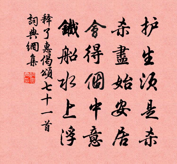 詩詞名句歷史字典書法欣賞書法字典國語詞典說文解字康熙字典古漢語字典標 題 作 者 詩 句 偈頌七十一首作者:釋了惠 朝代:宋代偈頌七十一首原文護生須是殺,殺盡始安居。會得箇中意,鐵船水上浮。詩詞問答問:偈頌七十一首的作者是誰?答:釋了惠問:偈頌七十一首寫於哪個朝代?答:宋代釋了惠偈頌七十一首書法欣賞偈頌七十一首書法作品詩詞推薦菩薩蠻陳三聘〔宋代〕楊花滿院飛紅索。春光不似人情薄。樓閣斷霞明。梨花開晚晴。玉虬香散後。扶困三杯酒。不是聽思歸。歸心思此見諸君感事之作陳杰〔宋代〕鼎湖不挾宇宙去,驪墓曾包山海來。教兒倒育阿房賦,一與張陽洗七哀。送僧惠本李復〔宋代〕山僧青芒屩,厭踏城中土。水風寒蕭蕭,片影過沙渡。晚雲迎歸錫,低飛暗石路。暮鍾落前峰,去沖後山雨。泰靈園書事蔡襄〔宋代〕上元天仗款琳房,靈圃遙傳玉殿香。要識年年桃李色,不關春力是恩光。夏夜陸游〔宋代〕我昔在南鄭,夜過東駱谷,平川月如霜,萬馬皆露宿。思從六月師,關輔談笑復。那知二十年,秋風枯苜蓿!聞德壽皇帝慶七十曾豐〔宋代〕堯壽元非啜雉羹,秦皇漢武卻營營。有心去采三山藥,何似歸休一日兵。宋江三十六贊龔開〔宋代〕鷙禽雄長,惟鵰最狡。毋撲天飛,封狐在草。正見寺曉別生公溫庭筠〔唐代〕清曉盥秋水,高窗留夕陰。初陽到古寺,宿鳥起寒林。香火有良願,宦名非素心。靈山緣未絕,他日重來尋。小築晁公溯〔宋代〕小築何年隱,巾車得再臨。竹陰覆地薄,樹影入池深。雲日清暉動,山林暮景侵。南枝棲未穩,接支有來禽。題畫扇王安石〔宋代〕玉斧修成寶月團,月邊仍有女乘鸞。青冥風露非人世,鬢亂釵斜特地寒。後九首劉克莊〔宋代〕默默回光反照,津津勿藥有喜。八荒入吾闥中,四海在我牆裡。挽江西宋漕三首廖行之〔宋代〕蚤歲才名畫省郎,會紆玉節惠三湘。哀矜折獄人無怨,訪問垂心慮最長。不便幽潛遺陋巷,更新文物萃書堂。期公承天寺尋勤上人釋圓悟〔宋代〕古寺多陳跡,幽花只自開。淨無秋後暑,遠絕市中埃。苔色侵碑石,松陰蔽月台。山人遲未至,欲去重徘徊。胡無人陸游〔宋代〕須如蝟毛磔,面如紫石棱。丈夫出門無萬里,風雲之會立可乘。追奔露宿青海月,奪城夜蹋黃河冰。鐵衣度磧雨颯公壽送蒲萄以酒答之二首李石〔宋代〕一宿逡巡為酒忙,暗泉傾乳聽糟床。南隣無物酬佳伴,依舊岩花釀蜜香。春光好·天初暖歐陽炯〔唐代〕天初暖,日初長,好春光。萬匯此時皆得意,競芬芳。筍迸苔錢嫩綠,花偎雪塢濃香。誰把金絲裁剪卻,掛斜陽?送馬仲途司諫使北梅堯臣〔宋代〕每逆龍鱗司諫諍,又持旄節使陰山。貂裘不見風霜勁,雁磧遙知道路艱。冰膾芥齏非楚味,玉苕蘭茁說燕顏。單于秋懷三十六首邵雍〔宋代〕塞鴻猶未來,梁燕已辭去。雲山千萬重,相逢在何處。岌{上山下業}都城門,繚繞長亭路。風土敗人衣,才新又贈嗣直弟頌十首黃庭堅〔宋代〕萬里唯將我,回觀更有誰。初無卓錐地,今日更無錐。東行別矴齋張舜民〔宋代〕宴坐豈不好,有誰強爾行。山川不改色,兒女各為情。岸隔霜林意,齋空夜水聲。虛傳少陵叟,一室過平生。名句推薦微雨過,小荷翻。榴花開欲然。蘇軾《阮郎歸·初夏》 太平之世多長壽人。王充《論衡·卷一·氣壽篇》 錦江春色來天地,玉壘浮雲變古今。杜甫《登樓》 口之宣言也,善敗於是乎興左丘明《國語·周語·邵公諫厲王弭謗》 玉門山嶂幾千重,山北山南總是烽。王昌齡《從軍行七首》 滿堂唯有燭花紅,歌且從容,杯且從容。辛棄疾《一剪梅·中秋元月》 閒倚博山長嘆,淚流沾皓腕。韋莊《歸國遙·春欲晚》 二月春花厭落梅。仙源歸路碧桃催。渭城絲雨勸離杯。晏幾道《浣溪沙·二月春花厭落梅》 聰以知遠,明以察微。司馬遷《史記·五帝本紀》 臣子恨,何時滅!駕長車,踏破賀蘭山缺。岳飛《滿江紅·寫懷》