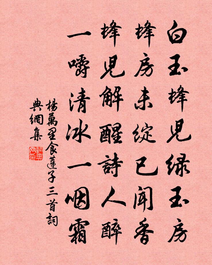 詩詞名句歷史字典書法欣賞書法字典國語詞典說文解字康熙字典古漢語字典標 題 作 者 詩 句 食蓮子三首作者:楊萬里 朝代:宋代食蓮子三首原文白玉蜂兒綠玉房,蜂房未綻已聞香。蜂兒解醒詩人醉,一嚼清冰一咽霜。詩詞問答問:食蓮子三首的作者是誰?答:楊萬里問:食蓮子三首寫於哪個朝代?答:宋代問:楊萬里的名句有哪些?答:楊萬里名句大全楊萬里食蓮子三首書法欣賞食蓮子三首書法作品詩詞推薦胡邦衡端明用癸巳舊韻寵賜佳篇輒續貂為不一周必大〔宋代〕閏六還同載誕辰,壽川方至浩無津。位虛左轄民瞻舊,職視西樞睿眷新。玉果又沾湯餅客,銀環仍進雪膚人。風流寄朱昌叔王安石〔宋代〕清江漫漫繞城流,尚憶城邊系小舟。射虎未能隨李廣,割雞空欲戲言游。雲埋塞路驚塵合,霜入春風滿鬢愁。此日酬人偈釋宗振〔宋代〕我有一機,直下示伊。青天霹靂,電卷星馳。德山臨濟,棒喝徒施。不傳之妙,於汝何虧。念奴嬌辛棄疾〔宋代〕少年握槊,氣憑陵、酒聖詩豪餘事。縮手旁觀初未識,兩兩三三而已。變化須臾,鷗飛石鏡,鵲抵星橋□。搗殘秋送宋朝散知彭州迎侍二親蘇軾〔宋代〕東來誰迎使君車,知是丈人屋上烏。丈人今年二毛初,登樓上馬不用扶。使君負弩為前驅,蜀人不復談相如。老幼送環洲先羅憲卿艾性夫〔宋代〕馬耳蕭蕭雪擁裘,亂山南下是處州。自從天地生吟骨,何處江山無腳頭。空有夢隨東野去,可無言送子長游。白雲魏王堤白居易〔唐代〕花寒懶發鳥慵啼,信馬閒行到日西。何處未春先有思,柳條無力魏王堤。開諸方語釋心月〔宋代〕收拾殘花貼故枝,游蜂舞蝶謾紛飛。莫教嗅著無香處,懡?還從舊路歸。紀夢陳藻〔宋代〕自從弱冠為遊子,玉融丹井壺山市。喔詩不用著工夫,已謫牂牁四千里。柳侯未五十,羅池作刺史。翰苑失詞華,夢訪劉漫堂曾雪巢二先生樂雷發〔宋代〕前輩風流歇,江湖欠賞音。向期行古道,誰解識余心。月浸金壇冷,雲歸玉笥深。瀟湘風雨夜,空得夢相尋。渡江師嚴〔宋代〕鹿門山人滄浪客,灑淚憶枯眼見骨。風塵崢嶸萬里空,不知何處營三窟。城中性命湯火近,路窮援斷無訊息。鼠竊武陵春(陳逢時置酒賓宴堂,仍攜愛姬。晚值雨作。見示佳詞,輒次韻)李光〔宋代〕漠漠春陰人似霧,那用繡簾垂。不道持杯是阿誰。須拚倒金罍。人世渾知天上月,離合比盈虧。冒雨須來帶雨歸。□字頌黃庭堅〔宋代〕齋余睡兀兀,占盡檐前日。不與一甌茶,眼前黑如漆。兵間有歌舞者仇遠〔宋代〕邊城未定苦無謀,年少金多絕不憂。野戰已酣紅帕首,塗歌猶醉錦纏頭。蛾貪銀燭那知死,月戀金尊不照愁。亦欲天池觀文殊燈周必大〔宋代〕代馬腥膻暗五台,南方世界且徘徊。一燈別是真知識,不用奔波學善財。滿庭芳(酬徐守)洪适〔宋代〕風攪花間,雨慳柳下,人人懶拂愁眉。年荒省事,投轄井中稀。架上舞衣塵積,弦索斷、箏雁差池。南柯夢,轉頭大雲寺茶詩呂岩〔唐代〕玉蕊一槍稱絕品,僧家造法極功夫。兔毛甌淺香雲白,蝦眼湯翻細浪俱。斷送睡魔離幾席,增添清氣入肌膚。幽叢猴牛尾狸圖方回〔宋代〕宣城牛尾雪天狸,梅老才涎為賦詩。曾與沐猴戲相得,脂膏爭奈獵人知。偈頌一百五十首釋心月〔宋代〕二千年前,靈山付囑品。二千年後,吳地流通分。丁元珍輓詞二首曾鞏〔宋代〕翰墨金聲遠,神情玉氣溫。節廉貧愈見,風義老彌惇。舊學資詳正,新儀屬討論。誰憐一麾出,終不反修門。名句推薦寒鴉飛數點,流水繞孤村。楊廣《失題》 殘月出門時,美人和淚辭。韋莊《菩薩蠻·紅樓別夜堪惆悵》 中秋月。月到中秋偏皎潔。徐有貞《中秋月·中秋月》 長恨春歸無覓處,不知轉入此中來。白居易《大林寺桃花》 一道鵲橋橫渺渺,千聲玉佩過玲玲。徐凝《七夕》 城中桃李愁風雨,春在溪頭薺菜花。辛棄疾《鷓鴣天·陌上柔桑破嫩芽》 載酒買花年少事,渾不似,舊心情。盧祖皋《江城子·畫樓簾暮卷新晴》 何時更杯酒,再得論心胸。李白《魏郡別蘇明府因北游》 惟將終夜常開眼,報答平生未展眉。元稹《遣悲懷三首·其三》 正護月雲輕,嫩冰猶薄。辛棄疾《瑞鶴仙·賦梅》