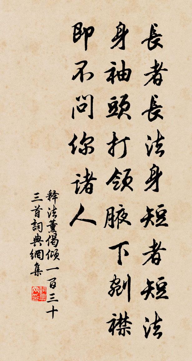 詩詞名句歷史字典書法欣賞書法字典國語詞典說文解字康熙字典古漢語字典標 題 作 者 詩 句 偈傾一百三十三首作者:釋法薰 朝代:宋代偈傾一百三十三首原文長者長法身,短者短法身。袖頭打領,腋下剜襟,即不問你諸人。詩詞問答問:偈傾一百三十三首的作者是誰?答:釋法薰問:偈傾一百三十三首寫於哪個朝代?答:宋代釋法薰偈傾一百三十三首書法欣賞偈傾一百三十三首書法作品詩詞推薦【雙調】阿納忽佚名〔元代〕雙鳳頭金釵,一虎口羅鞋,天然海棠顏色,宜唱那阿納忽修來。 人立在廳階,馬控在瑤台。嬌滴滴玉人扶策,乙丑中秋與山僧數輩自虎邱靈岩泛太湖登洞庭史堯弼〔宋代〕七十二山湖面橫,橫斜出沒亂青冥。只疑亦有鈞天奏,驚起魚龍舞洞庭。瑞鷓鴣 寄華清道眾馬鈺〔元代〕環牆圍合洞中天。瑞氣祥光愈接連。白鹿懷中常穩坐,青牛背上得閒眠。驪山不到經三載,華岳相違近四年。霞友懷歸自訟曹勛〔宋代〕讀書老不入,屢讀屢遺忘。遇事欲強記,轉首輙怊悵。以此趨事為,豈但成嘲謗。人豈不自知,去矣殆天放。漁父吳鎮〔元代〕殘陽浦里漾漁船。青草湖中欲暮天。看白鳥,下平川。點破瀟湘萬里入山三首孔武仲〔宋代〕路出西林興倍長,輕衫短蓋入秋陽。層崖蔽日多清影,深谷迷人有異香。訪古不辭穿絕磴,參禪直為遍諸方。此身首夏泛天池詩蕭衍〔南北朝〕薄游朱明節。泛漾天淵池。舟楫互容與。藻苹相推移。碧沚紅菡萏。白沙青漣漪。新波拂舊石。殘花落故枝。葉軟同皇甫侍御題薦福寺一公房李嘉祐〔唐代〕虛室獨焚香,林空靜磬長。閒窺數竿竹,老在一繩床。啜茗翻真偈,然燈繼夕陽。人歸遠相送,步履出迴廊。雨師雷神七首佚名〔宋代〕陰旄載旋,鼓車其鞭。間神安歸,冥然而天。皇有正命,祀事孔蠲。其臨其歸,億萬斯年。寄育王東生和尚釋雲岫〔宋代〕三十餘年無故人,只留雲外伴間身。夜來夢入宸奎閣,戶牖重開見日輪。中{左山右尋}先塋劉克莊〔宋代〕昔遇重華席屢前,因排貴近去翩然。叩墀袖有馳球疏,易簀囊無沐槨錢。當日傳家惟諫草,至今贍族賴祠田。原頭桃村寄題三首錢時〔宋代〕春入桃村爛漫紅,紛紛來覓武陵蹤。武陵不在千山外,只在先生一笑中。挽袁潔齋侍郎三首劉宰〔宋代〕講學元無倦,繙書老更勤。能令神氣王,直互死生分。玉折經綸具,星垂翰墨勛。淒其知已地,灑淚濕寒雲。送羅正之年兄出使二浙張舜民〔宋代〕玉麈助清談,金貂飾高位。二物已殺身,無剝生民利。君為使者官,猶作農夫事。隨軒載畚插,一心惟度地。惟梁滴翠軒馬亮〔宋代〕高閣登臨暑氣空,綠槐蟬噪咽清風。我今到此須懷感,多少行人道路中。聞館客病侵曉得小馬亟歸周南〔宋代〕濛濛露氣白,耿耿東方明。馬捉步猶碎,烏營食又鳴。倏過黃峴嶺,遙見闔閭城。欲問兒曹懶,前虞祿命輕。致爽軒劉焞〔宋代〕團團竹色繞郊居,勾引清風百畝余。憶昔敲門蘇內翰,而今下馬范中書。弟著作宰南陵梅堯臣〔宋代〕新買紫騮馬,欲歸清弋江。去彈琴雁獨,來認舄鳧雙。橐實收盈篚,濃醅熟滿缸。弟兄相憶否,風燭舊西窗。讀張碧集孟郊〔唐代〕天寶太白歿,六義已消歇。大哉國風本,喪而王澤竭。先生今復生,斯文信難缺。下筆證興亡,陳詞備風骨。高秋驀山溪(西湖十詠·花港觀魚)陳允平〔宋代〕春波浮淥,小隱桃溪路。煙雨正林塘,翠不礙、錦鱗來去。芹香藻膩,偏愛鯉花肥,檐影下,柳陰中,逐浪吹萍絮名句推薦鳥啼官路靜,花發毀垣空。張繼《清明日自西午橋至瓜岩村有懷》 畫船捶鼓催君去。高樓把酒留君住。舒亶《菩薩蠻·畫船捶鼓催君去》 無恆產而有恆心者,惟士為能。孟子《孟子·梁惠王章句上·第八節》 飛雪過江來,船在赤欄橋側。呂渭老《好事近·飛雪過江來》 馬思邊草拳毛動,雕眄青雲睡眼開。劉禹錫《始聞秋風》 無情不似多情苦。一寸還成千萬縷。晏殊《玉樓春·春恨》 只因一著錯,滿盤俱是空。馮夢龍《醒世恆言·卷八》 幸於始者怠於終,繕其辭者嗜其利。曹雪芹《紅樓夢·第五十六回》 故園渺何處,歸思方悠哉。韋應物《聞雁》 長安一片月,萬戶搗衣聲。李白《子夜吳歌·秋歌》