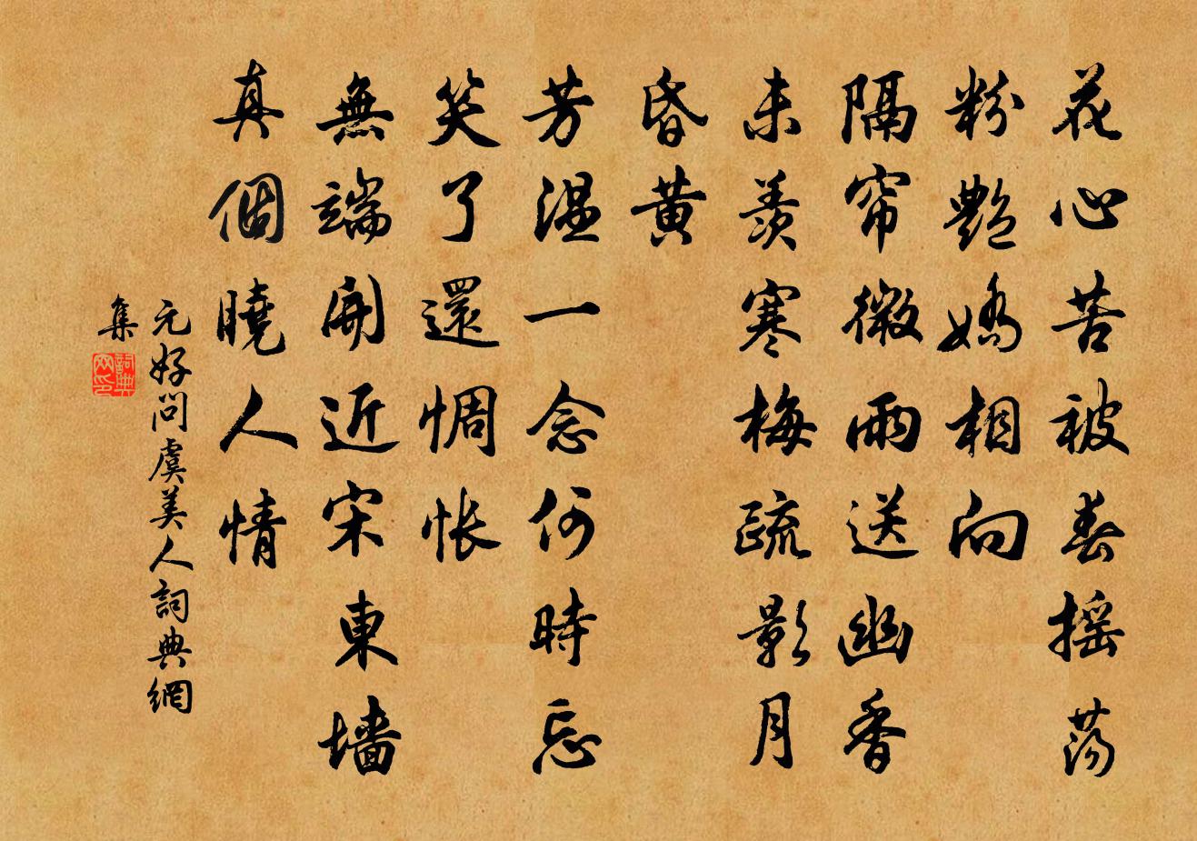 詩詞名句歷史字典書法欣賞書法字典國語詞典說文解字康熙字典古漢語字典標 題 作 者 詩 句 虞美人作者:元好問 朝代:金代虞美人原文花心苦被春搖盪。粉艷嬌相向。隔簾微雨送幽香。未羨寒梅,疏影月昏黃。芳溫一念何時忘。笑了還惆悵。無端開近宋東牆。,真箇曉人,情詩詞問答問:虞美人的作者是誰?答:元好問問:虞美人寫於哪個朝代?答:金代問:虞美人是什麼體裁?答:詞問:元好問的名句有哪些?答:元好問名句大全元好問虞美人書法欣賞虞美人書法作品詩詞推薦送前進士蔡京赴學究科(時崔相公、楊尚書掌選)劉禹錫〔唐代〕耳聞戰鼓帶經鋤,振發聲名自里閭。已是世間能賦客,更攻窗下絕編書。朱門達者誰能識,絳帳書生盡不如。幸遇枕上偶成在首杜范〔宋代〕老夫屢與死為鄰,急報家人早入京。正慮舟行流未滑,枕前快聽瀉檐聲。鷓鴣天竊杯女子〔宋代〕燈火樓台處處新。笑攜郎手御街行。回頭忽聽傳呼急,不覺鴛鴦兩處分。天表近,帝恩榮。瓊漿飲罷臉生春。歸來從孫元忠乞貓蔡肇〔宋代〕廚廩空虛鼠亦飢,終宵咬齧近秋帷。腐儒生計惟黃卷,乞取銜蟬與獲持。送王處士游蜀齊己〔唐代〕又掛寒帆向錦川,木蘭舟里過殘年。自修奼奼爐中物,擬作飄飄水上仙。三峽浪喧明月夜,萬州山到夕陽天。來年贈慶別駕謝應芳〔元代〕台州別駕不之官,煙水孤村共歲寒。偶有濁醪留晚酌,旋挑生菜簇春盤。三年鄰里通家好,四海兵戈行路難。且喜伊川令(寄外)花仲胤妻〔宋代〕西風昨夜穿簾幕。閨院添消索。最是梧桐零落。迤邐秋光過卻。人情音信難托。魚雁成耽閣。教奴獨自守空房,淚斗百花晁補之〔宋代〕斜日東風深院。繡幕低迷歸燕。瀟灑小屏嬌面,仿佛燈前初見。與選筵中,銀盆半拆姚黃,插向鳳凰釵畔。微笑遮次韻韓毅伯病瘧王炎〔宋代〕胸襟玉氣吐長虹,扶老猶須藥物功。示病維摩非實相,戲人瘧鬼助文窮。筆頭排悶詩千首,瓮面消愁酒一中。無悶幽居雜興三首白玉蟾〔宋代〕月來佐酒如隨牒,花自從詩各寄名。盡把煙霞歸節制,閒中排日聽泉聲。劉方平壁畫山皇甫冉〔唐代〕墨妙無前,性生筆先。回溪已失,遠嶂猶連。側徑樵客,長林野煙。青峰之外,何處雲天。和留宰賞荼蘼二絕王炎〔宋代〕得酒衰懷亦滿觴,不禁花氣逼人香。醒時忍見風吹盡,玉質溫柔是故鄉。鐘山番人窟曾極〔宋代〕千群鐵騎遠來侵,鑿穴鐘山用意深。天塹連空遮不斷,煙塵直到海中心。九日三首宋白〔宋代〕霜冷風清九月九,茱萸 * 家園有。何時玉殿接千官,稱觴共進南山壽。再和項安世〔宋代〕文命生輕癸甲,祖龍死惑燕齊。矗矗秦山易識,茫茫禹穴難稽。酒中十詠酒樽皮日休〔唐代〕犧樽一何古,我抱期幽客。少恐消醍醐,滿擬烘琥珀。猿窺曾撲瀉,鳥蹋經欹仄。度度醒來看,皆如死生隔。愚石歌何夢桂〔宋代〕大埠初分生怪石,曾與不周山作骨。山崩地缺天柱摧,片石耆姿轉奇崛。媧皇鍊石補天工,化作五星成五色。地下晚出田間汪炎昶〔宋代〕疑有沮溺輩,耦耕尚依依。倘遂一晤晤,足慰千載思。散策靡所值,田間步委蛇。草露問棕屐,荇風淒葛衣。遙宛朝中措曾覿〔宋代〕西湖南北舊遊空。誰料一尊同。回首四年間事,渾如飛絮濛濛。林花謝了,明年春到,依舊芳容。惟有朱顏綠鬢,挽陳師復寺丞二首劉克莊〔宋代〕歲晚滄洲築草堂,卻將逢掖換軒裳。市朝共嘆鳳高翥,世俗或疑麟不祥。童子舉扶猶忼慨,門人要絰各淒涼。衰殘名句推薦古剎疏鍾度,遙嵐破月懸。李賀《南園十三首》 一往情深深幾許?深山夕照深秋雨。納蘭性德《蝶戀花·出塞》 沫餑,湯之華也。華之薄者曰沫,厚者曰餑,輕細者曰花陸羽《茶經·五之煮》 野店垂楊步,荒祠苦竹叢。范成大《寒食郊行書事》 放眼暮江千頃,中有離愁萬斛,無處落征鴻。楊炎正《水調歌頭·把酒對斜日》 暮從碧山下,山月隨人歸。李白《下終南山過斛斯山人宿置酒》 止凡人之斗鬩,則堯舜之道,不如寡妻之誨諭。顏之推《顏氏家訓·序致篇》 山色遙連秦樹晚,砧聲近報漢宮秋。韓翃《同題仙遊觀》 壯歲旌旗擁萬夫,錦襜突騎渡江初。辛棄疾《鷓鴣天·有客慨然談功名因追念少年時事戲作》 上有愁思婦,悲嘆有餘哀。曹植《明月上高樓》