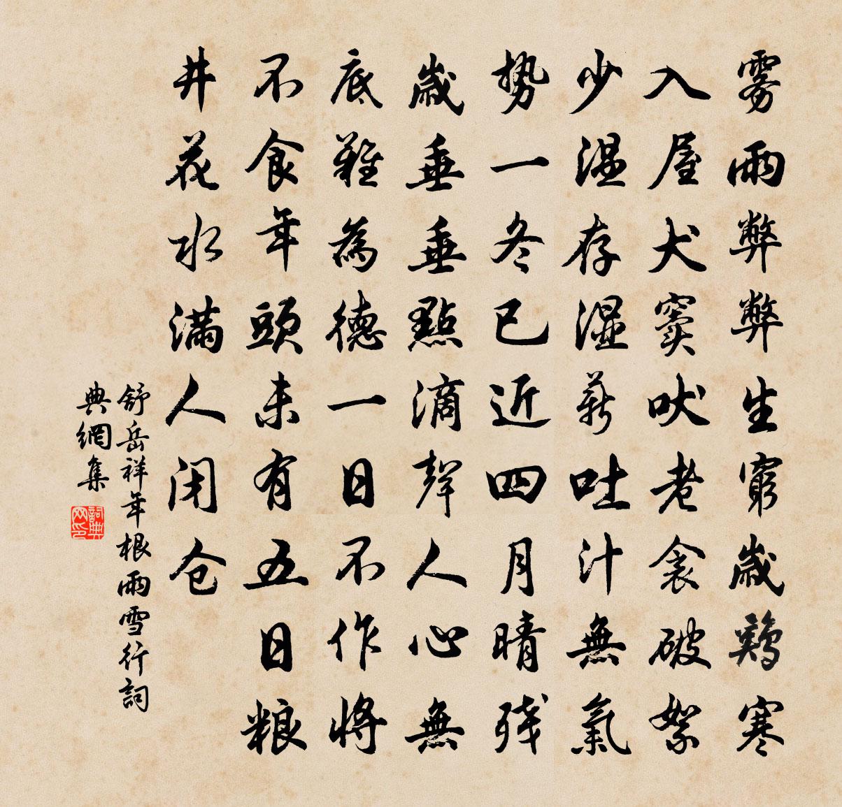 詩詞名句歷史字典書法欣賞書法字典國語詞典說文解字康熙字典古漢語字典標 題 作 者 詩 句 年根雨雪行作者:舒岳祥 朝代:宋代年根雨雪行原文霧雨弊弊生窮歲,雞寒入屋犬竇吠。老衾破絮少溫存,濕薪吐汁無氣勢。一冬已近四月晴,殘歲垂垂點滴聲。人心無底難為德,一日不作將不食。年頭未有五日糧,井花水滿人閉倉。詩詞問答問:年根雨雪行的作者是誰?答:舒岳祥問:年根雨雪行寫於哪個朝代?答:宋代舒岳祥年根雨雪行書法欣賞年根雨雪行書法作品詩詞推薦鄭僉判取蘇黃門圖史園囿文章鼓吹之語為韻見方岳〔宋代〕我觀眾草樹,等是氣所囿。蓬茅一何荒,桃李一何秀。榮悴固不齊,受命了無繆。所以山中人,翩然拂歸袖。丁寧偈頌二十二首釋道生〔宋代〕弋陽溪上諸檀越,勇猛精進難比況。年年歲歲入山來,總是如來親眷屬。如來法身等虛空,隨彼願心而顯發。譬如憂旱章甫〔宋代〕貧賤甘羈旅,淹留賴薄田。悠悠將送老,比比不逢年。旱魃工為虐,雷公豈易鞭。醉能忘萬事,安得酒如川。錢塘聞子規艾性夫〔宋代〕汴水淒涼已百年,長因啼鳥一潸然。天津橋上無人聽,尚喜錢塘有杜鵑。明發茅田見鷺有感楊萬里〔宋代〕自嘆平生老道塗,不堪泥雨又驅車。鷺鶿第一清高底,拂曉溪中有乾無。老景陸游〔宋代〕老死知無日,天公偶見寬。疾行逾百步,健啖每三餐。身瘦短裁褐,發稀低作冠。年來更小黠,不據伏波鞍。渭河道中 其四王冕〔元代〕海氣團雲白,江風吹浪寒。飛鴻離塞遠,獨鶴唳更闌。慷慨論時事,羈棲笑楚冠。蕭蕭黃葉下,回首望長安。殊不惡齋秋晚閒吟五絕范成大〔宋代〕就食遷居蟻墳壤,隨風作舍蛛裊絲。百年何處用三窟,萬事信緣安一枝。待青城道人不至陸游〔宋代〕我亦從來薄世緣,偶然採藥到西川。慵追萬里騎鯨客,且伴千年化鶴僊。金鼎養丹暾海日,玉壺取酒醉江天。朝來九日登望仙台呈劉明府容崔曙〔唐代〕漢文皇帝有高台,此日登臨曙色開。三晉雲山皆北向,二陵風雨自東來。關門令尹誰能識,河上仙翁去不回。且欲宿隆平精舍文同〔宋代〕萬木羅青蓋,雙峰敞翠屏。風埃愁客路,鐘鼓喜禪扃。下馬穿蒙密,隨僧入杳冥。俗襟如見濯,試為瀉銅瓶。甲戌冬屬疾賜告二首宋庠〔宋代〕恩告偃衡蓽,年華飛琯灰。右眠安佛脅,深息養仙胎。數犯稽違禁,誰憐濩落材。使軺均病粟,更自囅然咍。過姑蔑道中陳舉愷〔宋代〕姑蔑古城暮,山川近不同。草黃秋過雨,樹暗晚生風。流水中分郭,飛橋下應虹。未須追往事,回首送冥鴻。唐孝子張常洧義台苗昌言〔宋代〕義台屹立尚千秋,褒詔曾宣李鄴侯。古碣不教蒼蘚蝕,高原惟見夕陽流。耕夫鋤自將芝護,野客衣還伴鶴游。一樣鳳鳴洞史唐卿〔宋代〕何年雷斧鑿山裂,千尺蒼崖瀉飛雪。孤鳳一去聲不聞,海水桑田幾興滅。我知仙去仙當存,時見真形坐岩穴。青天和致政太師潞國文公賜燕玉津園感恩述懷王珪〔唐代〕玉符初解自逍遙,暫駕安車近九霄。無限高名齊少室,不言休績在三朝。好披雲氅呼遼鶴,忽把仙巾換漢貂。御苑古風·其十九李白〔唐代〕西上蓮花山,迢迢見明星。(西上 一作:西嶽)素手把芙蓉,虛步躡太清。霓裳曳廣帶,飄拂升天行。邀我登雲夢中亦役役戴復古〔宋代〕半夜群動息,五更百夢殘。天雞啼一聲,萬枕不遑安。一日一百刻,能得幾刻閒。當其閒睡時,作夢更多端。窮者和劉春卿曉起讀書王之道〔宋代〕夢斷幽禽恰轉更,窺窗殘月淡孤燈。孜孜讀誦如吾子,指日菁莪看錫朋。別耶溪諸叔趙湘〔唐代〕又散耶溪會,斜陽在古原。出門逢落葉,去路有啼猿。短髮不堪照,新詩誰與論。如何為遠別,風雪宿孤村。名句推薦貧賤之知不可忘,糟糠之妻不下堂。范曄《後漢書·列傳·伏侯宋蔡馮趙牟韋列傳》 搖盪春風媚春日,念爾零落逐風飈,徒有霜華無霜質。鮑照《梅花落·中庭多雜樹》 己所不欲,勿施於人。孔子弟子《論語·顏淵篇》 有眼不識泰山。施耐庵《水滸傳·第二回》 但恨處非位,愴悢使心傷。阮籍《詠懷八十二首·其七十九》 玉樹歌殘王氣終,景陽兵合戍樓空。許渾《金陵懷古》 唯有門前鏡湖水,春風不改舊時波。賀知章《回鄉偶書二首》 悲霜雪之俱下兮,聽潮水之相擊。屈原《九章》 聞說東風亦多情,被竹外、香留住。史達祖《留春令·詠梅花》 玲瓏骰子安紅豆,入骨相思知不知。溫庭筠《南歌子詞二首 / 新添聲楊柳枝詞》