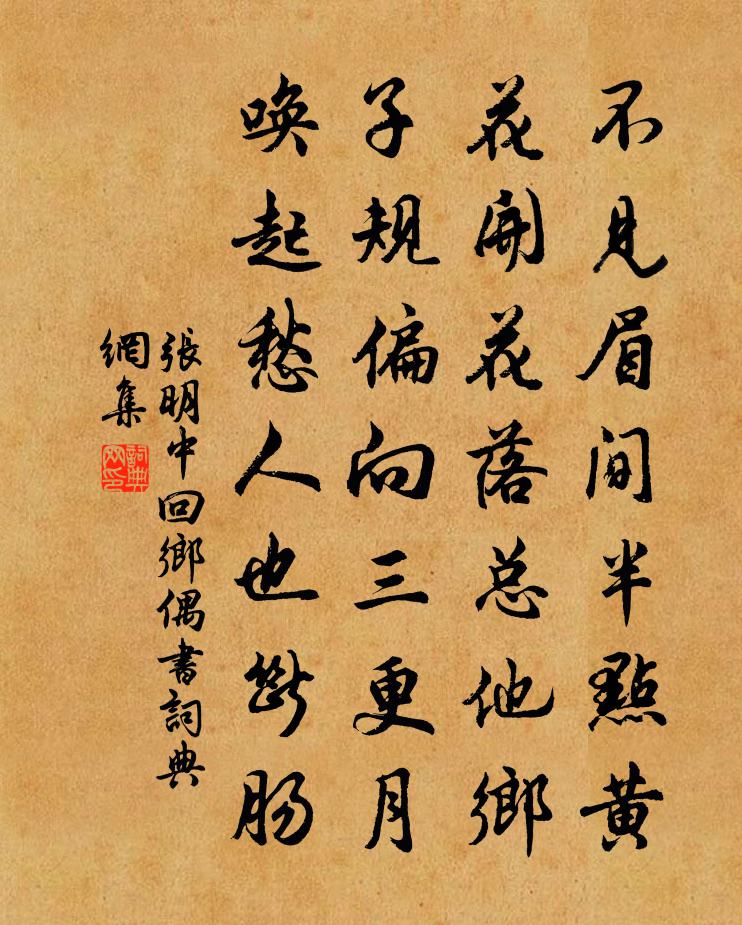 詩詞名句歷史字典書法欣賞書法字典國語詞典說文解字康熙字典古漢語字典標 題 作 者 詩 句 回鄉偶書作者:張明中 朝代:宋代回鄉偶書原文不見眉間半點黃,花開花落總他鄉,子規偏向三更月,喚起愁人也斷腸。詩詞問答問:回鄉偶書的作者是誰?答:張明中問:回鄉偶書寫於哪個朝代?答:宋代張明中回鄉偶書書法欣賞回鄉偶書書法作品詩詞推薦臨江仙·一番荷芰生池沼尹鶚〔唐代〕一番荷芰生池沼,檻前風送馨香。昔年於此伴蕭娘。相偎佇立,牽惹敘衷腸。時逞笑容無限態,還如菡萏爭芳。別邸報京丞相薨背姜特立〔宋代〕丞相今朝薨相位,衣冠贈典一番新。作場好夢歸鄉去,仰羨無非夢裡人。宿江上王鎡〔宋代〕茫茫海樹遠生煙,推過篷窗對月眠。半夜櫓聲搖夢醒,趁潮多有渡江船。漁父舞史浩〔宋代〕不是神仙那得到。萬頃澄波舞鏡鸞,千尋疊嶂環旌蠶。光天圓玉夜長清,襯地濕紅朝不掃。賓主相逢欲盡歡,昇平思親五首謝枋得〔宋代〕九十萱親天下稀,教兒只誦白華詩。溪冰山玉人無愧,百拜慈闈喜可知。石竹花齊己〔唐代〕石竹花開照庭石,紅蘚自稟離宮色。一枝兩枝初笑風,猩猩血潑低低叢。常嗟世眼無真鑒,卻被丹青苦相陷。誰為送李侍御福建從事馬戴〔唐代〕晉安來越國,蔓草故宮迷。釣渚龍應在,琴台鶴亂棲。泛濤明月廣,邊海眾山齊。賓府通蘭棹,蠻僧接石梯。片雲覽古五首方回〔宋代〕賢者儻畏死,世論終不公。古若不置死,何藉誅妖凶。荊舒底奸鬼。廟食丘軻同。舉世知其非,囁嚅不敢攻。著書重陽阻雨魚玄機〔唐代〕滿庭 * 籬邊拆,兩朵芙蓉鏡里開。落帽台前風雨阻,不知何處醉金杯。鷓鴣天·楊柳東塘細水蔣春霖〔清代〕楊柳東塘細水流,紅窗睡起喚晴鳩。屏間山壓眉心翠,鏡里波生鬢角秋。 臨玉管,試瓊甌,醒時題恨醉時休。隔漢江寄子安魚玄機〔唐代〕江南江北愁望,相思相憶空吟。鴛鴦暖臥沙浦,鸂鶒閒飛橘林。煙里歌聲隱隱,渡頭月色沈沈。含情咫尺千里,況至日懷羅國賓仇遠〔宋代〕群陰剝盡一陽回,霜日烘晴宿霧開。閉戶讀書差自樂,載餚問字莫須來。榮枯易了觀芸草,冷暖相忘付酒杯。得似塞上逢故人王建〔唐代〕百戰一身在,相逢白髮生。何時得鄉信,每日算歸程。走馬登寒壟,驅羊入廢城。羌笳三兩曲,人醉海西營。送杜寺丞和永城李覯〔宋代〕薦表同時入,天衢自此通。弦歌新邑宰,清白舊家風。官舍隋河北,離觴華谷東。勖哉松柏操,咫尺是堯聰。題華山圖馬默〔宋代〕南山南面五千仞,瀑步飛來自山頂。真人言我昔曾登,爭奈今生都不省。華山北面始披圖,萬壑千峰一一殊。長記次韻葉秀實縣治環翠亭陳棣〔宋代〕合綴嚴宸玉筍班,尚勞小試簿書間。溟鯤未擊三千里,天驥終歸十二閒。望氣行看求利劍,知音當已識高山。逼人雲谷粹長老贊釋大觀〔宋代〕閒如雲,虛如吞。歲晚一庵,湖山千簇。師資相忘,古靈河必拊背。動靜無間,茶陵空自跌足。一味捲舌冥懷,付早發苦竹館李嶠〔唐代〕合沓岩嶂深,朦朧煙霧曉。荒阡下樵客,野猿驚山鳥。開門聽潺湲,入徑尋窈窕。棲鼯抱寒木,流螢飛暗筱。早霞唐修撰義問輓詞二首蘇轍〔宋代〕家風台柏老,遺直故依然。節見南遷後,神凝未瞑前。臨民舊有法,訓子適成篇。九轉今猶在,參同豈妄傳。次韻王彥昭感秋三首張耒〔宋代〕塵埃容易點吳衣,澤國秋來信息稀。想見淮南初木落,秋雲秋水雁初飛。名句推薦幾日喜春晴,幾夜愁春雨。高觀國《卜運算元·泛西湖坐間寅齋同賦》 悔既往之失,亦要防將來之非。洪應明《菜根譚·概論》 磧里征人三十萬,一時回向月明看。李益《從軍北征》 蘭葉春葳蕤,桂華秋皎潔。張九齡《感遇十二首·其一》 三思而後行。孔子弟子《論語·公冶長篇》 佯愛人,不得復憎也;佯憎人,不得復愛也。韓非及後人《韓非子·外儲說右下》 世事一場大夢,人生幾度秋涼?蘇軾《西江月·世事一場大夢》 夢繞邊城月,心飛故國樓。李白《太原早秋》 羅幕輕寒,燕子雙飛去。晏殊《蝶戀花·檻菊愁煙蘭泣露》 不可以身相得見如來。鳩摩羅什譯《金剛經·如理實見》