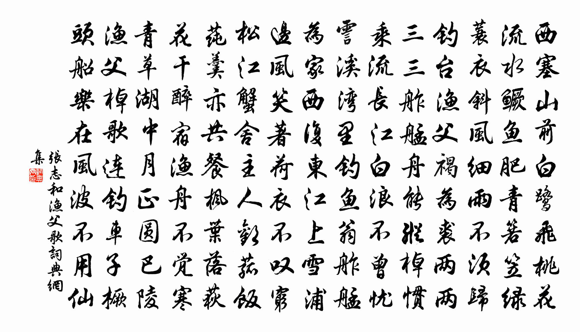 西塞山前白鷺飛,桃花流水鱖魚肥。青箬笠,綠蓑衣,