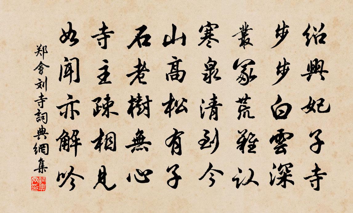 詩詞名句歷史字典書法欣賞書法字典國語詞典說文解字康熙字典古漢語字典標 題 作 者 詩 句 劉寺作者:鄭會 朝代:宋代劉寺原文紹興妃子寺,步步白雲深。叢冢荒難認,寒泉清到今。山高松有子,石老樹無心。寺主疎相見,如聞亦解吟。詩詞問答問:劉寺的作者是誰?答:鄭會問:劉寺寫於哪個朝代?答:宋代鄭會劉寺書法欣賞劉寺書法作品詩詞推薦道中即事釋紹嵩〔宋代〕饒水回迴轉,白雲西復東。日斜喧急雨,天闊退飛鴻。薄暮沿西峽,隆寒正北風。茲行有勝事,未敢嘆途窮。雲邊許月卿〔宋代〕雲邊人種麥,天際我歸舟。月色輕寒夜,笛聲何處樓。久晴人渴雨,倦仕我思休。高士傳閒看,東籬花正幽。次二十一兄韻晁沖之〔宋代〕憶在長安最少睥,酒酣到處一欣然。獵回漢苑秋高夜,飲罷秦台尋作天。不擬伊優陪殿下,相隨於蔿過樓前。如今夏初臨(婺州郡圃)曹冠〔宋代〕水榭風台,竹軒梅逕,雙溪新創名園。極目遐觀,碧岑斂散瑤煙。柳塘風皺清漣。爛紅雲、花島爭妍。艷妝佳麗,秋夜懷康節陳起〔宋代〕無眠輾轉聽更殘,心緒如絲起萬端。煎藥爐邊童夢曉,讀書檠下婦紉寒。狻猊斷火香猶婉,促織催秋袂怯單。願子歲暮雜感十首曾國藩〔清代〕紛紛節候盡平常,西舍東家底事忙?十二萬年都小劫,七千餘歲亦中殤。蜉蝣身世知何極,胡蝶夢魂又一場。少昊柳梢青(楊花)周晉〔宋代〕似霧中花,似風前雪,似雨餘雲。本自無情,點萍成綠,卻又多情。西湖南陌東城。甚管定、年年送春。薄倖東風偈六十三首釋道寧〔宋代〕問答尖新逞峻機,如將畫餅要充飢。縱經塵劫空勞力,爭似忘言合大虛。萬古碧潭空界月,再三揮摝始應知。次韻瀛倅鄧慎思見寄孔武仲〔宋代〕官是麟台卻佐州,蓬瀛俱稱列仙遊。憶分曉色趨天闕,想對春風倚郡樓。書付塞鴻應易到,人如隴水正分流。江湖偈頌一百二十三首釋祖欽〔宋代〕水綠山表,鵲噪鴉鳴。滿耳滿目,非色非聲。既非聲色,卻作麽生安名,大方廣佛華嚴經。郡守呂叔恭以甲戌季春七日游中隱岩山水膏肓呂願中〔宋代〕爽塏虛明小洞天,巉岩垂乳類鋒銛。薰風習習來三面,夏雨蕭蕭欠一檐。指顧群山勞應接,徘徊歸騎縱觀瞻。門前頌古十首釋慧空〔宋代〕臥龍才雷迅,猛虎便咆哮。時人只見波濤涌,不知新月出林梢。臨江仙 舟中梁寅〔元代〕十日江程春過半,渚青新長蘆芽。李花幾樹間桃花。嫩黃煙際柳,遠白水邊沙。老子老來心似水,肯教愁緒如麻。正蒙主文教授大著寵示佳章輒繼嚴韻仰酬盛意度正〔宋代〕珍重知音審五聲,也從紙上得張程。設科久矣何曾見,想像雙瞳萬古驚。閒居殷堯藩〔唐代〕茂苑閒居木石同,旋開小徑翦蒿蓬。虛游心在鴻濛外,穴處身疑培塿中。花影一闌吟夜月,松聲半榻臥秋風。百年寓事洪咨夔〔宋代〕飽鶩避弓橫渚,驚鱗透網平波。一段春光搖曳,幾雙靜眼摩挲。雜曲歌辭楊柳枝施肩吾〔唐代〕傷見路傍楊柳春,一枝折盡一重新。今年還折去年處,不送去年離別人。漢武出獵錢起〔唐代〕漢家無事樂時雍,羽獵年年出九重。玉帛不朝金闕路,旌旗長繞彩霞峰。且貪原獸輕黃屋,寧畏漁人犯白龍。薄暮河滿子晏幾道〔宋代〕對鏡偷勻玉箸,背人學寫銀鉤。系誰紅豆羅帶角,心情正著春遊。那日楊花陌上,多時杏子牆頭。眼底關山無奈,訪艮齋先生講學之所熊克〔宋代〕克齋從學艮齋地,溪友幸從詩友游。泉響如聞讀書韻,山容猶帶濟時憂。嗚呼道在人何在,籍甚名留跡不留。欲揖名句推薦汀洲無浪復無煙,楚客相思益渺然。劉長卿《自夏口至鸚鵡洲夕望岳陽寄源中丞》 寄語天涯客,輕寒底用愁。于謙《除夜太原寒甚》 長呼人,即代叫。人不在,己即到。李毓秀《弟子規·出則弟》 去年相送,餘杭門外,飛雪似楊花。蘇軾《少年游·潤州作》 理無常是,事無常非。列子及其弟子《列子·說符》 傷心故人去後,冷落新詩。晁沖之《漢宮春·梅》 寒山轉蒼翠,秋水日潺湲。王維《輞川閒居贈裴秀才迪》 零落江南不自由。兩綢繆。料得吟鸞夜夜愁。姜夔《憶王孫·番陽彭氏小樓作》 非知之難也,處知則難也。韓非及後人《韓非子·說難》 台在山腰,一峰突起,離水十餘丈。沈復《浮生六記·浪遊記快》