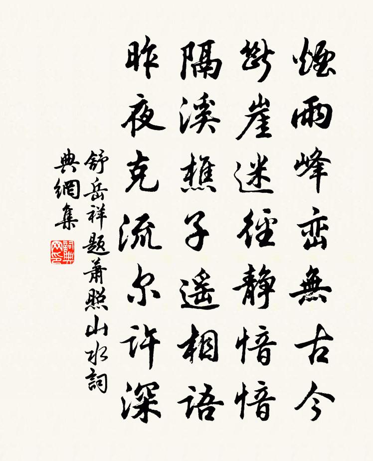 詩詞名句歷史字典書法欣賞書法字典國語詞典說文解字康熙字典古漢語字典標 題 作 者 詩 句 題蕭照山水作者:舒岳祥 朝代:宋代題蕭照山水原文煙雨峰巒無古今,斷崖迷徑靜愔愔。隔溪樵子遙相語,昨夜克流爾許深。詩詞問答問:題蕭照山水的作者是誰?答:舒岳祥問:題蕭照山水寫於哪個朝代?答:宋代舒岳祥題蕭照山水書法欣賞題蕭照山水書法作品詩詞推薦霜天曉角(夜飲武將家,有歌霜天曉角者,聲調淒婉,戲為賦之)韓元吉〔宋代〕幾聲殘角。月照梅花薄。花下有人同醉,風滿檻、波明閣。夜寂香透幕。酒深寒未著。莫把玉肌相映,愁花見、也入峽次巴東白居易〔唐代〕不知遠郡何時到,猶喜全家此去同。萬里王程三峽外,百年生計一舟中。巫山暮足沾花雨,隴水春多逆浪風。兩片臨江仙彭子翔〔宋代〕佛說波斯王此歲,衰顏羞見河流。翁今丹臉發光浮。毗盧金 * ,爛熳菊花秋。七個明朝方九日,年年稅在今朝。句黃景說〔宋代〕肯隨桃李鬭梳妝。微雨李商隱〔唐代〕初隨林靄動,稍共夜涼分。窗迥侵燈冷,庭虛近水聞。次韻劉後村所贈延慶主僧圭復翁詩三首陳著〔宋代〕古往今來幾過帆,天高地下一浮庵,與翁相見亦偶爾,一笑無言意自參。絕句陳師道〔宋代〕木搖電繞雷取龍,伏蛙號蚓溝瀆空。黑雲黃槐度白鳥,映日急雨回斜風。湖中曲李賀〔唐代〕長眉越沙采蘭若,桂葉水葒春漠漠。橫船醉眠白晝閒,渡口梅風歌扇薄。燕釵玉股照青渠,越王嬌郎小字書。蜀紙鑑湖晚歸張伯玉〔宋代〕會稽太守無事時,緩帶長作漁樵嬉。大航平榻引賓從,談笑晚從湖上歸。湖邊居望而簇簇,湖岸花木情依依。環峰又一絕邵雍〔宋代〕正當老輩過從日,況值高秋搖落天。一把黃花一樽酒,故人西去又經年。漁家傲毛滂〔宋代〕恰則小庵貪睡著。不知風撼梅花落。一點兒春吹去卻。香約略。黃蜂猶抱紅酥萼。繞遍寒枝添索寞。卻穿竹徑隨孤醉桃源呂渭老〔宋代〕檀香新染砑紅綾。腰肢瘦不勝。合歡小幌掩餘酲。芙蓉入夢頻。山不盡,水無情。錦河隔錦茵。劉郎仙骨未應輕。景德祀皇寺祗三首佚名〔宋代〕至哉厚德,陟配天長。沈潛剛克,廣大無疆。資生萬物,神化含章。同和八變,神靈郊祥。送李伯和吏部提舉浙東伯珍寺丞將漕夔門樓鑰〔宋代〕奕奕君家好弟兄,皇華交映棣華明。幾年並列金閨彥,同日俱持玉節行。萬里往臨夔子國,一江先到越王城。會聞逢道者神和子王轂〔唐代〕珍重神和子,聞名五十年。童顏終不改,綠髮尚依然。酒里消閒日,人間作散仙。長生如可慕,相逐隱林泉。酬賈學錄韻並送炭陳造〔宋代〕何人戴目倚錢神,更問吾徒拂甑塵。醉纈不供詩客眼,弊裘應廣文貧。坐看十日澠為雨,遙想千家桂作薪。貸子曲綠漪軒遇雨與任才仲定韻賦李若水〔宋代〕才到綠漪軒,逸興小寰宇。岸斜水自環,樹缺山為補。眼界萬象入,佳處難悉數。天公厭人閒,惱以催詩雨。涼飆紹興祀祚德廟八首佚名〔宋代〕以身吒孤,實惟死友。撫嫗長之,若父若母。潛授於韓,克興厥後。崇齋以獻,德侈報厚。鍾陵道中作陳陶〔唐代〕原隰經霜蕙草黃,塞鴻訊息怨流芳。秋山落照見麋鹿,南國異花開雪霜。煙火近通槃瓠俗,水雲深入武陵鄉。曾逢同道士錢泠然尋澗水源陳師道〔宋代〕曉領黃冠子,步尋東澗源。拖筇探清淺,垂手弄潺湲。岸閣殘花片,槎留舊漲痕。鳳潛丹穴邃,龍臥古潭渾。修竹名句推薦喚起一天明月,照我滿懷冰雪,浩蕩百川流。辛棄疾《水調歌頭·和馬叔度游月波樓》 唯願當歌對酒時,月光長照金樽里。李白《把酒問月·故人賈淳令予問之》 忽見陌頭楊柳色,悔教夫婿覓封侯。王昌齡《閨怨》 流星透疏木,走月逆行雲。賈島《宿山寺》 善政得民財,善教得民心。孟子《孟子·盡心章句上·第十四節》 孟夏草木長,繞屋樹扶疏。陶淵明《讀山海經·其一》 送君如昨日,檐前露已團。江淹《古離別》 言不信者行不果。墨子《墨子·02章 修身》 馬作的盧飛快,弓如霹靂弦驚。辛棄疾《破陣子·為陳同甫賦壯詞以寄之》 守恬淡以養道,處卑下以養德,去嗔怒以養性,薄滋味以養氣。陳繼儒《小窗幽記·集景篇》