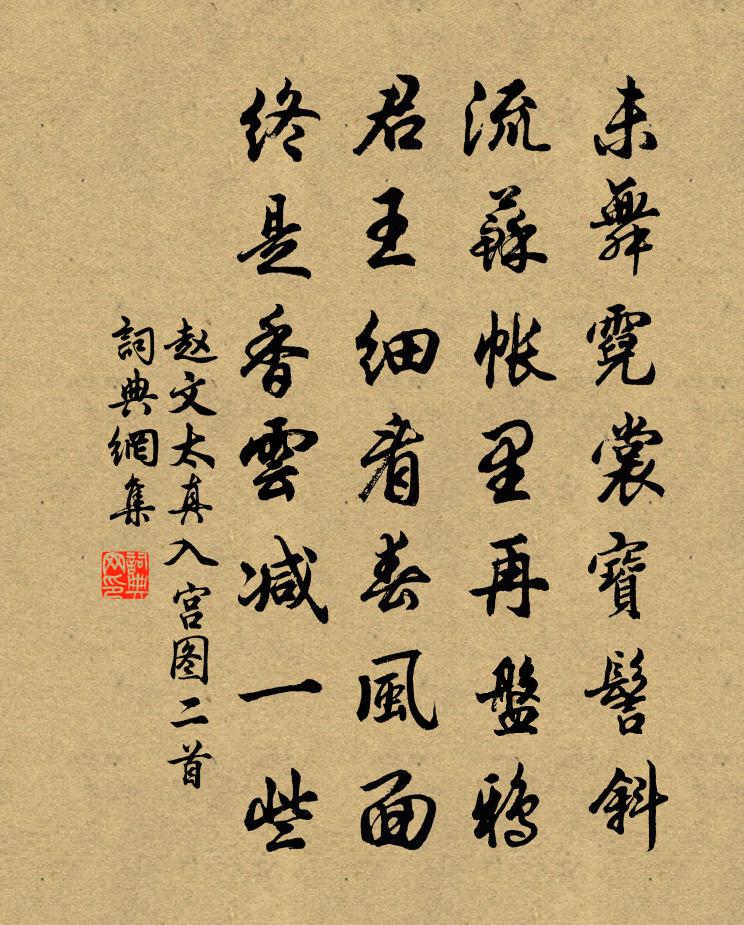 詩詞名句歷史字典書法欣賞書法字典國語詞典說文解字康熙字典古漢語字典標 題 作 者 詩 句 太真入宮圖二首作者:趙文 朝代:宋代太真入宮圖二首原文未舞霓裳寶髻斜,流蘇帳里再盤鴉。君王細看春風面,終是香雲減一些。詩詞問答問:太真入宮圖二首的作者是誰?答:趙文問:太真入宮圖二首寫於哪個朝代?答:宋代趙文太真入宮圖二首書法欣賞太真入宮圖二首書法作品詩詞推薦華陽觀桃花時招李六拾遺飲白居易〔唐代〕華陽觀里仙桃發,把酒看花心自知。爭忍開時不同醉,明朝後日即空枝。邵陽郡圃梅坡史彌寧〔宋代〕粲玉梢頭出小亭,忍寒索笑太清生。楚山活脫青屏樣,影得疏花分外明。送廣東潘帥移鎮湖南十口號曾豐〔宋代〕晉盜奔秦代勿追,碧油幢下晝陰移。虎符不下軍民去,閒殺摧鋒老健兒。題翠蛟亭鍾震〔宋代〕雙柱蒼寒倚碧天,六鰲駕海涌層巔。東風吹瀑成飛雨,知是潛蛟起晝眠。次韻陳勉仲二首王之道〔宋代〕十災窮愁鳥出籠,春來天意似通融,得書故舊頗相憫,上書朝廷應見容。開府莫辭金帛盡,犁庭當冀祲氛空。廟堂示眾法文釋印肅〔宋代〕礦去金存百練周,自從索價沒人酬。騰今耀古非聲色,曾為溈山作牯牛。身若浮雲心若風,居常不定在虛空。忽然句尤袤〔宋代〕萬室歡呼忘凍餒,一犁酥潤到根苗。鷓鴣天范成大〔宋代〕繡戶當年瑞氣充。紫陽駕鶴下天風。萬山秀色渾鍾盡,六月炎光一洗空。蕉葉滿,彩衣重。刻符持節盡人雄。坐中句謝枋得〔宋代〕要知今日謝枋得,便是當年許月卿。和湯倅梅花韻虞儔〔宋代〕玉奴端不負花期,乞得東皇一笑歸。淡掃娥眉憐虢國,半勻妝面妒徐妃。有情立馬留新恨,無賴啼禽送落暉。金鉉溪庵十首劉克莊〔宋代〕挾冊相從只一童,林間終日飽松風。小窗面野容山入,曲甽分溪與沼通。定有裔孫尋遠祖,盡教智叟笑愚翁。絕憐歲稔姜特立〔宋代〕今負稔熟收田禾,智慧型雞擔谷主人家。農人時節一醉飽,擨歈起舞相喧譁。題趙睎遠二畫樓鑰〔宋代〕窗前驚見一枝斜,照眼英英十數花。千載簡齊仙去後,何人更著好詩夸。第五弟豐獨在江左,近三四載寂無訊息,覓使寄此二首杜甫〔唐代〕亂後嗟吾在,羈棲見汝難。草黃騏驥病,沙晚鶺鴒寒。楚設關城險,吳吞水府寬。十年朝夕淚,衣袖不曾乾。聞汝汝州王學士射弓行李廌〔宋代〕汝陽使君如孫武,文章絕人喜軍旅。要知談笑能治兵,戲教紅妝樂營女。白氈新袍錦臂鞲,條脫掛弓腰白羽。彩錯頌古三十二首釋明辯〔宋代〕玉鞭才舉乾坤靜,皇道私無顯至尊。貴極鑾轝才指斥,將軍正令不容存。游金精山鄭會〔宋代〕春風棧閣曉雲寒,中有潺潺一玉灣。白石寨盤青石磴,蘚花猶帶漢時斑。下直沽王冕〔元代〕拍河健櫓比長驅,百尺飛帆下直沽。浩浩碧天秋氣肅,堂堂明月夜窗虛。旌旗兩岸蘆花影,鼙鼓三聲海浪趨。轉首瑤台第一層 吳大卿壽日王丹桂〔元代〕陰極陽升。當律應,黃鐘正嚴凝。昔年此際,素雲容裔,瑞氣清英。玉衡潛運轉,顯弧南、一曜增明。降仙卿,漸望江南張繼先〔宋代〕西源好,冬日雪中松。攜手石壇承愛景,靜觀天地入清宮。恰似大茅峰。襟袂冷,琴里意濃濃。吹月洞簫含碧玉,名句推薦千貫買田,萬貫結鄰。佚名《增廣賢文·下集》 朱顏空自改,向年年、芳意長新。韓縝《鳳簫吟·鎖離愁》 碧虛無雲風不起,山上長松山下水。劉禹錫《八月十五夜桃源玩月》 君子進則能益上之譽,而損下之憂戴聖《大戴禮記·曾子制言中第五十五》 今夜鄜州月,閨中只獨看。杜甫《月夜》 龜靈未免刳腸患,馬失應無折足憂。白居易《放言五首·其二》 弟妹蕭條各何在,干戈衰謝兩相催!杜甫《九日五首·其一》 江南自是離愁苦,況游驄古道,歸雁平沙。王沂孫《高陽台·和周草窗寄越中諸友韻》 生平未報國,留作忠魂補。楊繼盛《就義詩》 何處望神州?滿眼風光北固樓。辛棄疾《南鄉子·登京口北固亭有懷》