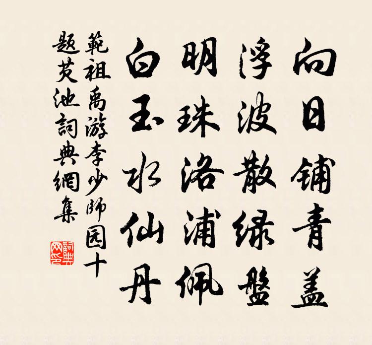 詩詞名句歷史字典書法欣賞書法字典國語詞典說文解字康熙字典古漢語字典標 題 作 者 詩 句 游李少師園十題芡池作者:范祖禹 朝代:宋代游李少師園十題芡池原文向日鋪青蓋,浮波散綠盤。明珠洛浦佩,白玉水仙丹。詩詞問答問:游李少師園十題芡池的作者是誰?答:范祖禹問:游李少師園十題芡池寫於哪個朝代?答:宋代范祖禹游李少師園十題芡池書法欣賞游李少師園十題芡池書法作品詩詞推薦題興善寺寂上人院鄭谷〔唐代〕客來風雨後,院靜似荒涼。罷講蛩離砌,思山葉滿廊。臘高興故疾,爐暖發余香。自說匡廬側,杉陰半石床。我欲張載〔宋代〕我欲庭前木葉疏,病枝衰蔓手披除。從今燕坐無通塞,來往風煙任卷舒。高齋晚望柴望〔宋代〕才是青山便卜鄰,世情那得較紛紜。露含遠岫分為雨,煙起人家去作雲。柳色晴光扶檻人,鶯聲人語隔窗聞。高齋奉和章冠之長蘆壁間韻趙善括〔宋代〕征帆來去方旁午,觸我扁舟維荻浦。疏林隱約響鐘魚,一葦可航參佛祖。西風留客意如勤,永日閒消一炷薰。詰朝牧童隱巒〔唐代〕牧童見人俱不識,盡著芒鞋戴箬笠。朝陽未出眾山晴,露滴蓑衣猶半濕。二月三月時,平原草初綠。三個五個騎羸日出入佚名〔兩漢〕日出入安窮?時世不與人同。故春非我春,夏非我夏,秋非我秋,冬非我冬。泊如四海之池,遍觀是邪謂何?吾知山居雜詩九十首曹勛〔宋代〕吾家遠城市,四圍縈疊嶂。意尋煙霞游,喜逐樵牧上。松間憩兩足,論高等四暢。或時戴月歸,山花記心想。北湖飽飯徑寢頹然甘甚殆疇昔所未有也作此以吳則禮〔宋代〕讀書聊爾只欲眠,半世浪比邊孝先。白頭來煮阿弓糜,偶然甘寢如許奇。醍醐乳無上味,方我飽眠方掩鼻。諸天種村居即事六言十首劉克莊〔宋代〕發脫禿鶖無異,背傴橐駝逼真。不是進賢冠者,亦非靈壽杖人。九疊劉克莊〔宋代〕和靖終身欠孟光,只留一鶴伴山房。唐人未識花高致,苦欲為渠聘海棠。客懷李燾〔宋代〕寂寞三秋節,淒涼萬里風。關河盡形勝,人物幾英雄。秦葉隨流水,周禾滿故宮。此心懸象闕,夢繞浙西東。秋懷十首陳師道〔宋代〕北闕書不上,南山田不歸。朝暮陳州門,悠悠此何為。我老何所為,暖日聊差池。君聽城上烏,啞啞端為誰。詠史下裴頠陳普〔宋代〕惠帝君臣一樣愚,九龍翁仲淚如珠。眼前喪亂渾如岡,崇有何當卻破無。過曹溪洪皓〔宋代〕半貢囚拘愧牧羊,生還四載地投荒。危機未履已如此,欲效前賢問上蒼。和子瞻玉盤盂二首蘇轍〔宋代〕千葉團團一尺余,揚州絕品舊應無。賞傳莒國遷鍾虡,移憶胡僧置缽盂。叢底留連傾鑿落,瓶中捧擁照浮屠。強將登樂遊原耿湋〔唐代〕園廟何年廢,登臨有故丘。孤村連日靜,多雨及霖休。常與秦山對,曾經漢主游。豈知千載後,萬事水東流。菩薩蠻趙長卿〔宋代〕隔江一帶春山好。平林新綠春光老。休去倚闌乾。飛紅不忍看。東流何處去。便是歸舟路。芳草外斜陽。行人更斷禪人並化主寫真求贊釋正覺〔宋代〕眉目炯炯,鬚髮蒼蒼。疏林霑野雪,古澗湛秋光。綿縫誰分梭路細,針關初透線芒長。鶴夢未曉,鳥行無章。平買蝶戀花(林鐘商)張先〔宋代〕臨水人家深宅院。階下殘花,門外斜陽岸。柳舞麴塵千萬線。青樓百尺臨天半。樓上東風春不淺。十二闌乾,盡日邁陂塘李治〔唐代〕雁雙雙,正分汾水,回頭生死殊路天長地久相思債,何似眼前俱去!摧勁羽,倘萬一幽冥,卻有重逢處詩翁感遇。名句推薦慎在於畏小;智在於治大尉繚《尉繚子·十二陵》 不是花中偏愛菊,此花開盡更無花。元稹《菊花》 繡嶺宮前鶴髮翁,猶唱開元太平曲李洞《繡嶺宮詞》 萬里赴戎機,關山度若飛佚名《木蘭詩/木蘭辭》 待浮花、浪蕊都盡,伴君幽獨。蘇軾《賀新郎·夏景》 處顛者危,勢豐者虧。王充《論衡·卷一·累害篇》 示上以足,示下以惠,怨自削減。來俊臣《羅織經·固榮卷第六》 撥雲尋古道,倚石聽流泉。李白《尋雍尊師隱居》 此已被私慾隔斷,不是知行的本體了。王陽明《傳習錄·卷上·徐愛錄》 放逐肯消亡國恨?歲時猶動楚人哀!查慎行《三閭祠》