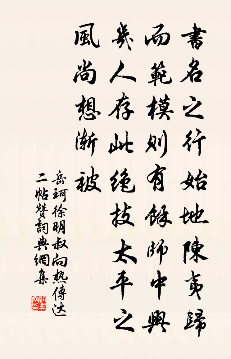 詩詞名句歷史字典書法欣賞書法字典國語詞典說文解字康熙字典古漢語字典標 題 作 者 詩 句 徐明叔向熱傳達二帖贊作者:岳珂 朝代:宋代徐明叔向熱傳達二帖贊原文書名之行,始地陳夷。歸而范模,則有餘師。中興幾人,存此絕技。太平之風,尚想漸被。詩詞問答問:徐明叔向熱傳達二帖贊的作者是誰?答:岳珂問:徐明叔向熱傳達二帖贊寫於哪個朝代?答:宋代岳珂徐明叔向熱傳達二帖贊書法欣賞徐明叔向熱傳達二帖贊書法作品詩詞推薦【雙調】沉醉東風關漢卿〔元代〕夜月青樓鳳簫,春風翠髻金翹。雨雲濃,心腸俏,俊龐兒玉軟香嬌。六幅湘裙一搦腰,間別來十分瘦了。寄友人方岳〔宋代〕面熟青山亦故人,霜逢肯負月粼粼。如聞行李且家住,未必梅花知路貧。薺老自堪供野飯,罾寒誰與膾溪鱗。商量偈頌一百二十三首釋普度〔宋代〕龍門萬仞,到者還稀。不犯清波,如何進步。明叔有語贈贛丞曾幼度次韻簡明叔並寄幼度為趙蕃〔宋代〕詩成要落天地間,太虛明月相往還。聲名或覺四海隘,身乃憔悴窮閉關。詩中妙理超生死,何但不以彼易此。我來贈貞固上人張祜〔唐代〕南國披僧籍,高標一道林。律儀精氈布,真行正吞針。掇火身潛起,焚香口旋吟。非論坐中社,余亦舊知音。踏雲行劉處玄〔元代〕聖道難逢,真修易遇。自然之理明今古。死生販骨幾千遭,這番了了無來去。蓬島仙鄉,亘靈無苦。朝元路上高真送李留後赴鎮天平蘇頌〔宋代〕出擁朱轓就鎮雄,須句封國濟亭東。乾旄光動奎躔外,閫節權並魯分中。兩綬鵰鷹紋異繡,半符魚虎佩兼銅。朝廷簡喻叔奇工部沈無隱寺簿張鎡〔宋代〕園居懶成癖,駕言何所之。出門無妨看好雪,粉地玉天相範圍。氣增坐車熱,旋換白鹿騎。不須攜古囊,詩句隨雪重湖夜月饒魯〔宋代〕昔聞放翁歌鏡湖,船毛有酒船頭書。又聞鑑湖賜賀老,剡川一曲春風好。番陽之東有重湖,風光與此真不殊。澄波野步許棠〔唐代〕閒賞步易遠,野吟聲自高。路無人到跡,林有鶴遺毛。物外趣都別,塵中心枉勞。沿溪收墮果,坐石喚飢猱。和寇十一同登寺山陳師道〔宋代〕度暑無好懷,憑危略幽致。衣冠蔚如林,從我才一二。茲山昔深登,歲月誰得記。尚有名勝流,不與金石悴。孰知戲周默宋溫故〔宋代〕驕陽為戾已成災,賴有開筵周秀才。莫道上天無感應,故教風雨一齊來。次邦憲宣德紅梅詩韻吳頤〔宋代〕絕品花逢絕俗人,吟看屢倒接?巾。剸煩自昔多餘刃,痛飲於今莫負春。喜事擅名雖有素,屢空此語恐非真。典衣天津橋石逢龍〔宋代〕下馬過天津,聽傳禁漏頻。惟憐一橋月,曾照六朝人。金制剝門字,紅飛粉壁塵。中官來宿內,因問帝鄉親。安溪山前尋桂得之張鎡〔宋代〕心期經歲只秋芳,況有溪山近好涼。天宇盪開暄濁意,岩花催就泬寥香。招尋擬把深枝折,愛護休令背蕊傷。三五游靈岩山寺晁說之〔宋代〕昔愛屏作山,今愛山作屏。還曲不可數,兩目徒熒熒。須臾背負巘,恍惝面對陘。屯聚陣腳馬,羅列仙女軿。秀色奉和魯望漁具十五詠射魚皮日休〔唐代〕注矢寂不動,澄潭晴轉烘。下窺見魚樂,怳若翔在空。驚羽決凝碧,傷鱗浮殷紅。堪將指杯術,授與太湖公。思佳客 題周草窗《武林舊事》張炎〔宋代〕夢裡瞢騰說夢華。鶯鶯燕燕已天涯。蕉中覆處應無鹿,漢上從來不見花。今古事,古今嗟。西湖流水響琵琶。銅駝澳亞歸舟雜興梁啓超〔清代〕長途短髮兩蕭森,獨自憑欄獨自吟。日出見鷗知島近,宵分聞雨感秋深。(歸時三四月之交,實南半球之秋末也。送程給事知越州裴煜〔宋代〕邦人偏喜使君回,隔歲腰金護漕來。梓里萬□青鎖闥,偃蕃聊寄小蓬萊。中和已樂宣風職,平易還施報政才。休論名句推薦人攀明月不可得,月行卻與人相隨。李白《把酒問月·故人賈淳令予問之》 寄治亂於法術,托是非於賞罰韓非及後人《韓非子·大體》 二十四橋仍在,波心蕩、冷月無聲。姜夔《揚州慢·淮左名都》 但存夫子三分禮,不犯蕭何六尺條。馮夢龍《醒世恆言·卷十三》 夢斷刀頭,書開蠆尾,別有相思隨定。史達祖《齊天樂·中秋宿真定驛》 翹思慕遠人,願欲托遺音。曹植《雜詩六首·其一》 憶與君別年,種桃齊蛾眉。李白《獨不見》 紅酥手,黃縢酒,滿城春色宮牆柳。陸游《釵頭鳳·紅酥手》 千錘萬鑿出深山,烈火焚燒若等閒。于謙《石灰吟》 待到黃昏月上時,依舊柔腸斷。程垓《卜運算元·獨自上層樓》