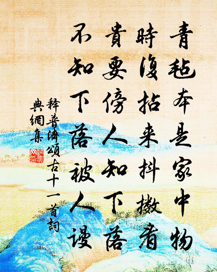 詩詞名句歷史字典書法欣賞書法字典國語詞典說文解字康熙字典古漢語字典標 題 作 者 詩 句 頌古十一首作者:釋普濟 朝代:宋代頌古十一首原文青氈本是家中物,時復拈來抖擻看。貴要傍人知下落,不知下落被人謾。詩詞問答問:頌古十一首的作者是誰?答:釋普濟問:頌古十一首寫於哪個朝代?答:宋代釋普濟頌古十一首書法欣賞頌古十一首書法作品詩詞推薦漁家傲(般涉)周邦彥〔宋代〕灰暖香融銷永晝。蒲萄架上春藤秀。曲角欄乾群雀斗。清明後。風梳萬縷亭前柳。日照釵梁光欲溜。循階竹粉沾衣句羅紹威〔唐代〕樓前澹澹雲頭日,簾外蕭蕭雨腳風。高士詠韓康吳筠〔唐代〕伯休抱遐心,隱括自為美。賣藥不二價,有名反深恥。安能受玄纁,秉願終素履。逃遁從所尚,蕭蕭絕塵軌。偈頌七十一首釋了惠〔宋代〕冰雪凍皮膚,麻麥餓腸肚。見日未嘗迷,見星安有悟。黃面老瞿曇,甜瓜成苦瓠。那更錯行山下路,一步兩步三四辛卯正月二日蝶軒蚤作舒岳祥〔宋代〕鴉背閃晴天,輕明紫翠煙。年將人老大,形志影周旋。鳥語催晨枕,梅花照夜編。池塘春草句,此意有誰傳。挽伏德華主簿陽枋〔宋代〕黌堂深惜昔,六典共尋源。合遂齊飛鶚,嘉逾競化鵾。紅顏君早去,白髮我空存。方寸千年事,悽然誰與論。南歌子趙攄〔元代〕澗草萋萋綠,林鶯恰恰啼。汀沙過雨便無泥。喚得芒鞋隨意、到前溪。浦漵渾堪畫,雲煙總是題。江湖老伴一蓑衣滿江紅·齊山繡春台吳潛〔宋代〕十二年前,曾上到、繡春台頂。雙腳健、不煩筇杖,透岩穿嶺。老去漸消狂氣習,重來依舊佳風景。想牧之、千載再和虞儔〔宋代〕天時人事日相煎,否泰俄驚在眼前。積閏盡歸冬十月, * 一似太初年。聯珠合璧猶重見,華發蒼顏益可憐。三撫閒中鄭剛中〔宋代〕須知造物有恩深,遺我閒中見物心。掠水高低鷗自在,過花先後燕相尋。門前父老忽聞語,種罷今年常值陰。秋熟長沙汪元量〔宋代〕洞庭過了浪猶高,河伯欣然止怒濤。傍岸買魚仍問米,登樓呼酒更持螯。湘汀暮雨幽蘭溼,野渡寒風古樹號。詩到頌古十三首釋德光〔宋代〕颺下采樵斧,直入碓坊舂。一腳踏到底,黃梅信息通。小歲日對酒吟錢湖州所寄詩白居易〔唐代〕獨酌無多興,閒吟有所思。一杯新歲酒,兩句故人詩。楊柳初黃日,髭鬚半白時。蹉跎春氣味,彼此老心知。吳必顯欲遠出謁故舊愬情悃賦二章贊其行曾豐〔宋代〕貧寧少壯貧,貧老卻難禁。兒女婚姻逼,風霜疾病侵。令渠常白眼,見子亦寒心。況是舊相識,人人義斷金。哭胡遇朱慶餘〔唐代〕尋僧昨日尚相隨,忽見緋幡意可知。題處舊詩休更讀,買來新馬憶曾騎。不應隨分空營奠,終擬求人與立碑。每向獨游西齋,寄崔主簿韋應物〔唐代〕同心忽已別,昨事方成昔。幽徑還獨尋,綠苔見行跡。秋齋正蕭散,煙水易昏夕。憂來結幾重,非君不可釋。世事戴復古〔宋代〕世事真如夢,人生不肯閒。利名雙轉轂,今古一憑欄。春水渡傍渡,夕陽山外山。吟邊思小范,共把此詩看。送趙奉禮宋庠〔宋代〕日出東郊郢路分,斑騅嘶斷悵離群。漢庭習蕝仙曹遠,楚驛攀梅使綬薰。蟻酎百壺凝桂溢,鵠歌三闕轉珠聞。登臨離亭燕(次韻答廖明略見寄)黃庭堅〔宋代〕十載樽前談笑。天祿故人年少。可是陸沈英俊地,看即鎖窗批詔。此處忽相逢,潦倒禿翁同調。西顧郎官湖渺。事導引詞 大金國志卷三十三金史卷四十,鼓吹邢具瞻〔元代〕五年一狩,仙仗到人間。稼穡艱難。蒼生洗眼秋光里,今日見天顏。金瓜玉斧沈煙。和舞蹈,六龍閒。歌謳道詠皆名句推薦奔車之上無仲尼,覆舟之下無伯夷。韓非及後人《韓非子·安危》 一水護田將綠繞,兩山排闥送青來王安石《書湖陰先生壁》 幾硯昔年游,於今成十秋。司馬光《送龔章判官之衛州·新及第》 可惜流年,憂愁風雨,樹猶如此!辛棄疾《水龍吟·登建康賞心亭》 眾人助之以力,近者結之以成,遠者譽之以名,尊者載之以勢。韓非及後人《韓非子·功名》 江山如有待,花柳自無私。杜甫《後游》 馬穿楊柳嘶,人倚鞦韆笑,探鶯花總教春醉倒。王磐《清江引·清明日出遊》 今日山城對垂淚,傷心不獨為悲秋。李益《上汝州郡樓》 贈遠虛盈手,傷離適斷腸。李商隱《十一月中旬至扶風界見梅花》 此去與師誰共到,一船明月一帆風。韋莊《送日本國僧敬龍歸》