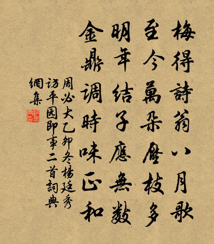 詩詞名句歷史字典書法欣賞書法字典國語詞典說文解字康熙字典古漢語字典標 題 作 者 詩 句 乙卯冬楊廷秀訪平園即事二首作者:周必大 朝代:宋代原文梅得詩翁八月歌,至今萬朵壓枝多。明年結子應無數,金鼎調時味正和。詩詞問答問:《乙卯冬楊廷秀訪平園即事二首》的作者是誰?答:周必大問:該詩寫於哪個朝代?答:宋代書法欣賞乙卯冬楊廷秀訪平園即事二首書法作品詩詞推薦秀野周弼〔宋代〕小作幽園傍宅開,只須數畝占樓台。石移林屋秋雲至,水帶松江暮雨來。徑草散香迎過屐,砌花分影蔭流杯。人家王寶謨輓詩魏了翁〔宋代〕昔我仕龜城,猶能友寧馨。記曾{左奭右斗}別酒,俄遽隔泉扃。頃刻成三世,淒涼隔九齡。魂兮誰與作,吾友許法曲獻仙音李彭老〔宋代〕雲木槎椏,水葒搖落,瘦影半臨清淺。翠羽迷空,粉容羞曉,年華柱弦頻換。甚何遜、風流在,相逢共寒晚。總依瑞鶴仙楊無咎〔宋代〕見蘭枯菊悴。□寂寞,天與春風來至。梅梢弄晴蕊。似於人,裝點十分和氣。吳頭楚尾。聽民謠、歡聲鼎沸。總扶東城尋春白居易〔唐代〕老色日上面,歡情日去心。今既不如昔,後當不如今。今猶未甚衰,每事力可任。花時仍愛出,酒後尚能吟。但恐泛溪船至巴東陸游〔宋代〕溪船莫嫌迮,船迮始相宜。兩槳行何駛,重灘過不知。荒村寇相縣,破屋屈平祠。不耐新愁得,啼猿掛冷枝。送鄉友林耕道往信州因寄李明通戴表元〔宋代〕慮公全盛時,桃李何紛紛。冠蓋蔽白日,談笑起青雲。林翁我鄉曲,同業又同門。如何三十年,白頭始相聞。全家西江月(送衛卿弟赴定遠簿)葛勝仲〔宋代〕萬卷舊推鴻博,一官且慰蹉跎。昇平樓下賜危科。曾對顒昂黼坐。燕頷從來骨貴,鸞棲尚屈才多。今宵且共入無何新種芭蕉蘇轍〔宋代〕芭蕉移種未多時,濯濯芳莖已數圍。畢竟空心何所有,欹傾大葉不勝肥。蕭騷莫雨鳴山樂,狼籍秋霜脫敝衣。堂上浩西堂見和因再用韻釋紹嵩〔宋代〕小園和雨掃莓苔,個個圓如濟世財。丘壑同盟從已定,莫談休咎動寒灰。劉小漕李新〔宋代〕五雲入夢翠浮農,正在高陽巴里中。八葉螢含天露綠,千年桃映海波紅。流錢遠裔爭推晏,青史何人獨比雄。白面第一山顏師魯〔宋代〕聞說淮南第一山,老來方此憑欄乾。孤城不隔長安望,落日空悲汴水寒。題浯溪小景胡寅〔宋代〕卜宅元郎豈偶然,江山千古共流傳。乾坤巨石知多少,待看中興第二篇。送清湘蔣尉李曾伯〔宋代〕我學言詩詩不奇,蔣君言命卻能詩。歲寒如許松不改,春信未來梅已知。丘壑何如歸去好,江湖終匪老來宜。辰州題破石鋪李呂〔宋代〕往返數百里,上下幾重山。僕僕利名客,不知行路難。歸汝墳山莊留別盧象祖詠〔唐代〕淹留歲將晏,久廢南山期。舊業不見棄,還山從此辭。漚麻入南澗,刈麥向東菑。對酒雞黍熟,閉門風雪時。非君過武塘王冕〔元代〕青衫閘轉雲間路,河水分流過武塘。客路慣經風雨惡,詩情不減少年狂。魚鹽市井三吳俗,番島舟航十丈檣。楊柳捕蝗至浮雲嶺山行疲苶有懷子由弟二首·其二蘇軾〔宋代〕霜風漸欲作重陽,熠熠溪邊野菊香。久廢山行疲犖确,尚能村醉舞淋浪。獨眠林下夢魂好,回首人間憂患長。殺馬秋日朱槔〔宋代〕鳴蜩初歇樹猶陰, * 紅榴色轉深。管領秋風有今日,留仙群稱辟寒金。八朋七日省真苦雨三首司馬光〔宋代〕悵望中秋月,於今已上弦。明生圭樣小,影露桂華偏。幽恩邈難致,浮雲去不還。何當出陰翳,清澈照中天。名句推薦畫圖省識春風面,環珮空歸夜月魂。杜甫《詠懷古蹟五首·其三》 遇酒且呵呵,人生能幾何!韋莊《菩薩蠻·勸君今夜須沈醉》 雁柱十三弦,一一春鶯語。歐陽修《生查子·含羞整翠鬟》 北風吹雪四更初,嘉瑞天教及歲除。陸游《除夜雪》 江涵雁影梅花瘦,四無塵、雪飛雲起,夜窗如晝。盧祖皋《賀新郎·挽住風前柳》 蕃甲鎖蛇鱗,馬嘶青冢白。李賀《塞下曲》 一寸丹心圖報國,兩行清淚為思親。于謙《立春日感懷》 年年春日異鄉悲,杜曲黃鶯可得知。韋莊《江外思鄉》 夜中不能寐,起坐彈鳴琴。阮籍《詠懷八十二首·其一》 戰陣之間,不厭詐偽。韓非及後人《韓非子·難一》