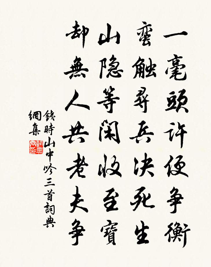 詩詞名句歷史字典書法欣賞書法字典國語詞典說文解字康熙字典古漢語字典標 題 作 者 詩 句 山中吟三首作者:錢時 朝代:宋代山中吟三首原文一毫頭許便爭衡,蠻觸尋兵決死生。山隱等閒收至寶,卻無人共老夫爭。詩詞問答問:山中吟三首的作者是誰?答:錢時問:山中吟三首寫於哪個朝代?答:宋代錢時山中吟三首書法欣賞山中吟三首書法作品詩詞推薦悲陳陶杜甫〔唐代〕孟冬十郡良家子,血作陳陶澤中水。野曠天清無戰聲,四萬義軍同日死。群胡歸來血洗箭,仍唱胡歌飲都市。都人酬僕射牛相公晉國池上別後至甘棠館忽夢同游…口號見寄劉禹錫〔唐代〕已嗟池上別魂驚,忽報夢中攜手行。此夜獨歸還乞夢,老人無睡到天明。湘弦怨孟郊〔唐代〕昧者理芳草,蒿蘭同一鋤。狂飆怒秋林,曲直同一枯。嘉木忌深蠹,哲人悲巧誣。靈均入回流,靳尚為良謨。我願戲李文遠孫棨〔唐代〕引君來訪洞中仙,新月如眉拂戶前。領取嫦娥攀取桂,便從陵谷一時遷。廉村族人命賦唐補闕薛公墓薛嵎〔宋代〕何處青山無白骨,先生高節死猶存。古今人物一抔土,閩浙詩書百世孫。鄉邑有祠尊往哲,樵芻知禁避荒垣。斷碑挽故和容州朝請陶公丁師正〔宋代〕揖坐樓頭夜,酒杯生菜盤。交情三月暮,細雨一燈寒。談笑響如在,賡酬墨未乾。死生千古別,西日照闌乾。頌古九十八首釋印肅〔宋代〕玄沙大用,雪峰三弄。大地山河,六遍震動。惠山雲開複合楊萬里〔宋代〕二年常州不識山,惠山一見開心顏。只嫌雨里不子細,髣佛隔簾青玉鬟。天風忽吹白雲坼,翡翠屏開倚南極。政緣緣識宋太宗〔宋代〕老少競浮沈,須知歲月深。開花如似夢,世有幾般心。和單令自龍山迎月而歸胡寅〔宋代〕招提爐上寶香氳,問信浮屠作祖人。想得妙心同水鏡,故應歸路見冰輪。清輝萬里無窮雪,淨觀千山不隔塵。欲識過楊華父宅與二僧同舟不及訪方回〔宋代〕每喜佯狂叟,窮途說共財。忽辭酒仙市,徑上客星台。鼓枻攜支遁,過門憶老萊。恐勞難黍具,或可致新醅。送元晦劉珙〔宋代〕翩翩雙黃鶴,結巢相因依。一為天風便,矯翮西北飛。歲華及晼晚,霜露侵征衣。此行亦良苦,千里以為期。堂上和韋侍御寓直對雨錢起〔唐代〕名貴四科首,班宜二妙齊。如何厭白簡,未得步金閨。寓直晦秋雨,吟餘聞遠雞。漏聲過旦冷,雲色向窗低。誰謂送榮別駕赴華州皇甫冉〔唐代〕直到群峰下,應無累日程。高車入郡舍,流水出關城。草色田家迥,槐陰府吏迎。還將海沂詠,籍甚漢公卿。拾得贊釋可湘〔宋代〕生苕箒,提在手。放下絕諸塵,轉掃復轉有。松門十里春如晝。幽成四景水光張玉孃〔宋代〕渺渺涵秋色,澄澄生曉煙。四山潦初歇,寒玉一溪完。滿江紅 登石頭城清涼寺翠微亭張野〔元代〕翠微秋晚,試閒登絕頂,徘徊凝佇。一片清涼兜率界,幾度風雷貔虎。鍾阜盤空,石城瞰水,形勢相吞吐。江山依三部樂吳文英〔宋代〕江鶃花初飛,盪花萬里素雲,際空如沐。詠情吟思,不在秦箏金屋。夜潮上,明月蘆花,傍釣蓑夢遠,句清敲玉。紅葉林賓暘〔宋代〕五夜霜為染,輕明映碧流。山林驚有色,天地欲無秋。野渡風初起,夕陽雨未收。昔聞共墨客,霜屋落颼飀。南鄉子·路入南中歐陽炯〔唐代〕路入南中,桄榔葉暗蓼花紅。兩岸人家微雨後,收紅豆,樹底纖纖抬素手。名句推薦感此懷故人,中宵勞夢想。孟浩然《夏日南亭懷辛大》 大漠孤煙直,長河落日圓。王維《使至塞上》 嬌艷輕盈香雪膩,細雨黃鶯雙起。張泌《滿宮花·花正芳》 朔吹飄夜香,繁霜滋曉白。柳宗元《早梅》 飄風不終朝,驟雨不終日。老子《老子·道經·第二十三章》 一曲新詞酒一杯,去年天氣舊亭台。晏殊《浣溪沙·一曲新詞酒一杯》 花繁柳密處,撥得開,才是手段;風狂雨急時,立得定,方見腳根。陳繼儒《小窗幽記·集醒篇》 天道無親,常與善人。老子《老子·德經·第七十九章》 玉人垂釣理纖鉤。月明池閣夜來秋。吳文英《浣溪沙·秋情》 步轉迴廊,半落梅花婉娩香。蘇軾《減字木蘭花·春月》