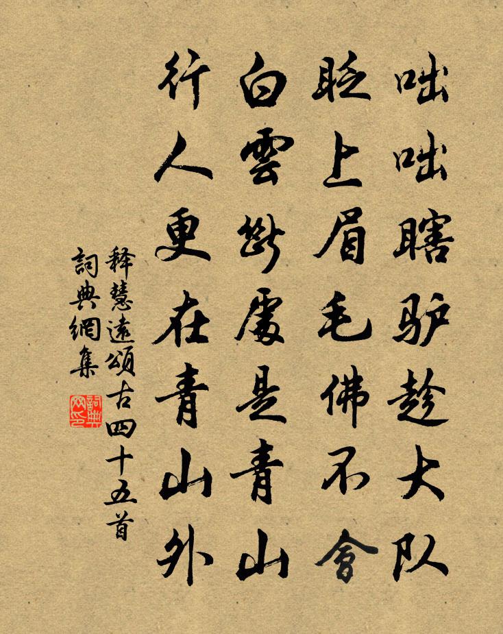 詩詞名句歷史字典書法欣賞書法字典國語詞典說文解字康熙字典古漢語字典標 題 作 者 詩 句 頌古四十五首作者:釋慧遠 朝代:宋代頌古四十五首原文咄咄瞎驢趁大隊,眨上眉毛佛不會。白雲斷處是青山,行人更在青山外。詩詞問答問:頌古四十五首的作者是誰?答:釋慧遠問:頌古四十五首寫於哪個朝代?答:宋代釋慧遠頌古四十五首書法欣賞頌古四十五首書法作品詩詞推薦好事近(湖上)蘇軾〔宋代〕湖上雨晴時,秋水半篙初沒。朱檻俯窺寒鑒,照衰顏華發。醉中吹墮白綸巾,溪風漾流月。獨棹小舟歸去,任煙波和劉後村梅花百詠方蒙仲〔宋代〕倚樹靜年成入定,巡檐對語似談空。是花是雪都休問,但覺清香滿袖風。詠懷白居易〔唐代〕自從委順任浮沈,漸覺年多功用深。面上減除憂喜色,胸中消儘是非心。妻兒不問唯耽酒,冠蓋皆慵只抱琴。長笑寄李隱居杜荀鶴〔唐代〕自小棲玄到老閒,如雲如鶴住應難。溪山不必將錢買,贏得來來去去看。簡王元宗趙蕃〔宋代〕相望兩招提,林深路不迷。微軀敢高臥,借屋且幽棲。問訊聊題句,經過阻杖藜。良由日日雨,山徑亦成泥。江城子張之翰〔元代〕道途急急莫留驂。敝塵衫。困如酣。二載徐州,剛喚作髯參。長記秋風吹別酒,君向北,我來南。來時霜未落寒潭梨蘇軾〔宋代〕霜降紅梨熟,柔柯已不勝。未嘗蠲夏渴,長見助春冰。盛山十二詩。繡衣石榻(為溫侍御置)韋處厚〔唐代〕巉巉雪中嶠,磊磊標方峭。勿為枕蒼山,還當礎清廟。雪林硯屏率魯直同賦蘇軾〔宋代〕西山無時春,巉岩鎖頑陰。分明倚天壁,點綴無風林。物固為人出,興誰於此深。窮奇真自蠹,詩句且娛心。金縷曲 送德昌張之翰〔元代〕走遍江南路。看天公、何時遠我,故山深處。君處錢塘余甓社,千里不期而遇。更分甚、主賓吾汝。一片湖光濃似支提宏老請贊釋妙倫〔宋代〕搭一隻手,揮三尺鐵。天下衲僧,望風膽裂。豈料豐乾院裡撞著個匾頭魔孽,盡把家私俱漏洩。卻向玉融側童峰前閨怨1舒岳祥〔宋代〕一春心事許誰同,金鑰無聲柳絮風。怪得枕中黃鳥喚,不知窗外海棠紅。定風波王哲〔元代〕昔日嘉山第一程。今朝臣海載清清。重泛瑤池真得得,盈盈。昂頭堪認自家聲。玉浪銀波別景致,瓊濤朱溜作高名送道士歸得日觀章鑒〔宋代〕風月詩幾卷,江湖屐一雙。斷蛟懷劍石,跨鶴叩禪窗。土潤岩生雨,林幽寺隔江。歸當訪仙隱,相對酒盈缸。送處士武君歸章洪山居(一作送武全通處士歸隱洪山)許渾〔唐代〕形影無群訊息沉,登聞三擊血沾襟。皇綱一日開冤氣,青史千年重壯心。卻望烏台春樹老,獨歸蝸舍暮雲深。他時奉酬應物陳師道〔宋代〕論世闕真是,憎好成愚賢。眾手挽跛牂,擬度驊騮前。與子早相好,於今不知年。似從欲著帽,憂喜同華顛。生世申州道中崔塗〔唐代〕風緊日淒淒,鄉心向此迷。水分平楚闊,山接故關低。客路緣烽火,人家厭鼓鼙。那堪獨馳馬,江樹穆陵西。【商調】河西後庭花王元鼎〔元代〕此曲之作,有自來矣。昔胡元大都妓女名莘文秀者,美姿色,與學士王元鼎有姻,亦與阿魯相契。異期阿與莘仵坐自閔陸游〔宋代〕主人元是客,儒上卻成僧。垂老貧如昔,經春醉未曾。褰衣身傴僂,顧影發鬅鬠。忽憶東岡路,捫蘿試一登。所思亭海棠初折贈兩使者將以小詩張栻〔宋代〕未須比擬紅深淺,更莫平章香有無。過雨夕陽樓上看,千花容有此膚腴。名句推薦天入平湖晴不風,夕帆和雁正浮空。陳與義《登岳陽樓》 天下英雄誰敵手?曹劉。生子當如孫仲謀辛棄疾《南鄉子·登京口北固亭有懷》 中州遺恨,不知今夜幾人愁。辛棄疾《水調歌頭·和馬叔度游月波樓》 日習則學不忘,自勉則身不墮徐幹《中論·上卷·治學》 怡然敬父執,問我來何方。問答乃未已,驅兒羅酒漿杜甫《贈衛八處士》 流水下灘非有意,白雲出岫本無心。佚名《增廣賢文·上集》 從別後,憶相逢,幾回魂夢與君同。晏幾道《鷓鴣天·彩袖殷勤捧玉鍾》 潮平兩岸闊,風正一帆懸。王灣《次北固山下》 相看兩不厭,只有敬亭山。李白《獨坐敬亭山》 柳條折盡花飛盡,借問行人歸不歸?佚名《送別詩》