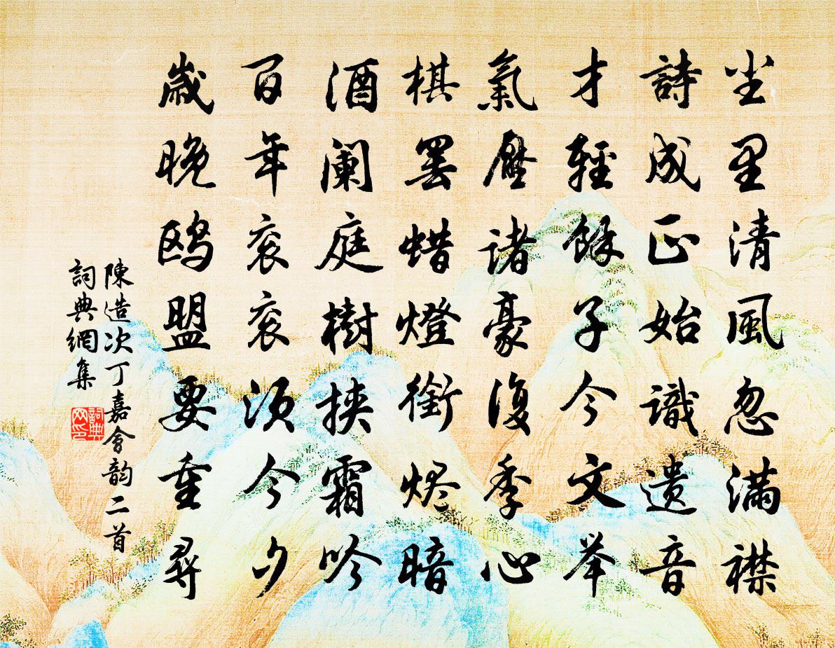 詩詞名句歷史字典書法欣賞書法字典國語詞典說文解字康熙字典古漢語字典標 題 作 者 詩 句 次丁嘉會韻二首作者:陳造 朝代:宋代次丁嘉會韻二首原文塵里清風忽滿襟,詩成正始識遺音。才輕餘子今文舉,氣壓諸豪復季心。棋罷蠟燈銜燼暗,酒闌庭樹挾霜吟。百年袞袞須今夕,歲晚鷗盟要重尋。詩詞問答問:次丁嘉會韻二首的作者是誰?答:陳造問:次丁嘉會韻二首寫於哪個朝代?答:宋代陳造次丁嘉會韻二首書法欣賞次丁嘉會韻二首書法作品詩詞推薦古墨行陳師道〔宋代〕秦郎百好俱第一,烏丸如漆姿如石。巧作松身與鏡面,借美於外非良質。潘翁拜跪摩老眼,一生再見三嘆息。了知贈友人史堯弼〔宋代〕悼往不知籬菊芳,豈知籬外遊人忙。寒暄節物覆手異,依然大樹堪彷徨。羨君真比道州政,間飲醇酒南山陽。遙想偈三十五首釋祖珍〔宋代〕飄空一葉兩新收,暑退涼生萬壑秋。貼肉汗衫才脫下,橫吹木笛倒騎牛。孟子求放心陳普〔宋代〕放豚無跡竟西奔,著意追求孰用功。惟必操存能主敬,依然不離這腔中。詠古二首有所寄劉禹錫〔唐代〕車音想轔轔,不見綦下塵。可憐平陽第,歌舞嬌青春。金屋容色在,文園詞賦新。一朝復得幸,應知失意人。寂寥奉陪武相公西亭夜宴陸郎中盧士政〔唐代〕華堂良宴開,星使自天來。舞轉朱絲逐,歌余素扇回。水光凌曲檻,夜色靄高台。不在賓階末,何由接上台。三疊仇遠〔宋代〕在昔金淵池,煙花錦不如。衣冠尊史祖,山水識靈胥。富歲人多賴,前修日以疏。洪崖仙可問,願乞雪精驢。句杜耒〔宋代〕岩花隨處發。和原甫曉雨韓維〔宋代〕喜雨濯炎夜,餘飛入晨光。起來坐軒戶,北風吹我裳。碧折萱葉亂,翠添林筍長。翩翩庭中燕,群飛戲清涼。直恐題長江圖三絕王柏〔宋代〕魚腹江邊八陣圖,嶙峋於此豈良謨。後來浪道長蛇勢,用勢還須烈丈夫。虞美人仇遠〔宋代〕滿城風雨消凝處。誰是潘郎句。蕭蕭楊柳□凋黃。醉渡官橋瘦馬、踏輕霜。舊時都道遊春好。不似秋光小。菊花過屏居釋文珦〔宋代〕吾生本疎庸,不作塵間夢。屏居萬山中,野性頗自縱。消搖鷹脫鞲,蕭散馬釋鞚。天寒放麋入,春燠聞鳥哢。斸藥通泉縣署屋壁後薛少保畫鶴杜甫〔唐代〕薛公十一鶴,皆寫青田真。畫色久欲盡,蒼然猶出塵。低昂各有意,磊落如長人。佳此志氣遠,豈惟粉墨新。萬里題義門胡氏華林書院趙赴〔宋代〕家隱西山下,華林地絕塵。門旌千古義,學聚四方人。道致清雲富,名隨白日新。他年應許我,猿鶴一相親。三月十四日陪帥卿出遊一首劉克莊〔宋代〕未出堯山雲,既出雲徐開。君侯與天通,造化力可回。駕言訪岩扉,群彥森然陪。旗鉞映川原,笳吹喧藁萊。掃石寄雲泉僧永頤周弼〔宋代〕頌罷南華誰得聞,兩川寒玉一禪身。松邊彈舌低聲念,莫引龍來變作人。方平李覯〔宋代〕五百餘年別恨多,東征重得見青娥。擗麟始擬窮歡樂,不奈閒人背癢何。題畫蔡確張玉孃〔宋代〕楚水吳山作勝游,竹狀石枕定離愁。晚煙何處吹漁笛,獨憶琵琶怨碧秋。宿山莊駱賓王〔唐代〕金陵一超忽,玉燭幾還周。露積吳台草,風入郢門楸。林虛宿斷霧,磴險掛懸流。拾青非漢策,化緇類秦裘。牽跡秋興陸游〔宋代〕滿簪白髮不勝繁,竊祿偷安媿主恩。東館煙波秋漸瘦,北山霧雨晝多昏。功名蹭蹬身長棄,籌策瀾翻舌倖存。堪笑名句推薦白雲千里萬里,明月前溪後溪。劉長卿《謫仙怨·晴川落日初低》 但恨處非位,愴悢使心傷。阮籍《詠懷八十二首·其七十九》 木落雁南度,北風江上寒。孟浩然《早寒江上有懷 / 早寒有懷 / 江上思歸》 一春魚雁無訊息,則見雙燕斗銜泥。關漢卿《大德歌·春》 千錘萬鑿出深山,烈火焚燒若等閒。于謙《石灰吟》 送數聲驚雁,下離煙水,嘹唳度寒雲。孔夷《南浦·旅懷》 漠漠黃雲,濕透木棉裘。蔣捷《梅花引·荊溪阻雪》 山河風景元無異,城郭人民半已非。文天祥《金陵驛二首·其一》 惆悵孤帆連夜發,送行淡月微雲。蘇軾《臨江仙·送錢穆父》 清露晨流,新桐初引,多少遊春意。李清照《念奴嬌·春情》