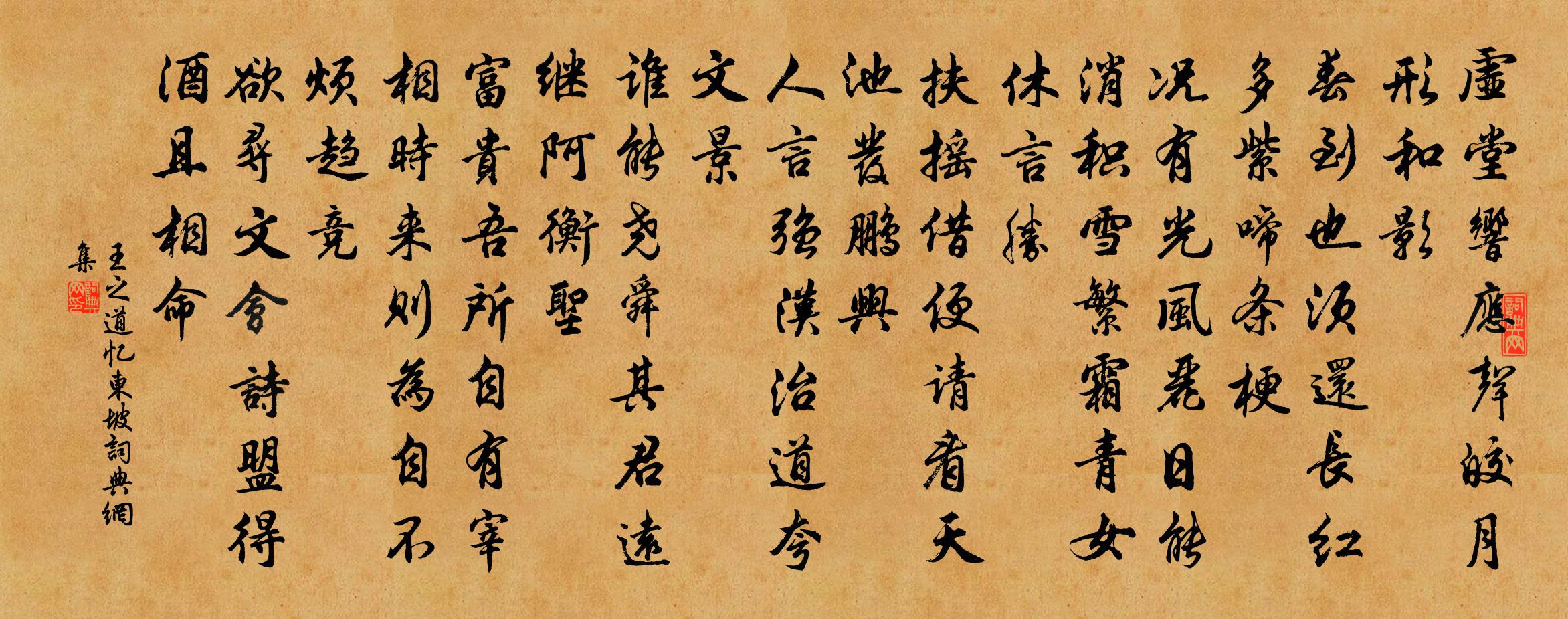 詩詞名句歷史字典書法欣賞書法字典國語詞典說文解字康熙字典古漢語字典標 題 作 者 詩 句 憶東坡作者:王之道 朝代:宋代憶東坡原文虛堂回響聲,皎月形和影。春到也須還,長紅多紫啼條梗。況有光風麗日,能消積雪繁霜,青女休言勝。扶搖借便,請看天池發鵬興。人言強漢,治道夸文景。誰能堯舜其君,遠繼阿衡聖。富貴吾所自有,宰相時來則為,自不煩趨競。欲尋文會詩盟,得酒且相命。詩詞問答問:憶東坡的作者是誰?答:王之道問:憶東坡寫於哪個朝代?答:宋代問:憶東坡是什麼體裁?答:詞王之道憶東坡書法欣賞憶東坡書法作品詩詞推薦懷則堂實堂文天祥〔宋代〕白頭北使駕雙韉,沙闊天長淚曉煙。中夜想應發深省,故人南北地行仙。已亥雜詩 30龔自珍〔清代〕事事相同古所難,如鶼如鰈在長安。從今兩戒河山外,各逮而孫盟不寒。醉桃源佚名〔宋代〕本來無說本無言。澄寂湛然。湛然常寂*神全。希內自觀玄。玄中妙,妙中玄。無相貌,莫團圓。往來去,怎遮攔郴江百詠並序西湖阮閱〔宋代〕岸草江花對夕陽,滿船新月夜鳴榔。秋清菡萏紅千柄,風靜琉璃碧一方。柏梁隔句韻詩李建勛〔唐代〕不喜長亭柳,枝枝擬送君。惟憐北窗樹,樹樹解留人。圓缺都如月,東西只似雲。愁看離席散,歸蓋動行塵。木蘭花/玉樓春晏殊〔宋代〕春蔥指甲輕攏拈。五彩條垂雙袖卷。雪香濃透紫檀槽,胡語急隨紅玉腕。當頭一曲情無限。入破錚琮金鳳戰。百分午窗坐睡蘇軾〔宋代〕 * 蟠兩膝,竹几閣雙肘。此間道路熟,逕到無何有。身心兩不見,息息安且久。睡蛇本亦無,何用鉤與手。神凝句佚名〔宋代〕社近記穿黃增子,雨前趲摘紫槍旗。奉陪黃帥機訪問元夕戰場歸途見人家園池花木曹彥約〔宋代〕並轡遊人任往來,透牆春色已安排。花時卻記梅前事,秀水如何不永懷。游閒居院文同〔宋代〕乘暇訪閒居,臨行欲所須。急沽龍口酒,忙打佛前魚。和宋英叟先塋建亭作何夢桂〔宋代〕誰表新阡瞰石關,要將孝義軌人寰。千年永宅歸元亮,百尺豐碑葬魯山。旌旐尚存青檟外,亭台半在白雲間。兒孫座中戲呈諸少年白居易〔唐代〕衰容禁得無多酒,秋鬢新添幾許霜。縱有風情應淡薄,假如老健莫誇張。興來吟詠從成癖,飲後酣歌少放狂。不為孔子舊宅汪元量〔宋代〕奉出天家一瓣香,著鞭東魯謁靈光。堂堂聖像垂龍袞,濟濟賢生列雁行。屋壁詩書今絕響,衣冠人物只堪傷。可憐反舌釋文珦〔宋代〕毛羽誠無取,禽中號善鳴。能將一片舌,巧作百般聲。元是因風氣,曾非出性情。君看五月後,瘖默愧流鶯。百舌鳥二首無則〔唐代〕千愁萬恨過花時,似向春風怨別離。若使眾禽俱解語,一生懷抱有誰知。長截鄰雞叫五更,數般名字百般聲。饒伊漁家傲 以上周詠先校舊抄圭塘款乃集本馬熙馬熙〔元代〕涼入槐 * 巷杳。秋容次第歸苹蓼。潦盡波寒亭影倒。征雁早。一聲喚起江天曉。菊外白衣殊未到。沙堤留得西山聞新雁有感陸游〔宋代〕新雁南來片影孤,冷雲深處宿菰蘆。不知湘水巴陵路,曾記漁陽上谷無?次韻贈西謂之龔穎〔宋代〕膽怯何由戴鐵冠,只緣昭代獎孤寒。曲肱未遂違前志,直指無聞是曠官。三署每傳朝客說,五溪閒憑郡樓看。祝君登六和塔陽枋〔宋代〕錢塘江上撐空塔,塔外遙山翠作堆。酒罷憑欄呼落日,水雲深處子陵台。酬鄰僧惠古杭蘆管兔毫艾性夫〔宋代〕黃蘆笠澤剪秋雨,褐兔中山俘飽霜。千里能隨雲衲遠,數君肯顧草廬荒。無情書傳方高閣,何處塵埃有畫牆。留與名句推薦善謀生者,但令長幼內外,勤修恆業,而不必富其家王永彬《圍爐夜話·第九則》 綠酒初嘗人易醉。一枕小窗濃睡。晏殊《清平樂·金風細細》 明眸皓齒誰復見,只有丹青余淚痕。蘇軾《虢國夫人夜遊圖》 未有知而不行者。王陽明《傳習錄·卷上·徐愛錄》 秋蕭索。梧桐落盡西風惡。黃機《憶秦娥·秋蕭索》 攜籮驅出敢偷閒,雪脛冰須慣忍寒。范成大《雪中聞牆外鬻魚菜者求售之聲甚苦有感》 路逢俠客須呈劍,不是才人莫獻詩。佚名《增廣賢文·上集》 疾風知勁草,板蕩識誠臣。李世民《賜蕭瑀》 望處雨收雲斷,憑闌悄悄,目送秋光。柳永《玉蝴蝶·望處雨收雲斷》 北郭清溪一帶流,紅橋風物眼中秋,綠楊城郭是揚州。王士禎《浣溪沙·紅橋》