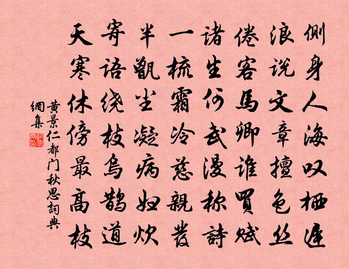 詩詞名句歷史字典書法欣賞書法字典國語詞典說文解字康熙字典古漢語字典標 題 作 者 詩 句 都門秋思作者:黃景仁 朝代:清代都門秋思原文側身人海嘆棲遲,浪說文章擅色絲。倦客馬卿誰買賦,諸生何武漫稱詩。一梳霜冷慈親發,半甑塵凝病婦炊。寄語繞枝烏鵲道:天寒休傍最高枝。詩詞問答問:都門秋思的作者是誰?答:黃景仁問:都門秋思寫於哪個朝代?答:清代問:黃景仁的名句有哪些?答:黃景仁名句大全黃景仁都門秋思書法欣賞都門秋思書法作品詩詞推薦汴京紀事二十首 其十六劉子翬〔宋代〕盤石曾聞受國封,承恩不與幸臣同。時危運作高城砲,猶解捐軀立戰功。陪胡少卿登山瞻禹陵喻良能〔宋代〕考古年來喜有徵,相攜步步上崚嶒。皇華使者歸朝著,好為詩翁說禹陵。再答前韻二首曹勛〔宋代〕客居索寞厭天窮,撫事無能笑語中。破睡好茶盈碗白,曝檐晴日半簾烘。向來切己連丁禍,政以臨民獲罔功。賴有菩薩蠻向子諲〔宋代〕天仙醉把真珠擲。荷翻寫入玻璃碧。雨過酒尊涼。紅蕖苒苒香。飛來雙白鷺。屢作僛僛舞。山鳥起清歌。晚來情更歸夢杜甫〔唐代〕道路時通塞,江山日寂寥。偷生唯一老,伐叛已三朝。雨急青楓暮,雲深黑水遙。夢歸歸未得,不用楚辭招。桃源憶故人王丹桂〔元代〕愁思俗態知多少。縈繞誰能分曉。方欲強追言笑。翻復成憂惱。春花秋月雖然好。總被功名誤了。才見兒童年少。寄李允蹈孫應時〔宋代〕相遇吳陵日,如登單父台。了知心尚在,不忍首重回。明月人千里,春風酒一杯。緘詩憑驛使,持當嶺頭梅。沁園春 夢孚若劉克莊〔宋代〕何處相逢,登寶釵樓,訪銅雀台。喚廚人斫就,東溟鯨膾,圉人呈罷,西極龍媒。天下英雄,使君與操,餘子誰堪意難忘 妓楊韻卿以善歌求賦張翥〔元代〕高韻天成。問當時愛愛,得似卿卿。江梅風致別,楚蕙雪香清。花旎旎,月盈盈。寫不盡才情。把舊遊,名謳試數港口楊冠卿〔宋代〕野寺雲山迥,人家煙火稀。水腥漁市近,帆落晚風微。拂樹昏鴉去,迎船白鳥飛。吾生樂江海,猶恐與心違。酬別襄陽詩僧少微(詩中答上人歸夢之意)皎然〔唐代〕證心何有夢,示說夢歸頻。文字齎秦本,詩騷學楚人。蘭開衣上色,柳向手中春。別後須相見,浮雲是我身。送梁道士周朴〔唐代〕舊居桐柏觀,歸去愛安閒。倒樹造新屋,化人修古壇。晚花霜後落,山雨夜深寒。應有同溪客,相尋學煉丹。上將行(一作上裴行軍中丞)耿湋〔唐代〕蕭關掃定犬羊群,閉閣層城白日曛。櫪上驊騮嘶鼓角,門前老將識風雲。旌旗四面寒山映,絲管千家靜夜聞。誰道初秋行圃四首楊萬里〔宋代〕今年六月不勝涼,七月炎蒸不可當。一陣秋風初過雨,個般天氣好燒香。清水岩禱晴陳宓〔宋代〕檐聲喧耳歷三旬,雲氣低低過一春。今日舉頭逢皎日,也知天道總由人。別朝祐趙文〔宋代〕又與我友別,獨與我子俱。念彼歸舟疾,眠食今何如。愁懷不可遣,賴有床頭書。曲江江上人,搖舟來賣魚。亦有北苑十詠採茶蔡襄〔宋代〕春衫逐紅旗,散入青林下。陰崖喜先至,新苗漸盈把。竟攜筠龍歸,更帶山雲寫。浪淘沙(題許由擲瓢手卷)張炎〔宋代〕拂袖入山阿。深隱松蘿。掬流洗耳厭塵多。石上一般清意味,不羨漁蓑。日月靜中過。俗□消磨。風瓢分付與清波羅敷水白居易〔唐代〕野店東頭花落處,一條流水號羅敷。芳魂艷骨知何在,春草茫茫墓亦無。文彧少卿文山郎中交好深至二紀已餘暌別…留題此詩徐鉉〔唐代〕孫家虛座吊諸孤,張叟僧房見手書。二紀歡游今若此,滿衣零淚欲何如。腰間金印從如斗,鏡里霜華已滿梳。珍重名句推薦銀鞍照白馬,颯沓如流星。李白《俠客行》 專一則勝,離散則敗。尉繚《尉繚子·兵令上》 肥水東流無盡期。當初不合種相思。姜夔《鷓鴣天·元夕有所夢》 君子之言寡而實,小人之言多而虛。劉向《說苑·談叢》 君家玉女從小見,聞道如今畫不成。黃庭堅《謝張仲謀端午送巧作》 苦心豈免容螻蟻,香葉終經宿鸞鳳。杜甫《古柏行》 春宵苦短日高起,從此君王不早朝。白居易《長恨歌》 結交在相知,骨肉何必親。佚名《箜篌謠》 不登高山,不知天之高也;不臨深溪,不知地之厚也荀子《荀子·勸學》 露濕晴花春殿香,月明歌吹在昭陽。李益《宮怨》