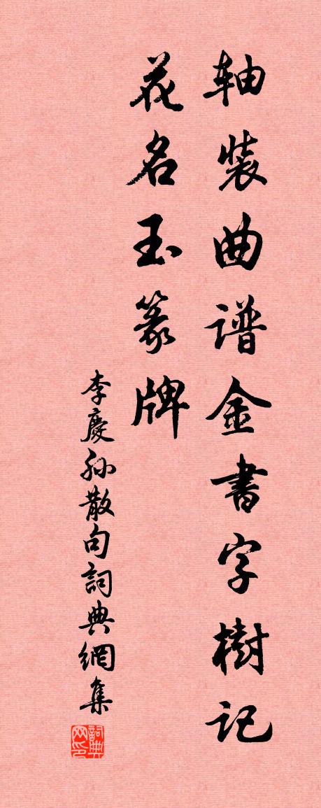 詩詞名句歷史字典書法欣賞書法字典國語詞典說文解字康熙字典古漢語字典標 題 作 者 詩 句 句作者:李慶孫 朝代:宋代句原文軸裝曲譜金書字,樹記花名玉篆牌。詩詞問答問:句的作者是誰?答:李慶孫問:句寫於哪個朝代?答:宋代李慶孫句書法欣賞句書法作品詩詞推薦尾犯·夜雨滴空階柳永〔宋代〕夜雨滴空階,孤館夢回,情緒蕭索。一片閒愁,想丹青難貌。秋漸老、蛩聲正苦,夜將闌、燈花旋落。最無端處,偈頌一百二十三首釋崇岳〔宋代〕大人具大見,大智得大用。一舉定千差,百發而百中。密贊中興業,了無毫末共。福如滄海壽如山,赫赫聲名繼前暮春陸游〔宋代〕憔悴都門白髮新,歸來一振客衣塵。啼鶯妒夢頻催曉,飛絮鍾情獨殿春。湖上風光猶淡沱,尊前懷抱頗清真。詩成送陸拾遺東歸許渾〔唐代〕獨振儒風遇盛時,紫泥初降世人知。文章報主非無意,書劍還家素有期。秋寺臥雲移棹晚,暮江乘月落帆遲。東歸侯郎中新置西湖方乾〔唐代〕遠近利民因智力,周回潤物像心源。菰蒲縱感生成惠,鱣鮪那知廣大恩。瀲灩清輝吞半郭,縈紆別派入遙村。砂泉閒眠白居易〔唐代〕暖床斜臥日曛腰,一覺閒眠百病銷。盡日一飧茶兩碗,更無所要到明朝。史主簿以授庵習稿見示敬題其後並寄張宗瑞樂雷發〔宋代〕姜夔荒冢白苹深,鸑鷟無聲結綠沈。擬向鄱陽尋後杜,只招張叟聽君吟。贈景福順長老二首〈並序〉蘇轍〔宋代〕轍幼侍先君,聞嘗游廬山,過圓通,見訥禪師,留連久之。元豐五年,以譴居高安,景福順公不遠百里惠然來訪,至後入城道中雜興十首楊萬里〔宋代〕大熟仍教得大晴,今年又是一昇平。昇平不在簫韶里,只在諸村打稻聲。題師吳堂黃公度〔宋代〕夫子賢堯舜,老彭嘗竊比。郯子及師襄,下問曾不恥。河汾一書生,自謂聖復起。西京投閣士,敢與孟軻齒。古人許洞歸吳中楊億〔宋代〕春渚歸艎不暫留,青絲如葆恐逢秋。騷人已得江山助,賦客終陪霰雪游。三徑未荒休歡鵬,十漿先饋定驚鷗。洞庭次天字韻答岑岩起蘇軾〔宋代〕一聲清蹕霧開天,百辟心莊豈貌虔。回顧驚君珠玉側,同升愧我粃糠前。裴回月色留壇影,縹緲松香泛蠟煙。(近喜雨姜特立〔宋代〕昨宵榾榾車聲喧,人情嗷嗷不得眠。今朝一雨忽大足,人聲車聲俱寂然。吁嗟血汗滴焦土,寸寸灌田亦良苦。天工題韓季默春山圖葛紹體〔宋代〕春山一簇帶春雲,樓閣高低日欲曛。騎馬棹船遊冶客,一天風月自平分。寄陸憲元鄭獬〔宋代〕陸子處乎順,雖窮志愈剛。劍埋金不蝕,圭折玉猶方。古意閒中見,浮名靜外忘。行藏吾自得,可笑接輿狂。題後鄭壁鄭剛中〔宋代〕滿眼煙塵雜鼓旗,經冬首鼠負憂疑。樹頭新綠今如此,孤負春光固可知。見梅袁甫〔宋代〕半月山行不識梅,近城纏見一枝開。呼童截竹敲冰水,盛取數枝隨轎來。狗溪迎湫祈雨輒應文同〔宋代〕夏雨渴久矣,秋苗憂杭然。至誠通祝版,靈貺逐香菸。桐祓應無訟,囷倉定有年。曹公三大堰,一夜滿民田。莫過竹如曾國藩〔清代〕維摩元未病,子把空復疑。薄暮還相訪,經旬系我思。深談四壁靜,交道一燈知。天畢看西下,來歸亦未遲。句鮮于侁〔宋代〕鄉關素號賢夫子,事論今推聖長官。名句推薦刻薄成家,理無久享;倫常乖舛,立見消亡。朱柏廬《朱子家訓·全文》 帆影依依楓葉外,灘聲汩汩碓床間查慎行《雨過桐廬》 已向丹霞生淺暈,故將清露作芳塵。睦石《玉蘭》 凡是人,皆須愛。天同覆,地同載。李毓秀《弟子規·泛愛眾》 吳洲春草蘭杜芳,感物思歸懷故鄉。宋之問《寒食江州滿塘驛》 參差煙樹灞陵橋,風物盡前朝柳永《少年游·參差煙樹灞陵橋》 如今白首鄉心盡,萬里歸程在夢中。清江《送婆羅門》 富貴不能淫,貧賤不能移,威武不能屈。此之謂大丈夫。孟子《孟子·滕文公章句下·第二節》 曾把梨花,寂寞淚闌乾朱淑真《江城子·賞春》 雨中百草秋爛死,階下決明顏色鮮。杜甫《秋雨嘆三首》