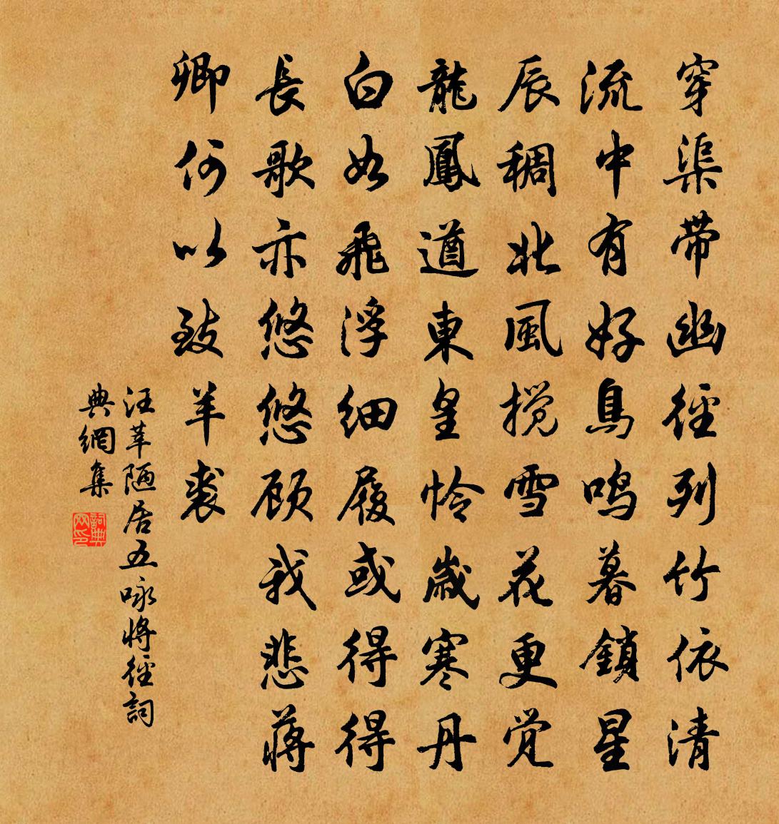 詩詞名句歷史字典書法欣賞書法字典國語詞典說文解字康熙字典古漢語字典標 題 作 者 詩 句 陋居五詠將徑作者:汪莘 朝代:宋代陋居五詠將徑原文穿渠帶幽徑,列竹依清流。中有好鳥鳴,暮鎖星辰稠。北風攪雪花,更覺龍鳳遒。東皇憐歲寒,丹白如飛浮。細履或得得,長歌亦悠悠。顧我悲蔣卿,何以致羊裘。詩詞問答問:陋居五詠將徑的作者是誰?答:汪莘問:陋居五詠將徑寫於哪個朝代?答:宋代汪莘陋居五詠將徑書法欣賞陋居五詠將徑書法作品詩詞推薦金光洞陳岩〔宋代〕神剜鬼劃劇幽深,門外藤蘿淺結陰。洞裡金仙十年坐,湛然認得本來心。驀山溪洪瑹〔宋代〕潮平風穩,行色催津鼓。回首望重城,但滿眼、紅雲紫霧。分香解佩,空記小樓東,銀燭暗,繡簾垂,昵昵憑肩語別徐明府賈島〔唐代〕抱琴非本意,生事偶相縈。口尚袁安節,身無子賤名。地寒春雪盛,山淺夕風輕。百戰余荒野,千夫漸耦耕。一杯偈頌二百零五首釋正覺〔宋代〕開爐歲歲是今朝,暖氣潛通稱我曹。可惜丹霞燒木佛,翻令院主墮眉毛。寄題程氏菊莊馬廷鸞〔宋代〕一觴浥露餐英美,八表同昏履運艱。芳節不隨籬下老,悠悠嘉氣眼中山。戲答舉人索米某名公〔宋代〕五貫九百五十俸,省錢請作足錢用。妻兒尚未厭糟糠,僮僕豈免遭飢凍。贖典贖解不曾休,吃酒吃肉何曾夢。為報水龍吟(初夏)曹勛〔宋代〕鑒天雲斂壺中,晝暖乍喜薰風永。輕紗漸試,香羅初褪,梅陰又□。廣殿窗虛,翠簾捲起,一番清影。正新篁綠嫩言命釋紹嵩〔宋代〕宇宙雙蓬鬢,升沉盡聽他。僧居隨處好,身事逐年多。異國逢佳節,流光等逝波。無謀長委命,言命欲如何。社飲陸游〔宋代〕東作初占嗣歲宜,蠶官又近乞靈時。傾家釀酒無遺力,倒社迎神盡及期。先醉後醒驚老憊,路長足蹇嘆歸遲。西村鵲橋仙同恕〔元代〕香飛玉屑,光凝粉蝶。不比精神瑩徹。春風一樹倚東欄,還稱道、仙肌勝雪。憑誰與說,容吾撿折。老去情緣未歇晚步上清宮坐棲真者久之用合溪韻錢時〔宋代〕壞砌頹檐竹數竿,一方深綠照人寒。此時別有真訊息,不用清流引激湍。米元章賞心詩帖贊岳珂〔宋代〕金陵之賞心,天下之奇觀,真足以當南宮之詩翰。予之持節登覽大一旦,而得此詩八年之泮奐。吁嗟公兮,豈料百和張倅湖上十絕姜特立〔宋代〕夕寒山水閟清暉,歸到華堂月半扉。傾倒錦囊無賸語,風光那得更相違。句陳嶠〔唐代〕小橋風月年年事,爭奈潘安老去何。隴西行·天上何所有佚名〔兩漢〕天上何所有,歷歷種白榆。桂樹夾道生,青龍對道隅。鳳凰鳴啾啾,一母將九雛。顧視世間人,為樂甚獨殊。好婦落花圖詠唐寅〔明代〕能賦相如已倦遊,傷春杜甫不禁愁。頭扶殘醉方中酒,面對飛花怕倚樓。萬片風飄難割捨,五更人起可能留。妍媸送史同叔通判過霅川釋寶曇〔宋代〕莫嫌畫鷁北風瞋,苕霅溪聲解喚人。一日便拚千日醉,十分留得九分春。匣琴書卷先行李,虹星車旆委後塵。屈指寄呈呂道山於八桂方回〔宋代〕朅從歙浦來湓浦,聞自全州入桂州。倚俟先生還北棹,定容小子到南樓。甘留旅瑣緣何事,積受恩私愧未酬。但願蝶戀花李彌遜〔宋代〕百尺遊絲當秀戶。不系春暉,只系閒愁住。拾翠歸來芳草路。避人蝴蝶雙飛去。困臉羞眉無意緒。陌上行人,記得舟中醉題陸游〔宋代〕風吹蘆荻聲颼颼,晚潮入港浮孤舟。老民已掃市朝跡,造物全付江湖秋。項里廟前是魚市,禹會橋邊多酒樓。醉來名句推薦斷虹霽雨,淨秋空,山染修眉新綠。黃庭堅《念奴嬌·斷虹霽雨》 執手相看淚眼,竟無語凝噎。柳永《雨霖鈴·寒蟬淒切》 竹葉於人既無分,菊花從此不須開。杜甫《九日五首·其一》 榮所眾羨,亦引眾怨。來俊臣《羅織經·固榮卷第六》 重幃深下莫愁堂,臥後清宵細細長。李商隱《無題·重幃深下莫愁堂》 過目成誦,出口成章。馮夢龍《警世通言·卷三》 路出寒雲外,人歸暮雪時。盧綸《李端公 / 送李端》 書當快意讀易盡,客有可人期不來。陳師道《絕句·書當快意讀易盡》 舞榭歌台,風流總被雨打風吹去。辛棄疾《永遇樂·京口北固亭懷古》 知而好問,然後能才。荀子《荀子·儒效》