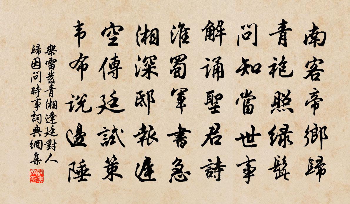 詩詞名句歷史字典書法欣賞書法字典國語詞典說文解字康熙字典古漢語字典標 題 作 者 詩 句 青湘逢廷對人歸因問時事作者:樂雷發 朝代:宋代青湘逢廷對人歸因問時事原文南客帝鄉歸,青袍照綠髭。問知當世事,解誦聖君詩。淮蜀軍書急,湘深邸報遲。空傳廷試策,韋布說邊陲。詩詞問答問:青湘逢廷對人歸因問時事的作者是誰?答:樂雷發問:青湘逢廷對人歸因問時事寫於哪個朝代?答:宋代樂雷發青湘逢廷對人歸因問時事書法欣賞青湘逢廷對人歸因問時事書法作品詩詞推薦壺春堂范成大〔宋代〕松漠丹成去不歸,龍髯無復有攀時。芳園留得觚稜在,長與都人作淚垂。舟中枕上顧逢〔宋代〕官塘來往纖紛紛,月入疏篷漏碎紋。數盡寒更天未曉,兩三聲雁枕邊聞。秋山顧炎武〔清代〕秋山復秋水,秋花紅未已。烈風吹山岡,磷火來城市。天狗下巫門,白虹屬軍壘。可憐壯哉縣,一旦生荊杞。歸元閒樂文同〔宋代〕晝睡忽過午,好風吹竹床。溪雲生薄暮,山雨送微涼。粉裛衣裳潤,蘭薰簟席香。歸來閒且樂,多謝墨君堂。頌古釋慧空〔宋代〕泥人煅就九轉丹,石女一喫乘飛鸞。天門九重彈指間,再拜天帝除天官。瓜期既及風馭還,海變桑田知幾番。又尋田家即事八首趙蕃〔宋代〕老屋愁風破,空林過雨乾。飄零黃葉滿,寂寞野香殘。和杜七學士見寄韓維〔宋代〕謀猷久恨辜明主,骸骨終蒙賜老臣。絕口敢論當世事,放懷重老故園春。閒尋物外忘言客,喜遇杯中得趣人。能作鴻禧觀次高橫槎韻趙孟堅〔宋代〕秦望與蘭亭,山山遞送迎。蓴鱸方嫩美,草木亦欣榮。去繼漢疏傅,名肩齊魯生。鴻都讀遺事,誰不動歸情。和羅巨濟山居十詠楊萬里〔宋代〕世方爭速化,渠獨請真祠。意在升沉外,官無冷熱宜。山如輞川盡,地似習家池。若道閒居懶,如何有十詩。道情鄭燮〔清代〕老頭陀,古廟中, * 香,自打鐘。兔葵燕麥閒齋供。山門破落無關鎖,斜日蒼黃有亂松。秋星閃爍頹垣縫。黑漆壬寅年南遊至衢州鄭剛中〔宋代〕分開平綠渡寒溪,溪外垂空日腳低。城郭重重隨望遠,峰巒處處與雲迷。窮通默定非難識,勞逸時間太不齊。又向湖塘夜歸陸游〔宋代〕漁翁江上佩笭箵,一卷新傳范蠡經。鬱郁林間桑椹紫,芒芒水面稻苗青。雲邊築舍分南北,陌上逢人半醉醒。莫恨呈段元衡趙蕃〔宋代〕君從桂林來,我欲衡陽去。邂逅一尊同,飄流數年敘。我未長沙去,君復衡陽來。還思數年隔,更遣五言裁。我歸田不伐玉磬歌吳則禮〔宋代〕田侯玉磬何瑰奇,吳子見之俄朵頤。宣王石鼓氣忽喪,摩挲篆刻還嗟咨。作止休論惟柷敔,曾窺兩階舞乾羽。常臨浪淘沙韓元吉〔宋代〕鶗鴂怨花殘。誰道春闌。多情紅藥待君看。濃澹曉妝新意態,獨占西園。風葉萬枝繁。猶記平山。五雲樓映玉成盤歲暮江軒寄盧端公趙嘏〔唐代〕積水生高浪,長風自北時。萬艘俱擁棹,上客獨吟詩。路以重湖阻,心將小謝期。渚雲愁正斷,江雁重驚悲。笑憶山行陳宗禮〔宋代〕川原綠已張,春去今何在。深樹涵幽姿,微雲弄晴態。禽聲互酬應,林霏閒明晦。漸遠人跡稀,清音自虛籟。寄梅村山人毛直方〔宋代〕古松樹下書陰寒,雲亦何心去不還。卻怪建州城裹夢,一春多在湛廬山。花降圖唐寅〔明代〕窗滿蕉蔭小洞天,香風時度竹欄邊。東君管領春無價,笑倩金蓬上玉肩。李堅甫淨居雜題一十三首秋軒文同〔宋代〕清飈動蕭瑟,翠樾減婆娑。卻愛夜來月,滿窗寒影多。名句推薦朝騁騖兮江皋,夕弭節兮北渚;屈原《九歌》 鳥之將死,其鳴也哀;人之將死,其言也善。孔子弟子《論語·泰伯篇》 飛雪過江來,船在赤欄橋側。呂渭老《好事近·飛雪過江來》 雲開汶水孤帆遠,路繞樑山匹馬遲。高適《東平別前衛縣李寀少府 / 送前衛縣李宷少府》 後不乏人,榮之方久,賢者自苦亦惠嗣。來俊臣《羅織經·固榮卷第六》 爾來從軍天漢濱,南山曉雪玉嶙峋。陸游《金錯刀行》 人迷洞庭水,雁度瀟湘煙。李白《郢門秋懷》 年年端午風兼雨,似為屈原陳昔冤。趙蕃《端午三首》 欲加之罪,其無辭乎?左丘明《左傳·僖公·僖公十年》 流丸止於甌臾,流言止於知者。荀子《荀子·大略》
