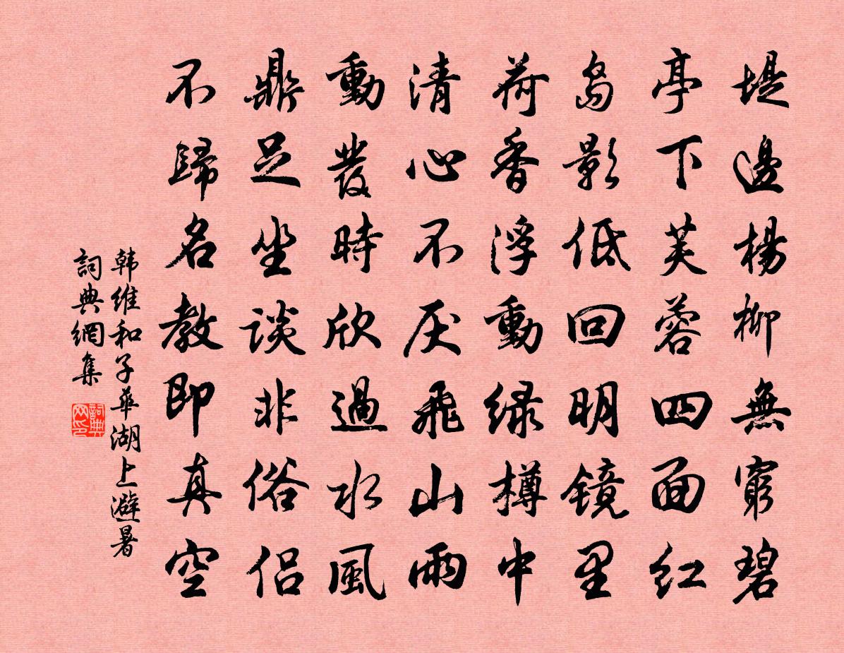 詩詞名句歷史字典書法欣賞書法字典國語詞典說文解字康熙字典古漢語字典標 題 作 者 詩 句 和子華湖上避暑作者:韓維 朝代:宋代和子華湖上避暑原文堤邊楊柳無窮碧,亭下芙蓉四面紅。島影低回明鏡里,荷香浮動綠樽中。清心不厭飛山雨,動發時欣過水風。鼎足坐談非俗侶,不歸名教即真空。詩詞問答問:和子華湖上避暑的作者是誰?答:韓維問:和子華湖上避暑寫於哪個朝代?答:宋代韓維和子華湖上避暑書法欣賞和子華湖上避暑書法作品詩詞推薦霜天曉月韓玉〔宋代〕竹籬茅屋。一樹扶疏玉。客里十分清絕,有人在、江南北。佇目。詩思促。翠袖倚修竹。不是月媒風聘,誰人與、洞霄宮陳堯佐〔宋代〕二天封部稼如雲,流水清寒出洞門。更愛林間盤石上,松花飄落羽人樽。送趙書記二首王柏〔宋代〕只將精識作生涯,評古論今吐粲花。玉潔冰清官自大,雲飛川詠吏無嘩。偉人落落難重見,餘子紛紛未足夸。老我皇后廟十五首真宗〔宋代〕初陽作配,內助惟賢。柔順中積,英徽外宣。神宮有侐,明祀惟虔。歆誠降祐,永奉粲盛。句裴愈〔宋代〕楊柳影疏秋霽月,梧桐葉墜夕陽天。高士詠顏歜吳筠〔唐代〕高哉彼顏歜,逸氣陵齊宣。道尊義不屈,士重王來前。榮祿安可誘,保和從自然。放情任所尚,長揖歸山泉。劉守生日馮時行〔宋代〕天清池淨行清秋,帝命吉祥驅蓐收。九霄墜露濯仙骨,冰壺翠鑒塵不留。十年持節東西州,繡衣輝煌照遐陬。山之陸元鈞寄日注茶晃沖之〔宋代〕我昔不知風雅頌,草木獨遺茶比風。陋哉徐鉉說茶苦,鵒民淇園竹同種。又疑禹漏稅九州,橘柚當年錯包貢。腐儒簡沖牆庵中故人曹勛〔宋代〕寄跡臨安久,思歸夕夢頻。愁多難強醉,病苦故禁人。夜短無清夢,年高嘆幻身。出中有道伴,雲壑擅余春。醉落魄/一斛珠周密〔宋代〕餘寒正怯。金釵影卸東風揭。舞衣絲損愁千褶。一縷楊絲,猶是去年折。臨窗擁髻愁難說。花庭一寸燕支雪。春花偈頌二十五首釋普岩〔宋代〕日面月面,霹靂閃電。直下來也,急著眼看。留姜山怡雲見訪二絕並呈李磐庵文授釋寶曇〔宋代〕天遣今年到五夫,還如雪後望西湖。磬庵老子今詩伯,紅葉盈庭許屢書。水調歌/水調佚名〔宋代〕稱彼兕觥後,三日是中元。地官較善,龍章玉珮壓仙班。自是德星孕秀,直與壽星爭耀,茨福正綿綿。堂已富金玉子玉家宴用前韻見寄復答之蘇軾〔宋代〕自酌金樽勸孟光,更教長笛奏伊涼。(子玉家有笛妓。)牽衣男女繞太白,扇枕郎君煩阿香。詩病逢春轉深痼,愁送淳上人游九岩王銍〔宋代〕殘菊孤花留暮秋,勞師問路亂山頭。九岩只望孤雲去,舒捲如雲得自由。送李余往湖南賈島〔唐代〕昔去候溫涼,秋山滿楚鄉。今來從辟命,春物遍涔陽。岳石掛海雪,野楓堆渚檣。若尋吾祖宅,寂寞在瀟湘。張文裕輓詞蘇軾〔宋代〕高才本出朝廷右,能事空推德業餘。每見便聞曹植句,至今傳寶魏華書。濟南名士新凋喪,劍外生祠已潔除。欲寄和令狐相公春早朝回鹽鐵使院中作劉禹錫〔唐代〕柳動御溝清,威遲堤上行。城隅日未過,山色雨初晴。鶯避傳呼起,花臨府署明。簿書盈几案,要自有高情。觀文殿學士趙公輓詞樓鑰〔宋代〕千古盛周宗,皇朝實比隆。位多窮貴爵,誰見立王功。一語國先定,寸心天與通。龍飛稽事實,信史詔無窮。送楊郎中唐員外奉使湖南徐鉉〔唐代〕江邊微雨柳條新,握節含香二使臣。兩綬對懸雲夢日,方舟齊凡洞庭春。今朝草木逢新律,昨日山川滿戰塵。同是名句推薦夢裡不知身是客,一晌貪歡。李煜《浪淘沙令·簾外雨潺潺》 亂鴉三四點,愁坐話無憀。陳維崧《臨江仙·寒柳》 虛則知實之情,靜則知動者正。韓非及後人《韓非子·主道》 雲物淒涼拂曙流,漢家宮闕動高秋。趙嘏《長安晚秋 / 秋望 / 秋夕》 月明船笛參差起,風定池蓮自在香。秦觀《納涼》 君看六幅南朝事,老木寒雲滿故城。韋莊《金陵圖》 夫眾喣漂山,聚蚊成雷班固《漢書·傳·景十三王傳》 灞橋楊柳年年恨,鴛浦芙蓉葉葉愁。蘇庠《鷓鴣天·楓落河梁野水秋》 霸圖今已矣,驅馬復歸來。陳子昂《燕昭王》 文豈有常體,但以有體爲常李大師、李延壽《南史·列傳·卷三十二》
