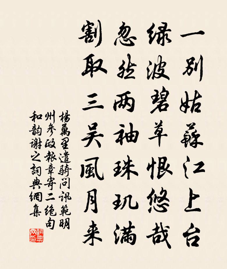 一別姑蘇江上台,綠波碧草恨悠哉。忽然兩袖珠璣滿,割取三吳風月來。
