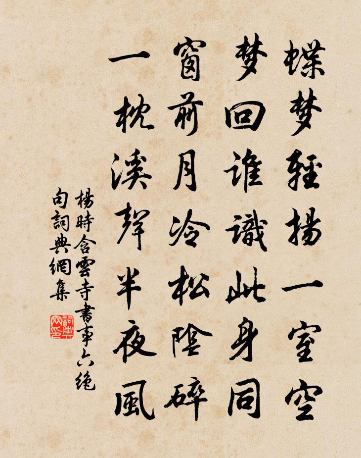 詩詞名句歷史字典書法欣賞書法字典國語詞典說文解字康熙字典古漢語字典標 題 作 者 詩 句 含雲寺書事六絕句作者:楊時 朝代:宋代含雲寺書事六絕句原文蝶夢輕揚一室空,夢回誰識此身同。窗前月冷松陰碎,一枕溪聲半夜風。詩詞問答問:含雲寺書事六絕句的作者是誰?答:楊時問:含雲寺書事六絕句寫於哪個朝代?答:宋代楊時含雲寺書事六絕句書法欣賞含雲寺書事六絕句書法作品詩詞推薦西湖徐僑〔宋代〕群巒回照紫瀰漫,坐攬湖光風不寒。最惜傍欄鳧鷺狎,往來不作眼生看。滿庭芳(壽黃狀元·三月初八)黃判院〔宋代〕桃浪翻花,柳風飄絮,翠蓂八葉呈芳。奎星初度,箕宿耀祥光。元是降神崧岳,生英傑、奇偉非常。文章士,青春舟下建溪方惟深〔宋代〕客航收浦月黃昏,野店無燈欲閉門。倒出岸沙楓半死,繫舟猶有去年痕。次韻王定國謝韓子華過飲蘇軾〔宋代〕楚有孫叔敖,長城隱千里。哀哉練裙子,負薪躡破履。豈無故交親,逝去如覆水。不如老優孟,談笑托諧美。世家長平箭頭歌李賀〔唐代〕漆灰骨末丹水沙,淒淒古血生銅花。白翎金竿雨中盡,直餘三脊殘狼牙。我尋平原乘兩馬,驛東石田蒿塢下。風長宿高唐州文天祥〔宋代〕早發東阿縣,暮宿高唐州。哲人達幾微,志士懷隱憂。山河已歷歷,天地空悠悠。孤館一夜宿,北風吹白頭。乙巳三月十五日監察御史王東溪節宿戒方回萬方回〔宋代〕世間春暖此間寒,萬樹陰陰萬竹攢。驄馬來遊人不避,畫龍誰寫我頻看。餘生久已忘三黜,高會猶容預四難。閒賞齋前紅黃心芍藥張明中〔宋代〕斗絕山原春亦妍,一欄紅藥小池邊。淡妝玉臉半醒醉,高擁檀心相後先。頭重小垂嬌眩日,肌明偏喜掩輕煙。如何次韻因上人晚菊簡魏定父王之道〔宋代〕道人如青松,孤高不成業。愛此黃金花,蕭然有淳風。新詩皎秋月,警我野性慵。佳意不在酒,此身今醉翁。石壁泉熊禾〔宋代〕一滴流漿石骨穿,於今一掬掃炎氛。鶴仙業已成陳跡,瀑布聲中隱劍痕。歲晏洪咨夔〔宋代〕得路只輪車易上,失時獨幅被難眠。淡黃虀飯茅柴酒,東掩西遮也過年。夔門汪元量〔宋代〕赤甲山連白帝山,三巴三峽百牢關。孤舟行客愁無那,十二峰前十二灘。崇政殿試御試貢士中昃不暇食因私賦宋庠〔宋代〕曩聖勤周日,虛懷軫睿思。方圖天輯命,詎恤食踰時。坐誡繁機壅,居忘側景疲。眷賢資德飽,詢善尉調飢。事帝採桑子晏幾道〔宋代〕花時惱得瓊枝瘦,半被殘香。睡損梅妝,紅淚今春第一行。風流笑伴相逢處,白馬游韁。共折垂楊,手捻芳條說夜杏花天(賦昭君)周密〔宋代〕漢宮乍出慵梳掠。關月冷、玉沙飛幕。龍香撥重春蔥弱。一曲哀弦謾托。君恩厚、空憐命薄。青冢遠、幾番花落。孫倅書尾附二詩曹勛〔宋代〕南徐作別抵閩鄉,三見春風換眾芳。若對舊遊知識問,為言羈旅鬢成霜。芍藥三首賈似道〔宋代〕又是揚州芍藥時,花應笑我賦歸遲。滿堂留得春如畫,對酒何妨鬢似絲。玉立黃塵那可到,錦圍紅蠟最相宜。買山次韻黃玉如求記許月卿〔宋代〕先子北山書劍留,山川還自舊相繆。與君去歲銜杯處,遣我長歌陟岵游。瘦鶴風輕霜檜舞,歸鴉煙重晚林投。中齋柳梢青佚名〔宋代〕有個人人。海棠標韻,飛燕輕盈。酒暈潮紅,羞娥凝綠,一笑生春。為伊無限傷心。更說甚、巫山楚雲。斗帳香消昨訪箳篂聞有繡帨之宴回車戲呈季茂岳珂〔宋代〕昨朝華宴想清歡,今日床頭未整冠。已奶酒腸孤夜醉,更驚病骨 * 。多情條脫參差是,一抹琵琶錯雜彈。老眼名句推薦戍客望邊邑,思歸多苦顏。李白《關山月》 飛鳥沒何處,青山空向人。劉長卿《餞別王十一南遊》 遊子乍聞征袖濕,佳人才唱翠眉低。鄭谷《鷓鴣》 水流花謝兩無情,送盡東風過楚城。崔塗《春夕》 今宵酒醒何處?楊柳岸,曉風殘月。柳永《雨霖鈴·寒蟬淒切》 更滿眼、殘紅吹盡,葉底黃鸝自語。韓元吉《薄倖·送安伯弟》 能令暫開霽,過是吾無求。韓愈《洞庭湖阻風贈張十一署·時自陽山徙掾江陵》 厭見千門萬戶,經過北里南鄰。王維《田園樂七首·其一》 君子和而不流;強哉矯。中立而不倚;強哉矯。國有道,不變塞焉;強哉矯。國無道,至死不變;強哉矯。子思《中庸·第十章》 山高必有怪,嶺峻卻生精。吳承恩《西遊記·第二十七回》