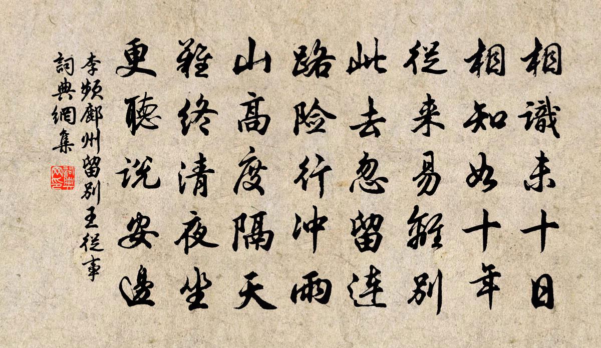 詩詞名句歷史字典書法欣賞書法字典國語詞典說文解字康熙字典古漢語字典標 題 作 者 詩 句 鄜州留別王從事作者:李頻 朝代:唐代鄜州留別王從事原文相識未十日,相知如十年。從來易離別,此去忽留連。路險行沖雨,山高度隔天。難終清夜坐,更聽說安邊。詩詞問答問:鄜州留別王從事的作者是誰?答:李頻問:鄜州留別王從事寫於哪個朝代?答:唐代問:鄜州留別王從事是什麼體裁?答:五律李頻鄜州留別王從事書法欣賞鄜州留別王從事書法作品注釋全唐詩:卷588-34詩詞推薦送休師歸長沙寧覲齊己〔唐代〕高堂親老本師存,多難長懸兩處魂。已說戰塵消漢口,便隨征棹別荊門。晴吟野闊無耕地,晚宿灣深有釣村。他日沙岡待潮游君傳〔宋代〕待潮舟閣淺邊岡,少憩田園竹樹涼。數點弄秋疏雨過,槿花籬落帶斜陽。瓦廟李廌〔宋代〕柱側檐欹瓦欲飄,斷垣苔澀樹蕭蕭。滿庭荒草無香火,惟有禽聲伴寂寥。三十年來尋劍客志勤〔唐代〕三十年來尋劍客,幾回落葉又抽枝。自從一見桃花後,直至如今更不疑。山居雜詩九十首曹勛〔宋代〕閒里心情拙,還知興自嘉。飢鴉時立檻,野蝶自尋花。客至聊從容,僧來不厭茶。晚煙時佇立,列岫映餘霞。閣夜杜甫〔唐代〕歲暮陰陽催短景,天涯霜雪霽寒宵。五更鼓角聲悲壯,三峽星河影動搖。野哭幾家聞戰伐,夷歌數處起漁樵。臥龍薙草李廌〔宋代〕宿草競春力,階除日青青。何心愿滋茂,薙去輒復生。一氣養萬類。蘭藥盡勾萌。何當紉余佩,采採擷芳英。【雙調】碧玉簫 八關漢卿〔元代〕紅袖輕揎,玉筍挽鞦韆。畫板高懸,仙子墜雲軒。額殘了翡翠鈿,髻鬆了柳葉偏。花徑邊,笑捻春羅扇。H,玉腕題象山縣棲霞觀應真亭簡住持張弱士宋伯仁〔宋代〕杜鵑聲裹立東風,山色應憐鬢已蓬。二麥曉寒新雨後,一年春事落花中。醉斟浮蚊邀仙客,笑揖飛鷗問釣翁。檐個絕句六十四首張伯端〔宋代〕一陽才動作丹時,鉛鼎溫溫照幌帷。受氣之初容易識,抽添運用且防危。寄龔漕六首吳芾〔宋代〕自古知心不易逢,君心還與我心同。縱令自擇交成契,更有何人得似公。和嘉州通判賈元升見贈馮時行〔宋代〕山城鳥鵲喜,佳句來春風。浣手三過讀,散我磈磊胸。當年過秦論,千載猶為雄。今觀妙好辭,蹀躞追前蹤。文章道州觀野火呂溫〔唐代〕南風吹烈火,焰焰燒楚澤。陽景當晝遲,陰天半夜赤。過處若彗掃,來時如電激。豈復辨蕭蘭,焉能分玉石。蟲蛇偈頌一百零一首釋慧性〔宋代〕秋風離離,秋色依依。秋雲淡儜,秋月分輝。篆不彫之心印,狀似鐵牛之機。阿呵呵,力{內力外囗}希,再三撈游秀峰寺胡珵〔宋代〕攝身下蓬萊,放浪雲水跡。非無簡書畏,心賞寄泉石。亭亭雲間塔,勝地聞自昔。梯空上青冥,如鳥著兩翼。化城秋霖二首王禹偁〔宋代〕秋霖過百日,歲望終何如。嘉穀就穗生,茁茁垂青須。宿麥未入土,大田多泥塗。河闊不辨馬,原高恐生魚。時政王縣尉輓詞樓鑰〔宋代〕幹蠱恢才刃,誰能貨殖私。人皆競毫髮,我獨破藩籬。風雨空殘夢,池台愴昔時。板輿臨穴處,行道亦興悲。空上人乞頌釋法薰〔宋代〕冷泉近日飯籮空,無奈栽田歲不逢。有個休糧方子妙,衲僧競去問天童。游灞陵山嚴維〔唐代〕入山未盡意,勝跡聊獨尋。方士去在昔,藥堂留至今。四隅白雲閒,一路清溪深。芳秀愜春目,高閒宜遠心。潭分望金華山絕句四首趙蕃〔宋代〕一溪屈曲幾彎環,贏得金華四面看。雨黛欲收晴翠滴,忽然雲起又漫漫。名句推薦一丈夫兮一丈夫,千生氣志是良圖。李泌《長歌行》 皚如山上雪,皎若雲間月。卓文君《白頭吟》 宦情羈思共淒淒,春半如秋意轉迷柳宗元《柳州二月榕葉落盡偶題》 悲吟雨雪動林木,放書輟劍思高堂。李白《留別於十一兄逖裴十三游塞垣》 之子歸窮泉,重壤永幽隔。潘安《悼亡詩三首》 淇園春竹美,軍宴日椎牛。司馬光《送龔章判官之衛州·新及第》 夫百病者,多以旦慧晝安,夕加夜甚佚名《黃帝內經·順氣一日分為四時》 不要人夸顏色好,只留清氣滿乾坤。王冕《墨梅》 去年花里逢君別,今日花開已一年。韋應物《寄李儋元錫》 盛而不驕,勞而不矜其功。左丘明《國語·越語·范蠡進諫勾踐持盈定傾節事》