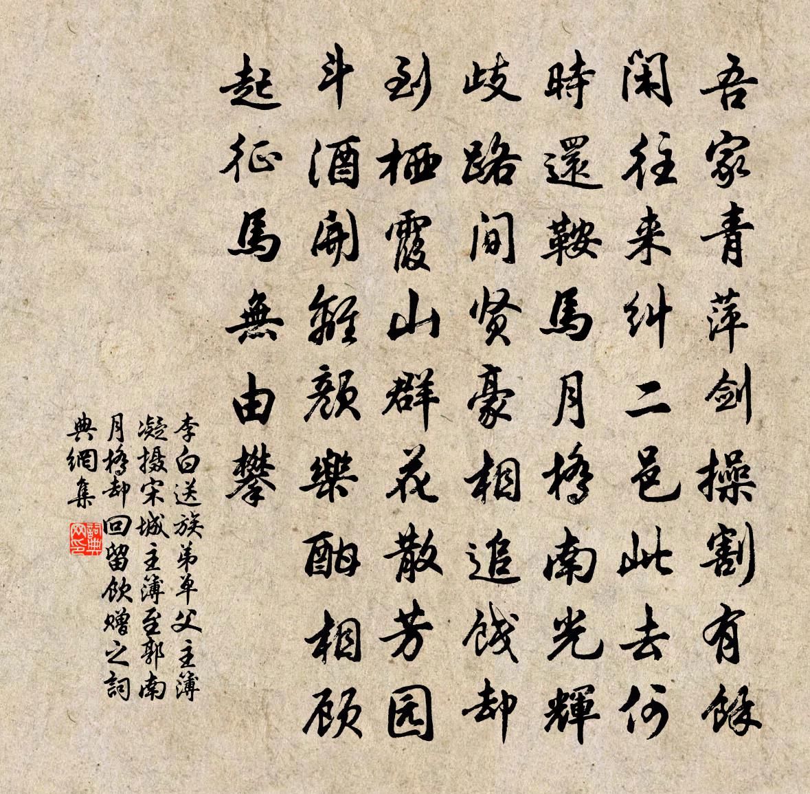 問:《送族弟單父主簿凝攝宋城主簿至郭南月橋卻回…留飲贈之》的作者是誰?答:李白