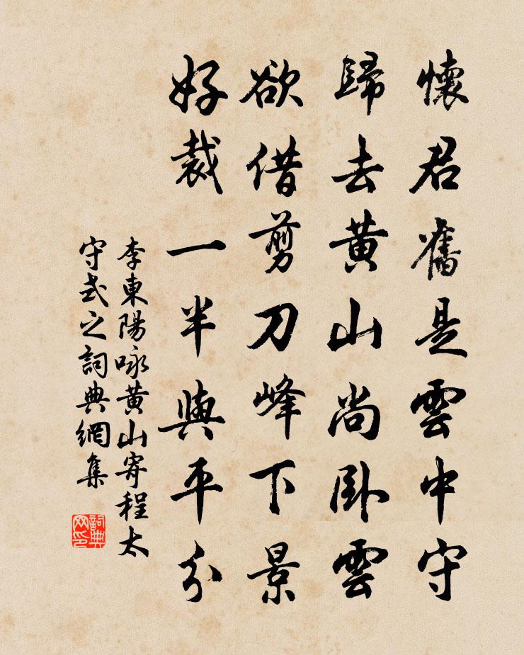 詩詞名句歷史字典書法欣賞書法字典國語詞典說文解字康熙字典古漢語字典標 題 作 者 詩 句 詠黃山寄程太守式之作者:李東陽 朝代:明代詠黃山寄程太守式之原文懷君舊是雲中守,歸去黃山尚臥雲。欲借剪刀峰下景,好裁一半與平分。詩詞問答問:詠黃山寄程太守式之的作者是誰?答:李東陽問:詠黃山寄程太守式之寫於哪個朝代?答:明代李東陽詠黃山寄程太守式之書法欣賞詠黃山寄程太守式之書法作品詩詞推薦題趙繼孫拙齋方回〔宋代〕曾顏得聖傳,何謂魯與愚。外察若不足,內朗實有餘。擇樹鵲巢高,罥蟲蛛網虛。曲士挾小智,豈不雄里閭。之子九鎖山十詠雲根石呂同老〔宋代〕吾聞泰山雲,觸石無不至。如何茲山中,有石象雲氣。仙人事狡獪,幻化翻手易。鱗鱗作薈蔚,冉冉涌蒼翠,清分褚家林亭皮日休〔唐代〕廣亭遙對舊娃宮,竹島蘿溪委曲通。茂苑樓台低檻外,太湖魚鳥徹池中。蕭疏桂影移茶具,狼藉蘋花上釣筒。爭得殘句:春將國艷熏花骨黃庭堅〔宋代〕春將國艷熏花骨,日借黃金縷水紋。賦得春風扇微和范傳正〔唐代〕曖曖當遲日,微微扇好風。吹搖新葉上,光動淺花中。澹蕩凝清晝,氤氳曖碧空。稍看生綠水,已覺散芳叢。徙倚閨情李白〔唐代〕流水去絕國,浮雲辭故關。水或戀前浦,雲猶歸舊山。恨君流沙去,棄妾漁陽間。玉箸夜垂流,雙雙落朱顏。黃鳥送金竺虔之官閩中曾國藩〔清代〕朋好翩翩去,君今傷此行。春風一杯酒,舊雨十年情。循吏平生志,神仙薄倖名。海隅氛正惡,看法斫長鯨。衡州九日詩江總〔隋代〕秋日正淒淒。茅茨復蕭瑟。姬人薦初醞。幼子問殘疾。園菊抱黃華。庭榴剖珠實。聊以著書情。暫遣他鄉日。約友秋賞衛宗武〔宋代〕秋霖盪殘暑,林飈鳴策策。乾坤灝氣浮,萬象互清發。望舒散天葩,拂拂余芬落。霽景行澄鮮,三五圓素魄。有園留題越州石氏山齋晏殊〔宋代〕書仙十閣壯儒宮,靈越山川實拋雄。岫柏亞香侵幾席,岩花回影入簾櫳。千秋碧鎖東南竹,一水清含旦暮風。文酒雨喜客過文同〔宋代〕積雨無所詣,十日不出屋。故人念端居,牢落如槁木。高軒過窮巷,下馬想慰沃。載酒酡楊顏,課飯飽桑腹。日暮法樂院陳岩〔宋代〕無住師參第一禪,指開古洞秀岩天。東扶西倒都休問,且結人間見在緣。偈頌一百二十三首釋祖欽〔宋代〕弄晴微雨顯春風,柳自青青花自紅。寄語遊人急回首,歌樓不在畫橋東。識時梅歌謝璡〔宋代〕寇至人遠避,寇退人復歸。歸來尋舊址,草蕪迷荒基。哀哉住傍梅,清夢常相依。可憐歲寒心,能識存亡機。不欲晚樓凝思張玉孃〔宋代〕鴛鴦繡罷閣新愁,獨抱雲和散書樓。風竹入統歸別調,湘簾卷月笑銀鈞。行天雁向寒煙沒,倚檻人將清滬流。自是次韻孫艮夫贈別吳錫疇〔宋代〕揚子江頭欸乃歌,一天星斗絡斜河。怕無才思堪風月,拾入奚囊未必多。嘉陵鄭谷〔唐代〕細雨濕萋萋,人稀江日西。春愁腸已斷,不在子規啼。頌古四十四首釋法泰〔宋代〕嵯峨萬仞是曹山,氣岸雄雄坐祖關。橫按鏌鋣全正令,太平寰宇斬痴頑。憶江南弟孟郊〔唐代〕白首眼垂血,望爾唯夢中。筋力強起時,魂魄猶在東。眼光寄明星,起來東望空。望空不見人,江海波無窮。衰老安溪勸農詩陳宓〔宋代〕汗顏為令已三年,二稅無因放汝錢。但願人人知務本,創地莫忘勸農篇。名句推薦人之性惡,其善者偽也。荀子《荀子·性惡》 脈脈花疏天淡,雲來去、數枝雪。范成大《霜天曉角·梅》 新啼痕壓舊啼痕,斷腸人憶斷腸人。王實甫《十二月過堯民歌·別情》 寂寞深閨,柔腸一寸愁千縷。李清照《點絳唇·閨思》 慟哭六軍俱縞素,衝冠一怒為紅顏。吳偉業《圓圓曲》 休言萬事轉頭空,未轉頭時皆夢。蘇軾《西江月·平山堂》 讀書如吃飯,善吃者長精神,不善吃者生痰瘤。袁枚《隨園詩話·卷十三》 黃雲隴底白雲飛,未得報恩不能歸。李頎《古意》 百畝庭中半是苔,桃花淨盡菜花開。劉禹錫《再游玄都觀》 若順吾皇意,即無臣子心。棲蟾《送遷客》