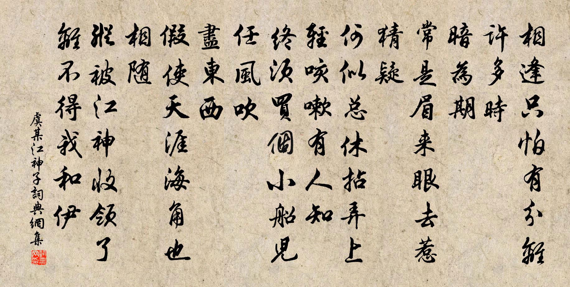 詩詞名句歷史字典書法欣賞書法字典國語詞典說文解字康熙字典古漢語字典標 題 作 者 詩 句 江神子/江城子作者:虞某 朝代:宋代江神子/江城子原文相逢只怕有分離。許多時。暗為期。常是眉來眼去、惹猜疑。何似總休拈弄上,輕咳嗽、有人知。終須買個小船兒。任風吹。盡東西。假使天涯海角、也相隨。縱被江神收領了,離不得、我和伊。詩詞問答問:江神子/江城子的作者是誰?答:虞某問:江神子/江城子寫於哪個朝代?答:宋代問:江神子/江城子是什麼體裁?答:詞虞某江神子/江城子書法欣賞江神子/江城子書法作品詩詞推薦天仙子(七月十五日壽內)陳亮〔宋代〕一夜秋光先著柳。暑力平明羞失守。西風不放入簾幃,饒永晝。沈煙透。半月十朝秋定否。指點芙蕖凝佇久。高處趙學士輓詩杜范〔宋代〕鼎盛彈冠地,胡然袖手居。自怡還自足,誰毀又誰譽。花竹人安在,芸蘭慶有餘。華塗驚素錦,行道盡欷噓。語松竹韋莊〔唐代〕庭前芳草綠於袍,堂上詩人慾二毛。多病不禁秋寂寞,雨松風竹莫騷騷。滿江紅佚名〔宋代〕雨過東郊,溪痕淺、山堂春曉。堪愛處,桃花流水,閒雲幽鳥。物表群分紅日□,天涯一點青山小。向綠陰、竹影燈夕韓使君惠谷簾泉章甫〔宋代〕憶昨嬉遊不忍閒,只今但欲掩柴關。短檠無恙客多病,明月有情天若慳。落日喔詩方袖手,故人憶我未還山。歸家劍李嶠〔唐代〕我有昆吾劍,求趨夫子庭。白虹時切玉,紫氣夜乾星。鍔上芙蓉動,匣中霜雪明。倚天持報國,畫地取雄名。縴夫詞陳維崧〔清代〕戰艦排江口。正天邊、真王拜印,蛟螭蟠鈕。徵發櫂船郎十萬,列郡風馳雨驟。嘆閭左、騷然雞狗。里正前團催後遣興吳則禮〔宋代〕放船秋正佳,日落雁噭初。晨炊儻無米,寧尋謝胡奴。督郵端可揮,從事良欲呼。大是陶淵明,且還讀吾書。大觀三年朝獻景宮二首真宗〔宋代〕威靈洋洋,靡有常{上鄉下同}。於惟欽承,來假來鄉。博碩芬香,是孫是享。奉器有虔,載德無爽。早發杜甫〔唐代〕有求常百慮,斯文亦吾病。以茲朋故多,窮老驅馳並。早行篙師怠,席掛風不正。昔人戒垂堂,今則奚奔命。濤翻遊學射山遇景道人陸游〔宋代〕肩輿適青郊,飛屐登翠麓。余霜未泫瓦,晨日初掛木。推門覓黃冠,避客似奔鹿。雖無與晤語,清坐意亦足。豈知冬日雜書六首張耒〔宋代〕短景冰霜地,人稀豹虎村。風連諸壑動,日帶亂山昏。浩蕩空回首,蕭條獨掩門。東周舊耆老,留滯飽知聞。擬李義山柳枝詞五首陳師道〔宋代〕莫解丁香結,從教長苦辛。郤因千種恨,別作一家春。將歸渭村先寄舍弟白居易〔唐代〕一年年覺此身衰,一日日知前事非。詠月嘲花先要減,登山臨水亦宜稀。子平嫁娶貧中畢,元亮田園醉里歸。為報次太守鄭安恭探梅過西湖韻二首張棟〔宋代〕金方正位鑿平湖,物景堪將入畫圖。兩岸雨垂楊柳重,一汀沙立鷺鷥孤。泓澄良夜搖明月,瀲灩高秋蘸碧蘆。寓目好事近汪莘〔宋代〕堂上掛黃山,輝映庭前春雪。記得山中雪境,恰一般清絕。須知天錫與方壺,比似鏡湖別。好得鏡湖狂客,伴方壺三界蘇泂〔宋代〕風日催曛暮,江溪半濁清。春寒歸雁急,沙遠落鷗驚。有志詩書誤,無家去就輕。短篷扃不寐,高枕念平生。絕句六十四首張伯端〔宋代〕萬物芸芸各返根,返根復命即長存。知常返本人難會,妄作招凶眾所聞。挽新昌呂修職陳傅良〔宋代〕不道千山阻,將遺百世名。有兒能自臻,此老已堪銘。祿豈無三釜,賢誰似一經。吾詞雖未就,應有護幽扃。鄰幾晚見過小飲韓維〔宋代〕朝居厭喧呶,暮坐若幽獨。忽聞江翁來,喜視樽中醁。所慚升斗微,不足滿君腹。強酌良勝無,逡巡怯行速。蕭蕭名句推薦十年一覺揚州夢,贏得青樓薄倖名。杜牧《遣懷》 月色入高樓,相思兩處愁。秋瑾《菩薩蠻·寄女伴》 一行足以玷終身,故古人飭躬若璧,惟恐有瑕疵也。王永彬《圍爐夜話·第四八則》 一者階於道,幾於神。姜子牙《六韜·文韜·兵道》 去歲江南見雪時,月底梅花發。張孝祥《卜運算元·雪月最相宜》 一派青山景色幽, 前人田地後人收。范仲淹《書扇示門人》 山從人面起,雲傍馬頭生。李白《送友人入蜀》 見說馬家滴粉好,試燈風裡賣元宵。符曾《上元竹枝詞》 大人者,不失其赤子之心者也。孟子《孟子·離婁章句下·第十二節》 春日載陽,有鳴倉庚。佚名《七月》