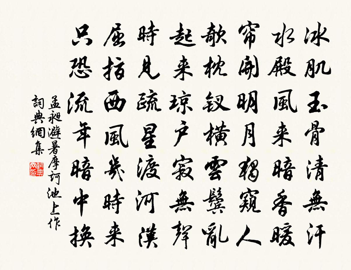 詩詞名句歷史字典書法欣賞書法字典國語詞典說文解字康熙字典古漢語字典標 題 作 者 詩 句 避暑摩訶池上作作者:孟昶 朝代:唐代避暑摩訶池上作原文冰肌玉骨清無汗,水殿風來暗香暖。簾開明月獨窺人,欹枕釵橫雲鬢亂。起來瓊戶寂無聲,時見疏星渡河漢。屈指西風幾時來,只恐流年暗中換。詩詞問答問:避暑摩訶池上作的作者是誰?答:孟昶問:避暑摩訶池上作寫於哪個朝代?答:唐代孟昶避暑摩訶池上作書法欣賞避暑摩訶池上作書法作品注釋全唐詩:卷8_34詩詞推薦二郎神長筌子〔元代〕訴衷情,為大地眾生淚灑。曉夜憂煎貪活路,盡都被、妻男相掛。使萬種機關圖富貴,全不怕、犁耨高架。勸愚迷題酒樓壁伊用昌〔唐代〕此生生在此生先,何事從玄不復玄。已在淮南雞犬後,而今便到玉皇前。梅根夾范成大〔宋代〕辛苦淩波棹,平安入夾船。日明漁浦綱,風側瓦窯煙。老圃容挑菜,村巫橫索錢。且投人處宿,終夜得佳眠。苦寒韓愈〔唐代〕四時各平分,一氣不可兼。隆寒奪春序,顓頊固不廉。太昊弛維綱,畏避但守謙。遂令黃泉下,萌牙夭句尖。草木南歌子(四之二)鄧肅〔宋代〕皓月明腮雪,冷風亂鬢雲。高樓簾幕夜生春。半醉倚人秋水、欲斜傾。曉雨雙溪漲,歸舟一葉輕。杳無青翼寄殷勤新樓詩二十首靈汜橋李紳〔唐代〕靈汜橋邊多感傷,分明湖派繞回塘。岸花前後聞幽鳥,湖月高低怨綠楊。能促歲陰惟白髮,巧乘風馬是春光。何須文宣王及其弟子贊宋高宗〔宋代〕辯以飾詐,言以致文。苟弗執禮,宜奠釋紛。朽木糞牆,置不足言。言語之科,粗然有聞。病中絕句范成大〔宋代〕石鼎颼颼夜煮湯,亂拖芝術斗溫涼。化兒幻我知何用?只與人間試藥方。李才翁懶窩林憲〔宋代〕檐雀樂儔侶,砌蛩相叫吟。如何片雲外,一點征遙禽。望極杳無伴,細聽有遺音。遲遲去卻返,啟我懷故林。二十九日依韻和洛陽陸剛叔主簿見贈邵雍〔宋代〕一霎蕭蕭晚雨余,鳳凰樓下偶驅車。郄詵片玉如能挹,樂廣青天幸未疏。相闊夏秋聞甚事,可親燈火讀何書。恨無思帝鄉溫庭筠〔唐代〕花花,滿枝紅似霞。羅袖畫簾腸斷,卓香車。回面共人閒語,戰篦金鳳斜。唯有阮郎春盡,不歸家。賀謝景芳得第四男王邁〔宋代〕每愛君家玉滿階,仙宮今又見琨台。父兮定得鈴旗夢,母也須懷磬石胎。羯末封胡和有種,復臨泰壯看朋來。林家雜感陸游〔宋代〕少年意氣與春爭,朱彈金鞭處處行。誰信即今空谷里,旋租黃犢學躬耕。汪校正送鸚鵡方岳〔宋代〕山中寂寞無與語,隴客適從何許來。每慨俗人言少味,寧知凡物忌多才。關山坐隔月千里,湖海相忘酒一杯。畢竟病中聞鶯啼曾幾〔宋代〕獨園森古木,其下客幽棲。盡日綠陰合,有時黃鳥啼。一聲添晝寂,百囀使人迷。賴汝生佳聽,身今氣慘恓。和康提刑過端州陳懌〔宋代〕舊曆江山眼重開,平成搖轡賞嵩台。晉康假道昔為守,按部今持使節來。花市顧逢〔宋代〕賣聲喧市巷,紅紫售東風。只說春無價,誰知雨有功。蝶隨群檐出,鶯恨故園空。松柏何人愛,甘心岩壑中。次韻葉教二首王阮〔宋代〕但有形如槁,元無貨可珍。四方長逆旅,一念即明神。漫仁緣將母,非材敢教人。無功叨廩祿,祗覺蠹吾民。賢者之孝二百四十首裴子余林同〔宋代〕直以孝為謚,真無愧此心。可憐張說嘆,知得子余深。觀棋胡寅〔宋代〕平地縱橫十九餘,古今爭向此中消。乾坤二策歸皇極,愚智殊途祖帝堯。競勝鮮能思自活,臨機誰肯暫相饒。旁觀名句推薦接漢疑星落,依樓似月懸。盧照鄰《十五夜觀燈》 黃雲隴底白雲飛,未得報恩不能歸。李頎《古意》 梅以曲為美,直則無姿;龔自珍《病梅館記》 榮寵有初,鮮有終者;吉凶無常,智者少禍。來俊臣《羅織經·固榮卷第六》 畫樓春早,一樹桃花笑。凌廷堪《點絳唇·春眺》 酒亂性,色迷人。施耐庵《水滸傳·第四十五回》 二十四橋仍在,波心蕩、冷月無聲。姜夔《揚州慢·淮左名都》 柳外輕雷池上雨,雨聲滴碎荷聲。歐陽修《臨江仙·柳外輕雷池上雨》 知不知,上矣。過者之患,不知而自以為知。呂不韋《呂氏春秋·論·似順論》 槲葉落山路,枳花明驛牆。溫庭筠《商山早行》