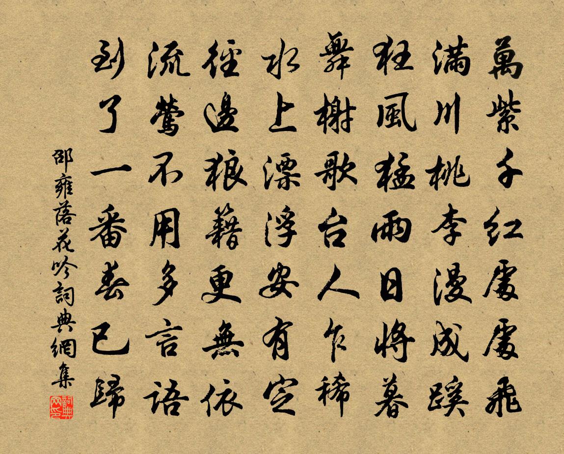詩詞名句歷史字典書法欣賞書法字典國語詞典說文解字康熙字典古漢語字典標 題 作 者 詩 句 落花吟作者:邵雍 朝代:宋代落花吟原文萬紫千紅處處飛,滿川桃李漫成蹊。狂風猛雨日將暮,舞榭歌台人乍稀。水上漂浮安有定,徑邊狼籍更無依。流鶯不用多言語,到了一番春已歸。詩詞問答問:落花吟的作者是誰?答:邵雍問:落花吟寫於哪個朝代?答:宋代邵雍落花吟書法欣賞落花吟書法作品詩詞推薦孫推內子輓詩洪咨夔〔宋代〕玉立金閨客,家人亦許清。共聽秋塞柝,細剔夜窗檠。娣袂從渠好,兒襦得我平。西風吹落葉,不盡夕陽明。次韻樂著作送酒蘇軾〔宋代〕少年多病怯杯觴,老去方知此味長。萬斛羈愁都似雪,一壺春酒若為湯。次韻樂著作天慶觀醮濁世紛紛肯下臨,夢疏影趙以夫〔宋代〕晴空漠膜。怪雪來底處,飄滿籬落。元是花神,管領春風,幽香忽遍林壑。玉仙緩轡江城路,全不羨、揚州東閣。太上皇后輓詩王炎〔宋代〕紫殿尊嚴地,黃圖揖遜辰。一言裨大策,萬物賴深仁。配極乾坤大,重輪日月新。遽違天下養,氛祲掩鉤陳。鏡湖蘇泂〔宋代〕蒼蒼煙霽塔,了了月明山。坐久忽不見,蒙蒙杳杳間。偈頌一百零二首釋紹曇〔宋代〕雪峰輥撲,睦州擔板。展盡神通,搆和一半。那一半,戴嵩牛臥綠楊陰,韓乾馬嘶芳草岸。賀若弼徐鈞〔宋代〕乃翁永訣語堪悲,果定江南副所期。守口未能終死舌,如何忘卻刺錐時。題靈鰻廟三首舒坦〔宋代〕亘古人間蒙潤澤,數泓雲底貯清泠。功將名並山無泐,道與人尊地轉靈。曉殿千家供香火,旱天萬里入風霆。誰知過九坡葛立方〔宋代〕行盡千山與萬山,鍾情偏在此煙嵐。海波神闕今饒六,仙女巫峰尚欠三。雨潤蒙條生翠滴,雲封疊穎瑩脂涵。卻思水調歌頭(同張子儀諸公泛舟北渚,席間用子儀韻)管鑒〔宋代〕平生五湖興,夢想白苹洲。只今何處,捲簾波影漾風鉤。況值晚天新霽,菱葉荷花如拭,香翠擁行舟。卻為湖山好司空山歌釋擇崇〔宋代〕司空山,在雲外,時人到得方自在。我今隨力幸登臨,四顧巍巍無向背。絕遮攔,難比況,千山萬山齊恃仰。九夏偶書邵雍〔宋代〕美食無使饜,饜則不能受。善人無使倦,倦則不能久。官小拜人喜,官高拜人恥。官職自外來,中心何若此。立春帖子皇帝閣周必大〔宋代〕延英議政恰朝還,選德觀書時暫閒。晝漏稍衡高合報,教添內引兩三班。採桑子晏幾道〔宋代〕鞦韆散後朦朧月,滿院人閒。幾處雕闌。一夜風吹杏粉殘。昭陽殿里春衣就,金縷初乾。莫信朝寒。明日花前試舞下第寄友人馬戴〔唐代〕金門君待問,石室我思歸。聖主尊黃屋,何人薦白衣?年來御溝柳,贈別雨霏霏。日射李商隱〔唐代〕日射紗窗風撼扉,香羅拭手春事違。迴廊四合掩寂寞,碧鸚鵡對紅薔薇。淳化鄉飲酒三十三章佚名〔宋代〕嬉嬉南陔,眷眷慈顏。和氣怡色,奉甘興鮮。事親是宜,事君是思。虔勖忠孝,邦家之基。留題龍門二首呂公著〔宋代〕誰將長劍斬長蛟,斬斷長蛟劍復韜。爪尾蜿蜒凝華岳,角牙獰惡結蒿高。骨傷兩處嶄蒼壁,血出東流洶巨濤。此物和李子儀學士上元蘇頌〔宋代〕傾都繁盛數宵中,知是鈞天第幾重。岧闕開筵紆警蹕,彩山張樂戲魚龍。月華高下隨燈麗,春色融和入酒濃。擬逐寄鄭天休宋祁〔宋代〕翹車交辟滯東南,盤蕙多年歇賜衫。千日醉醒孤共酌,一書開閉遂空函。怨歸定對王孫草,無恙應隨散騎帆。傾聽名句推薦工欲善其事,必先利其器。佚名《論語七則》 上善若水,水善利萬物而不爭。老子《老子·道經·第八章》 長安大雪天,鳥雀難相覓。張孜《雪詩》 黃河怒浪連天來,大響谹谹如殷雷。溫庭筠《拂舞詞 / 公無渡河》 萬事莫貴於義。墨子《墨子·47章 貴義》 撩亂邊愁聽不盡,高高秋月照長城。王昌齡《從軍行七首》 寒食時看郭外春,野人無處不傷神。雲表《寒食詩》 黃葉覆溪橋,荒村唯古木。柳宗元《秋曉行南谷經荒村》 目失鏡,則無以正鬚眉;身失道,則無以知迷惑。韓非及後人《韓非子·觀行》 離宮絕曠,身體摧藏,志念沒沉,不得頡頏。王昭君《怨詞》