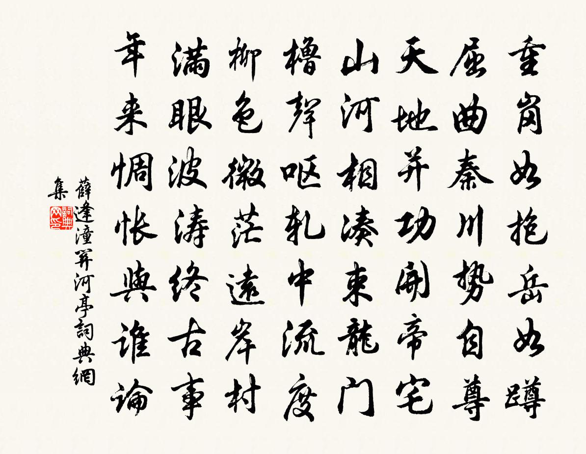 詩的前四句以渾灝之筆寫潼關形勝。“重崗如抱岳如蹲”一句造境雄奇挺健,“抱”、“蹲”二字勾畫潼關一帶山巒面貌,將西嶽華山雄鎮潼關的獨尊傳神地描摹出來,與杜甫詩句“西嶽崚.竦處尊,諸峰羅立似兒山孫”(《望岳》)同為傳神妙筆。這第一句從潼關附近山嶽的垂直空間下筆,給人以峻峭之感。“屈曲秦川勢自尊”,由橫向空間承接上句,潼關諸山曲折起伏,拱衛關中,形成天然屏障,自古以來,許多帝王憑藉此處險峻,建金城千里,為帝王之業。戰國末年,七雄逐鹿,商鞅說秦孝公“拒河山之固,東向以制諸侯,此帝王之業也”(《史記·商君列傳》),秦國借著關中地利一統天下。杜甫在《秋興八首》中曾稱“秦中自古帝王州”,可見秦川地形確有至尊之勢。薛逢在這裡巧妙地化用前人語句,將秦川帝居的尊嚴與潼關天險聯繫起來,更突出了潼關的山河形勝。“天地並工開帝宅”,寫秦中之“尊”,作為帝居的秦川山河,是天造地設,天地同力開闢出來的,它的險峻,決非區區人工雕琢所能為之的,這句驅天地於筆端,很能見出詩人的氣魄和詩才。“山河相湊束龍門”,筆力不減出句。龍門,在今山西河津縣西北與陝西韓城縣東北之間,此地兩岸峭壁對峙,形如闕門,黃河流至此地,因河床變窄,水流湍急,氣勢壯闊。相傳大禹治水,導河積石於此,故又稱禹門。龍門景象,非潼關河亭之可望,為了寫出“天地並功開帝宅”的自然壯觀,作者憑藉想像用一“湊”字,一“束”字,寫出萬壑群山與黃河同赴龍門的景象,以陡健之筆將龍門峽谷,千岩如奔,水流激射寫得逼真,使人如臨其境,聞其聲,見其勢,奇險嚇人。這句與杜甫“群山萬壑赴荊門”(《詠懷古蹟五首》其三)寫長江氣勢的雄奇壯麗同工。首二聯就潼關河亭展開粗線條的描繪。值得重視的是,詩人在這四句詩中,融時空為一體,而具體又以空間形式設定意象,在空間意象後面,潛藏著以潼關為屏障的秦中帝業發展史,這種潛伏的時間意識,為尾聯抒情留下伏筆。