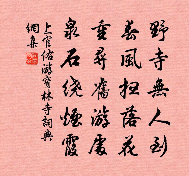 詩詞名句歷史字典書法欣賞書法字典國語詞典說文解字康熙字典古漢語字典標 題 作 者 詩 句 游寶林寺作者:上官佑 朝代:宋代游寶林寺原文野寺無人到,春風掃落花。重尋舊遊處,泉石繞煙霞。詩詞問答問:游寶林寺的作者是誰?答:上官佑問:游寶林寺寫於哪個朝代?答:宋代上官佑游寶林寺書法欣賞游寶林寺書法作品詩詞推薦西京崇德里居羅隱〔唐代〕進乏梯媒退又難,強隨豪貴殢長安。風從昨夜吹銀漢,淚擬何門落玉盤。拋擲紅塵應有恨,思量仙桂也無端。錦鱗孤山納涼姚勉〔宋代〕雙鷺窺荷弄水香,一蟬嘶柳送斜陽。京華涼處惟湖上,更有孤山第一涼。鄭丞相生日口號十首劉克莊〔宋代〕不用占蓍更訊龜,功成尚有赤松期。由來壽與仁相貫,季主君平未必知。西江月(又和前人)張繼先〔宋代〕蓬戶橫開岑寂,寒窗側映清暉。竹風偷入五香幃。還有好音相惠。須信毫芒可入,明珠胎里忘機。宵征夜宴是和非加頌蜀僧雪頌釋印肅〔宋代〕總是吾家入道門,無說說中聞不聞。步步透關田地穩,須彌{左足右孛}跳撞崑崙。答河南李士巽題香山寺韋應物〔唐代〕洛都遊宦日,少年攜手行。投杯起芳席,總轡振華纓。關塞有佳氣,岩開伊水清。攀林憩佛寺,登高望都城。蹉跎過八疊山陳造〔宋代〕路入於平舒倦眼,襄陽佳處亦班班。燒香峴好思三峴,八疊山高似萬山。喜此經行無雨阻,向來遊覽坐天慳。山靈池上作林逋〔宋代〕簇簇菰蒲映蓼花,水痕天影蘸秋霞。分明似個屏風上,飛起鵁鶄一道斜。不寐陸游〔宋代〕閏年九月已重裘,說著功名即自羞。病骨不禁霜氣峭,高風正送雁聲遒。半杯濁酒如欺老,一點青燈欲訴愁。不寐眼兒媚 呈周斡臣王惲〔元代〕桑榆晚景日**。莫厭數相尋。靜憐幽境,閒談情話,與滌煩襟。濟時幸有諸公在,鄉社好浮沉。閒雲卻恐,西風三月二十五日安之以詩二絕見招作真率會光以司馬光〔宋代〕直率由來無次第,經旬逾月不為稀。籃輿但恨無人舉,坐想紛紛醉落暉。句石延年〔宋代〕天寒河影淡,山凍瀑聲微。佛說偈宗澤〔宋代〕後學要說禪,教人學團謎。佛祖意分明,但為傳衣偈。江梅引·憶江梅洪皓〔宋代〕歲在壬戌,甫臨長至,張總侍御邀飲。眾賓皆退,獨留少款。侍婢歌江梅引,有“念此情、家萬里”之句,仆曰:寄梵天上方政侄釋智圓〔宋代〕一講更無事,悠然自不群。閒情江上月,孤跡檻前雲。徑冷秋苔合,杉寒宿鳥分。濤聲旦暮近,應向出禪聞。王太古偕游靈岩余以事中止先還陳深〔宋代〕峭峭孤峰起,蒼寒倚太虛。尚嫌凡子到,那被美人汙。霸業消磨盡,浮屠突兀居。憑高怕悽愴,興盡即回艫。浣溪沙(趙總憐以扇頭來乞詞,戲有此贈。趙能著棋、寫字、分茶、彈琴)向子諲〔宋代〕艷趙傾燕花里仙。烏絲闌寫永和年。有時閒弄醒心弦。茗碗分雲微醉後,紋楸斜倚髻鬟偏。風流模樣總堪憐。春晚緩步臥龍始盡見此山全體錢時〔宋代〕老眼山林自是宜,臥龍春晚夕陽遲。芒鞋竹杖經行遍,絕勝籃輿喝道時。贈歌者二首高駢〔唐代〕酒滿金船花滿枝,佳人立唱慘愁眉。一聲直入青雲去,多少悲歡起此時。公子邀歡月滿樓,雙成揭調唱伊州。便從酹江月侯善淵〔元代〕長江素靜,夜瀟瀟、天如玉案冰潔。秀色氤氳寥象廓,極目瑕琳光攝。獨坐頤神,簾幃光透,顯出玲瓏雪。凝然澄名句推薦木與木相摩則然,金與火相守則流莊子《莊子·雜篇·外物》 誰料同心結不成,翻就相思結。夏完淳《卜運算元·秋色到空閨》 青山一道同雲雨,明月何曾是兩鄉。王昌齡《送柴侍御》 瀚海百重波,陰山千里雪。李世民《飲馬長城窟行》 人皆欲多積財,石崇乃因多積財而喪命。王永彬《圍爐夜話·第七則》 霰雪紛其無垠兮,雲霏霏而承宇。屈原《九章》 知過必改,得能莫忘。周興嗣《千字文·全文》 算韶華,又因循過了,清明時候。王雱《倦尋芳慢·露晞向晚》 壽酒還嘗藥,晨餐不薦魚。錢起《送外甥懷素上人歸鄉侍奉》 古路無行客,寒山獨見君。劉長卿《碧澗別墅喜皇甫侍御相訪》