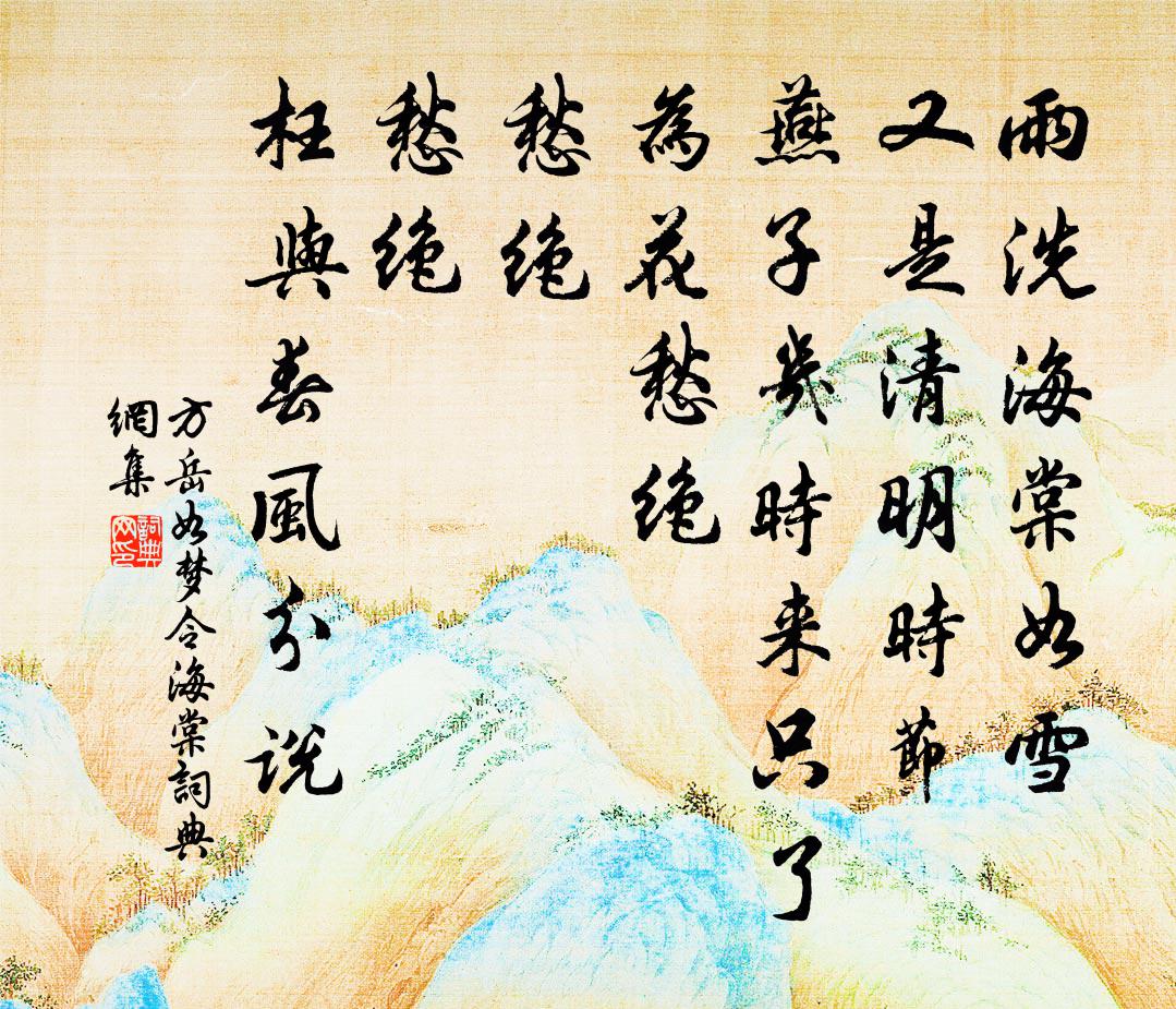 詩詞名句歷史字典書法欣賞書法字典國語詞典說文解字康熙字典古漢語字典標 題 作 者 詩 句 如夢令(海棠)作者:方岳 朝代:宋代如夢令(海棠)原文雨洗海棠如雪。又是清明時節。燕子幾時來,只了為花愁絕。愁絕。愁絕。枉與春風分說。詩詞問答問:如夢令(海棠)的作者是誰?答:方岳問:如夢令(海棠)寫於哪個朝代?答:宋代問:如夢令(海棠)是什麼體裁?答:詞方岳如夢令(海棠)書法欣賞如夢令(海棠)書法作品詩詞推薦讀史趙文〔宋代〕夾寨功名節節奇,門高事起更堪悲。身亡家破英雄笑,恰似伶官戲罷時。送陸侍御餘慶北使沈佺期〔唐代〕古人貴將命,之子出輶軒。受委當不辱,隨時敢贈言。朔途際遼海,春思繞轘轅。安得回白日,留歡盡綠樽。扶南曲歌詞五首王維〔唐代〕〔通典云:武德初,因隋舊制,奏九部樂,四曰扶南。唐書禮樂志云:天寶樂曲,皆以邊地名。自河西至者,有扶述行賦蔡邕〔兩漢〕延熹二年秋,霖雨逾月。是時梁翼新誅,而徐璜、左悺等五侯擅貴於其處。又起顯陽苑於城西,人徒凍餓,不得其落梅胡仲弓〔宋代〕謝娥三弄笛,昏恨五更風。樹老余香少,花殘瘦影空。深堆和靖墓,淺點壽陽宮。結果重來此,方知造化工。題三洞喻良能〔宋代〕千古巢仙地,嵌空本自然。一看三嘆息,十步九留連。似入華陽洞,疑通小有天。何時洗塵垢,來作枕流眠。歲在鍛丑年始七十年正旦日書事富弼〔宋代〕生聖明明許從心,山川風月恣游尋。此中若更論規矩,籍外閒人不易禁。陽春曲姚燧〔元代〕筆頭風月時時過,眼底兒曹漸漸多。有人問我事如何?人海闊,無日不風波。次韻章傳道喜雨(禱常山而得。)蘇軾〔宋代〕去年夏旱秋不雨,海畔居民飲鹹苦。今年春暖欲生蝝,地上戢戢多於土。預憂一旦開兩翅,口吻如風那肯吐。前時春日田園雜興許元發〔宋代〕片雲豈是出山時,曾被東風誤一吹。歸意不煩啼鴂動,閒情只許落花知。桑麻窮巷扉長掩,煙火空林黍自炊。粟里予解邑過杭遇介之學士謁告南歸強至〔宋代〕同時兩郡冠鄉書,屈指俄經一紀餘。顧我冗塗移蹇足,羨君榮路駕奔車。方從解紱辭岩邑,已見飛章厭石渠。自古挽遂初陳尚書王義山〔宋代〕到得鹹淳國步艱,幾回杭疏動天顏。丈夫那肯死牖下,餘子從教活草間。有分珠厓終著去,無心白髮望生還。故人緱山子晉祠以下陪太尉錢相公游嵩山七章其四梅堯臣〔宋代〕車馬雲外來,衣霞半山雨。弭節扣真居,捫蘿笑塵炬。回溪響石叢,靈茹抽岩塢。玉檻刻年華,應無愧前古。次韻高秘書謁陸待制二首蘇泂〔宋代〕海上三神宅,人間陸放翁。談諧詩雅詠,任己易屯蒙。松竹當姬侍,鷗禽是仆童。後來那可計,應有不如公。早行澠池道中強至〔宋代〕二年別鹹秦,八月過崤澠。碎石隱地起,險塗抱山轉。我馬無完蹄,我仆有重趼。林紅烈炬暴,澗白亂流淺。夙駕減字木蘭花陳汝羲〔宋代〕纖纖素手。盤裡醉花新點就。對葉雙心。別有東風意思深。瓊沾粉綴。消得玉堂留客醉。試嗅清芳。別有紅羅巧袖柳楊送客(一作揚州萬里送客)李益〔唐代〕青楓江畔白蘋洲,楚客傷離不待秋。君見隋朝更何事,柳楊南渡水悠悠。偈頌一百二十三首釋崇岳〔宋代〕第七個沒尾巴,不落群隊獨露爪牙。擬心湊泊終難見,須信蓮開火里花。再酬杜倅兩詩用前韻王洋〔宋代〕報導春風莫便回,少陵準心作詩材。公然背我堂堂去,略不隨人得得來。花占三春官已滿,河專一壑幕初聞。已知浣溪沙(水仙)楊 * 〔宋代〕仙子何年下太空。凌波微步笑芙蓉。水風殘月助惺忪。礬弟梅兄都在眼,銀台金盞正當胸。為伊一醉酒顏紅。名句推薦蛛絲暗鎖紅樓,燕子穿簾處。吳文英《荔枝香近·七夕》 與君別,相思一夜梅花發房舜卿《有所思》 客有哀時失職而聽者,淚淋浪以沾襟。李白《幽澗泉》 山路元無雨,空翠濕人衣。王維《山中》 記得武陵相見日,六年往事堪驚周紫芝《臨江仙·送光州曾使君》 種田不熟不如荒,養兒不肖不如無。馮夢龍《醒世恆言·卷十七》 朽木不可雕也,糞土之牆不可杇也,於予與何誅?孔子弟子《論語·公冶長篇》 日長唯鳥雀,春遠獨柴荊。杜甫《春遠 / 春運》 二分塵土,一分流水蘇軾《水龍吟·次韻章質夫楊花詞》 草秀故春色,梅艷昔年妝。李世民《元日》