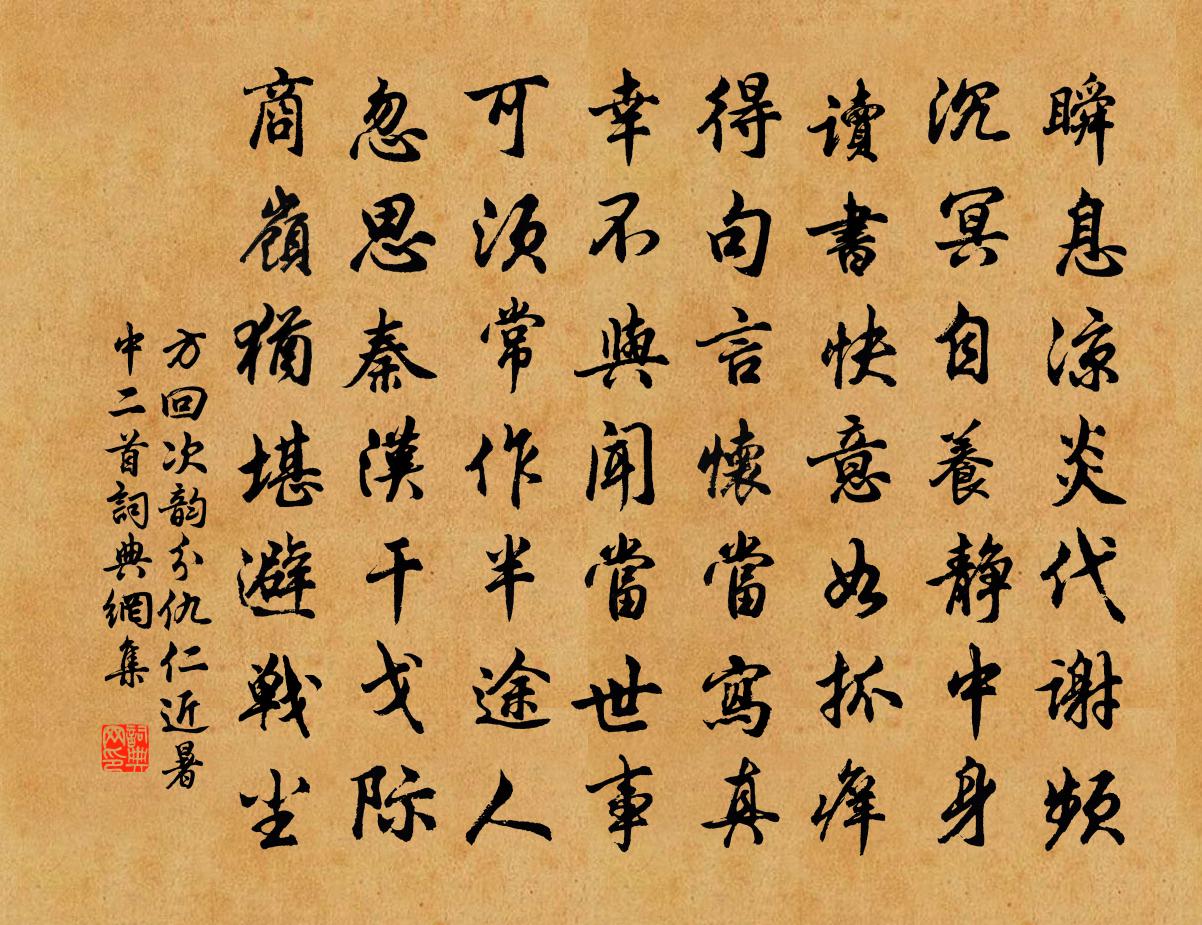 詩詞名句歷史字典書法欣賞書法字典國語詞典說文解字康熙字典古漢語字典標 題 作 者 詩 句 次韻分仇仁近暑中二首作者:方回 朝代:宋代次韻分仇仁近暑中二首原文瞬息涼炎代謝頻,沉冥自養靜中身。讀書快意如抓癢,得句言懷當寫真。幸不與聞當世事,可須常作半途人。忽思秦漢干戈際,商嶺猶堪避戰塵。詩詞問答問:次韻分仇仁近暑中二首的作者是誰?答:方回問:次韻分仇仁近暑中二首寫於哪個朝代?答:宋代方回次韻分仇仁近暑中二首書法欣賞次韻分仇仁近暑中二首書法作品詩詞推薦醉蓬萊佚名〔宋代〕正霜融日暖,兩兩蓂開,陽生時候。喜見文星,上有箕星照。須信岳神,儲降,誕作儒林秀。一舉登科,蟾宮穩步櫂歌九章寄彭鶴林白玉蟾〔宋代〕鷗飛梅山前,翠中一點雪。何處種聲來,雲梢推上月。句張林〔兩漢〕菱葉乍翻人采後,芰荷初沒舸行時。頌古一百二十一首釋宗杲〔宋代〕華陰山前百尺井,中有寒泉徹骨冷。誰家女子來照影,不照其餘照斜領。同群公題中山寺高適〔唐代〕平原十里外,稍稍雲岩深。遂及清淨所,都無人世心。名僧既禮謁,高閣復登臨。石壁倚松徑,山田多栗林。超遙寒飲御筵口號二首司馬光〔宋代〕雨意沉沉潑火餘,變龍盛集退朝初。酒肴絡繹來丹禁,冠劍參差下玉除。紫鳳歸飛雲爛熳,黃鸝新囀柳扶疏。麥禾芙蓉五絕呈景仁韓維〔宋代〕小沾清露細搖風,養得新花北第紅。客至莫教樽酒燥,朝吟夕賞未知窮。贈清逸魏閒處士宋祁〔宋代〕奕世依岩石,褒恩下帝庭。姓名高士傳,父子少微星。池溜遙通澗,家林近帶坰。分明詔書意,天極賜鴻冥。龍門洞陸游〔宋代〕我來香積寺,清晨歷龍門。孤峰撐蒼昊,大壑裂厚坤。古穴吹腥風,峭壁掛爪痕。水浮石楠花,崖絡菖蒲根。橫策頌古二十九首釋師體〔宋代〕昨夜發新雷,毒蛇離窟穴。居常口不開,蹋著迸鮮血。生日毛滂〔宋代〕要作人間浩蕩春,便應三日對東君。萬牛早汗十圍木,百穀終甘一寸雲。天下公侯端有種,日喧鴻雁不離群。寶爐次韻趙公直題米元暉畫軸韓元吉〔宋代〕竹爐聽雪坐 * ,長笑詩人不耐寒。未辦貂裘走南陌,肯來高處一憑欄。張夢晉圖唐寅〔明代〕綠崖入翠微,嵐氣濕羅衣。澗水浮花出,松雲伴鶴飛。行歌樵互答,醉臥客忘歸。安得依書屋,開窗碧四圍。一剪梅·紅藕香殘玉簟秋李清照〔宋代〕紅藕香殘玉蕈秋,輕解羅裳,獨上蘭舟。雲中誰寄錦書來?雁字回時,月滿西樓。花自飄零水自流。一種相思,兩集儒閣劉仲堪〔宋代〕飛閣敞東軒,俯瞰長江瀉。晨霞晃梁際,晴虹隱波下。諸生肄業餘,群吏時享罷。清風四座來,茲焉縱嘉話。謁金門李從周〔宋代〕花似匝。兩點翠蛾愁壓。人又不來春且恰。誰留春一霎。消盡水沈金鴨。寫盡杏箋紅蠟。可奈薄情如此黠。寄書渾和岩州添倅趙彥先寄四絕句楊萬里〔宋代〕昌歜佳辰風自南,黃梅釀出兩鬖鬖。綺琴繡遐能分外,報不如儀獨不慚。南澗韓元吉〔宋代〕朱墨日過眼,溪山誰復游。夜聞西風喧,起看天地秋。王事有休沐,駕言指林丘。新晴鳥鳥樂,路入南澗幽。高峰孩兒菊史鑄〔宋代〕地母提來風露徑,笑風泣露並堪憐。品微元乏香肌骨,濫預秋英得浪傳。中秋望夕不見月宋祁〔宋代〕異時涼月好,常爾惜嚴更。此夜浮雲惡,胡然溷太清。心孤王粲牘,案對景山鎗。海蚌猶能滿,城烏更不驚。裴回名句推薦君子之於子,愛之而勿面,使之而勿視,道之以道而勿強。荀子《荀子·大略》 漠漠水田飛白鷺,陰陰夏木囀黃鸝。王維《積雨輞川莊作 / 秋歸輞川莊作》 溪雲初起日沉閣,山雨欲來風滿樓。許渾《鹹陽城東樓 / 鹹陽城西樓晚眺 / 西門》 指也者,天下之所無也;物也者,天下之所有也。公孫龍《公孫龍子·指物論》 眼痛滅燈猶暗坐, 逆風吹浪打船聲。白居易《舟中讀元九詩》 更滿眼、殘紅吹盡,葉底黃鸝自語。韓元吉《薄倖·送安伯弟》 無限河山淚,誰言天地寬夏完淳《別雲間》 橫看成嶺側成峰,遠近高低各不同。蘇軾《題西林壁》 永憶江湖歸白髮,欲回天地入扁舟。李商隱《安定城樓》 人怕三見面,樹怕一墨線。佚名《增廣賢文·下集》