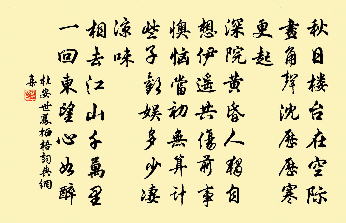詩詞名句歷史字典書法欣賞書法字典國語詞典說文解字康熙字典古漢語字典標 題 作 者 詩 句 鳳棲梧/蝶戀花作者:杜安世 朝代:宋代鳳棲梧/蝶戀花原文秋日樓台在空際。畫角聲沈,歷歷寒更起。深院黃昏人獨自。想伊遙共傷前事。懊惱當初無算計。些子歡娛,多少淒涼味。相去江山千萬里。一回東望心如醉。詩詞問答問:鳳棲梧/蝶戀花的作者是誰?答:杜安世問:鳳棲梧/蝶戀花寫於哪個朝代?答:宋代問:鳳棲梧/蝶戀花是什麼體裁?答:詞杜安世鳳棲梧/蝶戀花書法欣賞鳳棲梧/蝶戀花書法作品詩詞推薦奉送呂表叔赴江陰蘇泂〔宋代〕春風乍入澄江郡,最愛君山一點青。柳外化民安若子,鷗邊為政出於經。每慚舊守勤招喚,況識今侯更典刑。此去探禹穴鄧深〔宋代〕禹穴鎮名山,神龍夙呵衛。告成餘此跡,天地相終始。昔在紹興中,弔古先君子。探穴勇躋攀,慨嘆不能已。援筆碧雲峰陳岩〔宋代〕瘦藤引我上崚嶒,蒼壁如梯石作層。袖得碧雲無用處,卻將分贈住山僧。首座昇大師赴西京知教門事楊億〔宋代〕高論彌天四海聞,久為龍象主空門。雪峰傳法稱開士,麟殿談經奉至尊。香滿賜衣歸洛社,苔封丈室寄梁園。梵書題僧壁趙嘏〔唐代〕曉望疏林露滿巾,碧山秋寺屬閒人。溪頭盡日看紅葉,卻笑高僧衣有塵。荔枝龍眼二絕劉克莊〔宋代〕味嘗不暇更論斤,買斷何曾敢算緡。譜與本經俱過眼,食之不老者何人。安陸白兆山桃花岩寄劉侍御綰(作春歸桃花岩貽許侍御)李白〔唐代〕雲臥三十年,好閒復愛仙。蓬壺雖冥絕,鸞鶴心悠然。歸來桃花岩,得憩雲窗眠。對嶺人共語,飲潭猿相連。時升石州引·薄雨初寒賀鑄〔宋代〕薄雨初寒,斜照弄晴,春意空闊。長亭柳色纏黃,遠客一枝先折。煙橫水際,映帶幾點歸鴉,東風銷盡龍沙雪。還明皇楊億〔宋代〕玉牒開觀檢未封,鬥雞三百遠相從。紫雲度曲傳浮世,白石標年鑿半峰。河朔叛臣驚舞馬,渭橋遺老識真龍。蓬山和唐伯憲二首姜特立〔宋代〕卜鄰初識面,把臂便論詩。摸索曹劉耦,憑陵漢魏時。新章專雅潔,古隸更清奇。若比江西派,無人說具茨。南康趙明府贈予四詩和其首篇二首劉克莊〔宋代〕二老風流接見聞,餘香未遠尚堪薰。明師豈不使人巧,老僕安能重子文。策蹇何由追抹電,化龍吾亦願為雲。從來題郎士元半日吳村別業,兼呈李長官錢起〔唐代〕半日吳村帶晚霞,閒門高柳亂飛鴉。橫雲嶺外千重樹,流水聲中一兩家。愁人昨夜相思苦,閏月今年春意賒。自嘆忍笑韓偓〔唐代〕宮樣衣裳淺畫眉,晚來梳洗更相宜。水精鸚鵡釵頭顫,舉袂佯羞忍笑時。苦雨范成大〔宋代〕潤礎才晴又汗,濕薪未爆先煙。壯夫往往言病,病叟岑岑且眠。和白雲庵七首明月台黃庶〔宋代〕老僧山中嫌月窄,夜夜獨上高高台。四邊不肯著閒樹,故要滿坐清光來。送李尉興龍之海豐任李昴英〔宋代〕書味無窮得屬厭,待瓜六載不辭淹。乃心雅欲親諸老,初筮惟知守一簾。毋縱彎弓獵雞犬,謹防暴客起魚鹽。同鄉虞美人李曾伯〔宋代〕韶華只隔窗兒外。病起昏於醉。花開花落總相忘。惟有夢隨胡蝶、趁春忙。故園芳草應如舊。只恨人消瘦。擬憑飛送竇七王昌齡〔唐代〕清江月色傍林秋,波上熒熒望一舟。鄂渚輕帆須早發,江邊明月為君留。醉桃源 贈趙戒師王丹桂〔元代〕略將微語破昏衢。塵情立剪除。色空空色兩無殊。真實理不虛。常湛湛,體如如。出離生死途。澄塘性月一輪孤。遷居親戚攜酒見過章康〔宋代〕老吾元住雪邊崖,萬事無堪兩鬢華。頃歲西河方借宅,今年東野又般家。巷深政恐難邀客,地空何妨學種花。多謝名句推薦城中桃李愁風雨,春在溪頭薺菜花。辛棄疾《鷓鴣天·陌上柔桑破嫩芽》 一曲高歌一樽酒,一人獨釣一江秋。王士禎《題秋江獨釣圖》 春城無處不飛花,寒食東風御柳斜。韓翃《寒食 / 寒食日即事》 但見宵從海上來,寧知曉向雲間沒。李白《把酒問月·故人賈淳令予問之》 世事悠悠渾未了,年光冉冉今如許。吳潛《滿江紅·送李御帶珙》 九月九日望鄉台,他席他鄉送客杯。王勃《蜀中九日 / 九日登高》 治大國,若烹小鮮。老子《老子·德經·第六十章》 往年同在鸞橋上,見倚朱闌詠柳綿。韓偓《寒食日重遊李氏園亭有懷》 想文君望久,倚竹愁生步羅襪。姜夔《八歸·湘中送胡德華》 雪似梅花,梅花似雪。呂本中《踏莎行·雪似梅花》