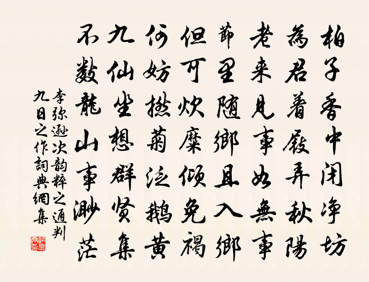 詩詞名句歷史字典書法欣賞書法字典國語詞典說文解字康熙字典古漢語字典標 題 作 者 詩 句 次韻粹之通判九日之作作者:李彌遜 朝代:宋代次韻粹之通判九日之作原文柏子香中閉淨坊,為君著屐弄秋陽。老來見事如無事,節里隨鄉且入鄉。但可炊糜傾免褐,何妨撚菊泛鵝黃。九仙坐想群賢集,不數龍山事渺茫。詩詞問答問:次韻粹之通判九日之作的作者是誰?答:李彌遜問:次韻粹之通判九日之作寫於哪個朝代?答:宋代李彌遜次韻粹之通判九日之作書法欣賞次韻粹之通判九日之作書法作品詩詞推薦首尾吟邵雍〔宋代〕堯夫非是愛吟詩,詩看春秋後語時。七國縱橫如破的,九州吞吐若枰棋。君臣自作逋逃主,將相無非市井兒。篆入偈頌七十六首釋師觀〔宋代〕今朝七月一,解夏半月日。摩挲拄杖子,笠頭勤拂拭。狗子無佛性,一文也不直。趙清獻勤潔帖贊岳珂〔宋代〕為御史而稱其鐵面,宜筆力之健。尹成都而琴鶴以行,宜字型之清。書法何出,心即其物,可以比魏公之笏。同崔錄事哭鄭員外盧照鄰〔唐代〕文學秋天遠,郎官星位尊。伊人表時彥,飛譽滿司存。楚席光文雅,瑤山侍討論。鳳詞凌漢閣,龜辯罩周園。已陪歲終呈一齋吳汝弌〔宋代〕磊砢千丈松,清陰蔭林丘。豈無棟樑用,匠伯不見收。匠伯恐未良,棟樑終有求。天風葉偃蓋,五雲常為浮。庶先北谷文同〔宋代〕路自西溪入,園當北谷開。月亭詩作客,雨館睡為媒。摘果衣沾露,尋泉屐漬苔。閒居正無事,莫問我頻來。辛酉歲冬十一月隨駕幸岐下作韓偓〔唐代〕曳裾談笑殿西頭,忽聽征鐃從冕旒。鳳蓋行時移紫氣,鸞旗駐處認皇州。曉題御服頒群吏,夜發宮嬪詔列侯。雨露送何白節推宰晉原二首范仲淹〔宋代〕此行深惜別,所喜是寧親。祖帳千門曉,鄉關錦國春。鳥歌疑勸酒,山態似迎人。我絕南陔望,因兄淚滿巾。山中吟陳允平〔宋代〕日出華山陽,月出廬山崗。巫山雲漠漠,雁山煙蒼蒼。鄭侍御廳玩鶴許渾〔唐代〕碧天飛舞下晴莎,金閣瑤池絕網羅。岩響數聲風滿樹,岸移孤影雪凌波。緱山去遠雲霄迥,遼海歸遲歲月多。雙翅授時曆以丁未為一歲仇遠〔宋代〕一從妻子累心身,役役勞勞春復春。苦被長貧難擇祿,寧甘漸老不如人。廣文冷坐非無飯,張翰思歸豈為蓴。莫問朝三暮四佚名〔先秦〕宋有狙公者,愛狙,養之成群,能解狙之意;狙亦得公之心。損其家口,充狙之欲。俄而匱焉,將限其食,恐眾狙孤山釋智愚〔宋代〕黯黯青青一望中,迥然不與眾峰同。白雲散盡江天曉,想見人間無路通。偈頌一百二十三首釋祖欽〔宋代〕心是要,法是塵,兩種猶如鏡上痕。鏡已破,法不存,疏影橫斜水清淺,暗香浮動月黃昏。送郭司倉王昌齡〔唐代〕映門淮水綠,留騎主人心。明月隨良椽,春潮夜夜深。覓蠹椽高登〔宋代〕顧影低徊只自憐,怕寒時聳作詩肩。全家食粥已數月,坐客無氈今幾年。君劈槽燒當止酒,我和琴爨況無弦。雪中龍井董嗣杲〔宋代〕腥攢石縫瀑花多,還有龍神蟄此窠。通海淺深山不語,隨潮長落水無波。謾傳方士遺丹在,不奈潛鱗吐霧何。時雨又次葉致遠韻二首王安石〔宋代〕庵成有興亦尋春,風暖荒萊步始勻。若遇好花須一笑,豈妨迦葉杜多身。村居徐逸〔宋代〕酸甜半熟山頭果,紅白爭開屋角花。紫戶不關春睡足,太平多在野人家。鯨川八景蓮塘雨聲家鉉翁〔宋代〕贏得荷風伴晚涼,夜闌急雨到陂塘。茅檐似減三分暑,鼻觀俄然失卻香。名句推薦亭皋木葉下,隴首秋雲飛柳惲《搗衣詩》 殘星幾點雁橫塞,長笛一聲人倚樓。趙嘏《長安晚秋 / 秋望 / 秋夕》 瞻彼洛城郭,微子為哀傷。曹操《薤露行》 望長城內外,惟余莽莽;大河上下,頓失滔滔。 * 《沁園春·雪》 記取江湖泊船處,臥聞新雁落寒汀。陸游《夜泊水村》 綠葉翠莖,冒霜停雪。左思《三都賦》 昔有佳人公孫氏,一舞劍器動四方。杜甫《觀公孫大娘弟子舞劍器行》 至今思項羽,不肯過江東。李清照《夏日絕句》 且就洞庭賒月色,將船買酒白雲邊。李白《游洞庭湖五首·其二》 從來幽怨應無數?鐵馬金戈,青冢黃昏路。納蘭性德《蝶戀花·出塞》
