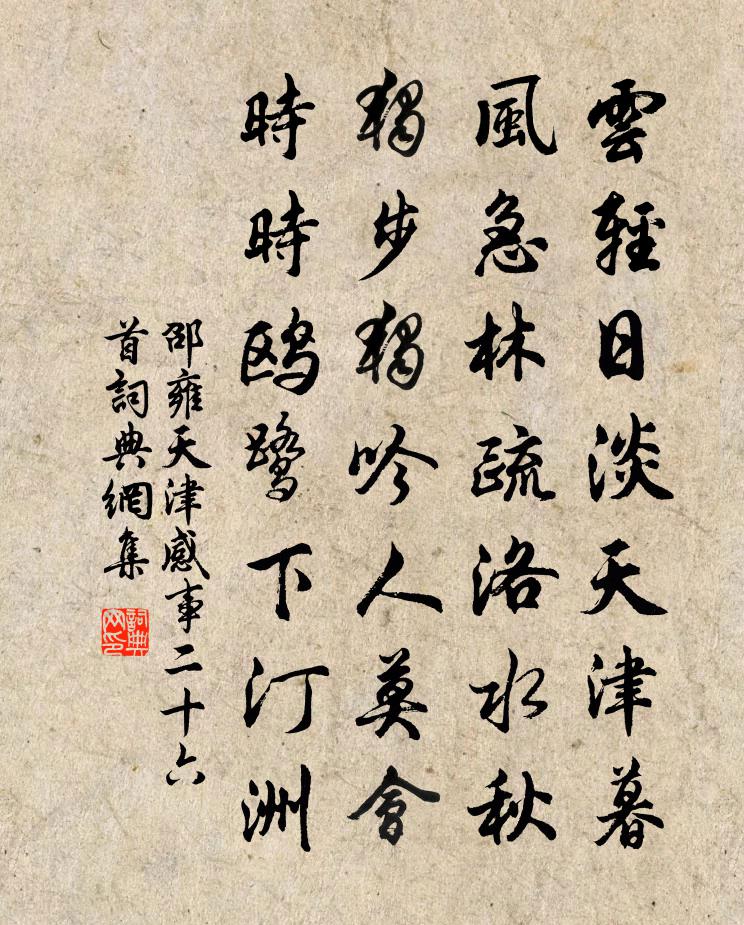 詩詞名句歷史字典書法欣賞書法字典國語詞典說文解字康熙字典古漢語字典標 題 作 者 詩 句 天津感事二十六首作者:邵雍 朝代:宋代天津感事二十六首原文雲輕日淡天津暮,風急林疏洛水秋。獨步獨吟人莫會,時時鷗鷺下汀洲。詩詞問答問:天津感事二十六首的作者是誰?答:邵雍問:天津感事二十六首寫於哪個朝代?答:宋代邵雍天津感事二十六首書法欣賞天津感事二十六首書法作品詩詞推薦和陶下潠田舍獲蘇軾〔宋代〕聚糞西垣下,鑿泉東垣隈。勞辱何時休,宴安不可懷。天公豈相喜,雨霽與意諧。黃菘養土膏,老楮生樹雞。未忍上朝鄭獬〔宋代〕秋風御路冠蓋滿,曉月畫樓鐘鼓遲。臥聽傳呼丞相入,可憐正是上朝時。聞趙昌甫赴召趙汝回〔宋代〕甘得眠雲復飲冰,此翁不獨擅詩名。山深難避蒲輪召,陛遠聽扶藜杖行。老去報君心轉切,年來守局夢頻驚。有時黃陵廟李群玉〔唐代〕黃陵廟前莎草春,黃陵女兒蒨裙新。輕舟短櫂唱歌去,水遠山長愁 * 。王生小景陳某〔宋代〕何處佳山水,依稀類輞川。春風摩詰畫,夜月剡溪船。雲樹鄉心外,鶯花客淚邊。不嫌茅屋小,應喜是歸年。拾翠羽張孝祥〔宋代〕春入園林,花信總諸遲速。聽鳴禽、稍遷喬木。夭桃弄色,海棠芬馥。風雨霽,芳徑草心頻綠。禊事才過,相次禁山行行歌十首周文璞〔宋代〕蟲蛀黃連徹夜焚,秦謠楚誦少人聞。近前欲問新宮信,鶴帶靈芝入暮雲。秘書省墨竹胡仲弓〔宋代〕寫出此君真面目,筆端造化少人知。我疑與可今猶在,安得東坡共賦詩。偈頌七十八首釋正覺〔宋代〕當生不生,借光現三十六應。當滅不滅,忘照攝千百億身。只如絕去,來無動靜。賀新郎葛長庚〔宋代〕靜看春容瘦。未清明、荼避席,薔薇出晝。花里流鶯罵桃李,似與東風管句。怕虛度、蘭亭時候。我也別來天上夕光祿朱卿輓詞十首李廌〔宋代〕滄海夢悠悠,關河壯氣收。魂歸傷委蛻,壑迥失虛舟。月暗菰蒲夜,山空木葉秋。可堪頻悵望,松梓繄新丘。題趙漕小蓬萊方岳〔宋代〕乾坤不盡一蘧廬,方寸中間幾太虛。辦著海濤三萬里,乃翁底用費分疏。寄題天台臨海白鶴廟康濟泉為顏魯子少卿作李流謙〔宋代〕將軍射虎不射石,石作於菟能沒鏑。翻然再探弓不力,俊鶻豪鷹眼前失。兩泉後先今抗行,何物使之令人驚。泉出醴泉歌張元孝〔宋代〕君不見齊城城西范公泉,曾照當年范公影。范公一去不復返,異時此地成佳景。先賢口澤氣尚存,甘棠璐遺愛誰能太常引(四月初八日慶六十)汪元量〔宋代〕廣寒宮殿五雲邊。看天上、燭金蓮。香裊御爐煙。擁彩仗、千官肅然。世間王母,月中仙子,花甲一周天。樂指沸同馬太守聽九思法師講金剛經高適〔唐代〕吾師晉陽寶,傑出山河最。途經世諦間,心到空王外。鳴鐘山虎伏,說法天龍會。了義同建瓴,梵法若吹籟。深知送許兄還侍兼簡廣南監場二首廖行之〔宋代〕君家疇昔汝南龍,淵有驪珠自不窮。黃卷乃翁廉取位,碧梧之子秀參空。儒冠底誤資身術,鹽筴聊成富國功。莫倚陪王郎中尋孔征君韋應物〔唐代〕俗吏閒居少,同人會面難。偶隨香署客,來訪竹林歡。暮館花微落,春城雨暫寒。瓮間聊共酌,莫使宦情闌。贈考功盧郎中溫庭筠〔唐代〕白首方辭滿,荊扉對渚田。雪中無陋巷,醉後似當年。一笈負山藥,兩瓶攜澗泉。夜來風浪起,何處認漁船。聽琴王建〔唐代〕無事此身離白雲,松風溪水不曾聞。至心聽著仙翁引,今看青山圍繞君。名句推薦望家思獻壽,算甲恨長年。歐陽詹《除夜長安客舍》 生而知之;或學而知之;或困而知之:及其知之,一也。子思《中庸·第二十章》 十二樓中盡曉妝,望仙樓上望君王。薛逢《宮詞》 海內風塵諸弟隔,天涯涕淚一身遙。杜甫《野望》 水晶簾動微風起,滿架薔薇一院香。高駢《山亭夏日》 夭夭園桃,無子空長。曹丕《煌煌京洛行》 白馬黃金塞,雲砂繞夢思。李白《塞下曲六首》 搴帷拜母河梁去,白髮愁看淚眼枯。黃景仁《別老母》 城上春雲覆苑牆,江亭晚色靜年芳。杜甫《曲江對雨》 冀枝葉之峻茂兮,願俟時乎吾將刈。屈原《離騷》