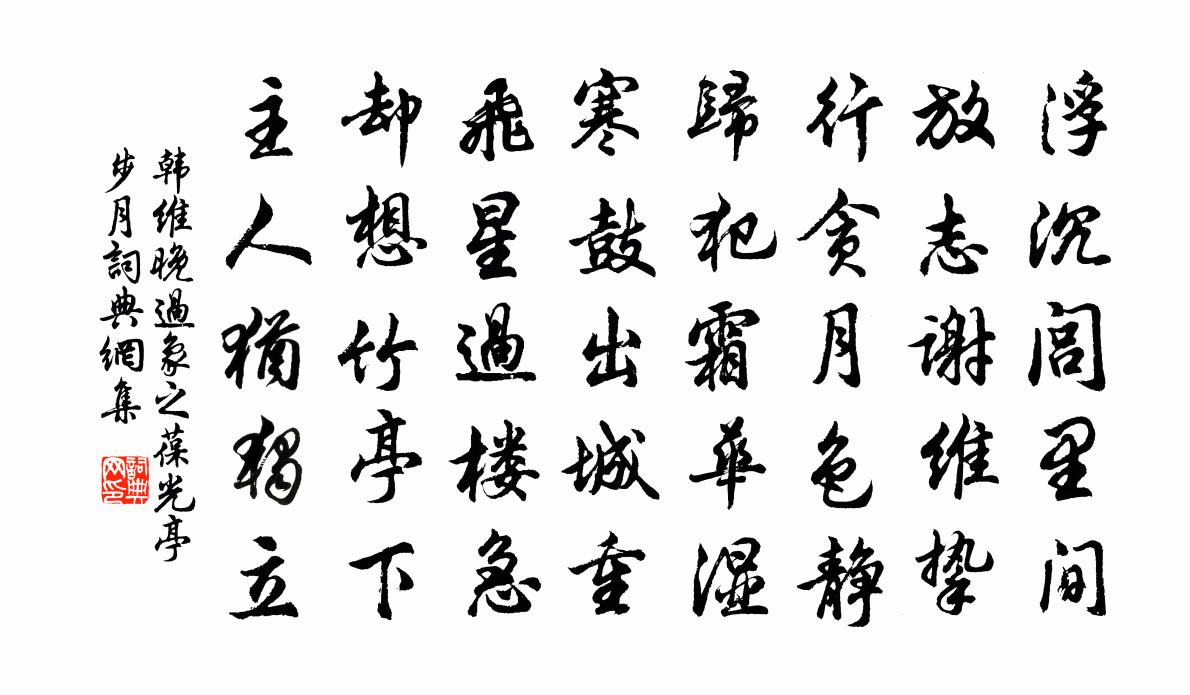 詩詞名句歷史字典書法欣賞書法字典國語詞典說文解字康熙字典古漢語字典標 題 作 者 詩 句 晚過象之葆光亭步月作者:韓維 朝代:宋代晚過象之葆光亭步月原文浮沉閭裡間,放志謝維摯。行貪月色靜,歸犯霜華濕。寒鼓出城重,飛星過樓急。卻想竹亭下,主人猶獨立。詩詞問答問:晚過象之葆光亭步月的作者是誰?答:韓維問:晚過象之葆光亭步月寫於哪個朝代?答:宋代韓維晚過象之葆光亭步月書法欣賞晚過象之葆光亭步月書法作品詩詞推薦送孫賓老守三池二首李流謙〔宋代〕百萬貔貅尚枕戈,將軍未復舊山河。非乾使者徵求急,正柰窮邊餉挽何。頗願有言先牧養,不妨自署拙催科。公餘晴望九華山楊鴻〔唐代〕九華閒望簇清虛,氣象群峰盡不如。惆悵都南掛冠吏,無人解向此山居。和樂天招錢蔚章看山絕句元稹〔唐代〕碧落招邀閒曠望,黃金城外玉方壺。人間還有大江海,萬里煙波天上無。李夫人二首徐夤〔唐代〕不望金輿到錦帷,人間樂極即須悲。若言要識愁中貌,也似君恩日日衰。招得香魂爵少翁,九華燈燭曉還空。漢王梅花喜神譜大蕊八枝宋伯仁〔宋代〕曳頸吟松梢,何異揚州鶴。胡為鶴未成,苦被玄裳錯。和元伯中伏夜雨南洋河水泛黃庶〔宋代〕雨洗三齊中伏月,乖龍連夜起雲門。溪聲斗似銀河落,驚斷詩書一夢魂。第一百九十三文天祥〔宋代〕蝮蛇暮偃蹇,猛虎憑其威。其宰意茫茫,六合人煙稀。臨江仙·夜飲東坡醒復醉蘇軾〔宋代〕夜飲東坡醒復醉,歸來仿佛已三更。家童鼻息已雷鳴,敲門都不應,倚帳聽江聲。長恨此身非我有,何時忘卻營營酬李十六岐王季友〔唐代〕煉丹文武火未成,賣藥販履俱逃名。出谷迷行洛陽道,乘流醉臥滑台城。城下故人久離怨,一歡適我兩家願。朝飲朝陽三章袁甫〔宋代〕日之出矣,其光融融。鳳之鳴矣,其聲雝雝。鳴於何所,於彼梧桐。鳳兮鳳兮,和樂沖沖。匪鳳匪桐,在君子躬。戲題林靈素書像佚名〔宋代〕當日先生在市塵,世人那識是真仙。只因學得飛升後,難犬隨也上天。頌古三十一首釋玿〔宋代〕相逢打鼓弄琵琶,須是還他兩會家。曲罷不知何處去,夕陽斜映暮天霞。代簡琛卿趙蕃〔宋代〕是處梅花與雪融,竹間開晚正玲瓏。陳君為我言如此,折贈當期慰眼中。閏正月二日夜張氏納婦梅堯臣〔宋代〕婚姻貴及時,周有摽梅詩。雪花後爭發,人歸室且宜。坐中傳漏鼓,戶外轉星旗。環佩遙聞出,當修廟見儀。金錯刀馮延巳〔唐代〕日融融,草芊芊,黃鶯求友啼林前。柳條裊裊拖金線,花蕊茸茸簇錦氈。鳩逐婦,燕穿簾,狂蜂浪蝶相翩翩。春光下章安杜瀆七首姚寬〔宋代〕風林葉脫減秋聲,山擁秋光到眼明。秋興悲秋俱有賦,安仁宋玉是前生。謝王司戶惠紙被李新〔宋代〕霧中楮皮厚一尺,岷溪秋浪如藍碧。山僧夜抄山鬼愁,白雪千番沍牆壁。裁成素被劣繒綺,故人聊助蘇門癖。經年韓信祠:張耒〔宋代〕千金一飯恩猶報,南面稱孤豈遽忘。何待陳侯乃中起,不思蕭相在鹹陽。七月十一夜涼風聚至事書懷三絕句傅察〔宋代〕蕭蕭初覺淡雲輕,颯颯如聞轉樹聲。收拾光輝渾在眼,應知騎省賦初成。和謝公定河朔漫成八首黃庭堅〔宋代〕急雨長風溢兩河,欣然河伯順風歌。行觀東海方存少,不以黃流更自多。名句推薦憂勞可以興國,逸豫可以亡身歐陽修《伶官傳序》 巧詐不如拙誠。韓非及後人《韓非子·說林上》 投我以桃,報之以李。佚名《抑》 來如風雨,去似微塵。佚名《增廣賢文·上集》 行人無限秋風思,隔水青山似故鄉。戴叔倫《題稚川山水》 夜來南風起,小麥覆隴黃。白居易《觀刈麥》 斷無蜂蝶慕幽香,紅衣脫盡芳心苦。賀鑄《芳心苦·楊柳回塘》 一時輕信人言語.自有明人話不平。馮夢龍《警世通言·卷四》 斑竹枝,斑竹枝,淚痕點點寄相思。劉禹錫《瀟湘神·斑竹枝》 今夜故人來不來,教人立盡梧桐影。呂岩《梧桐影·落日斜》