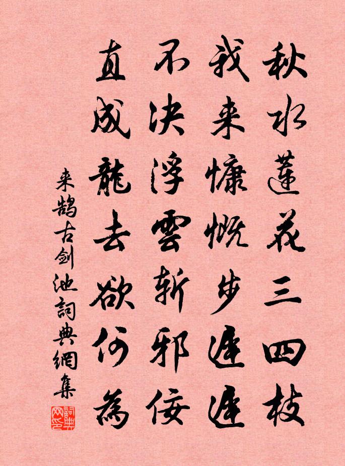 詩詞名句歷史字典書法欣賞書法字典國語詞典說文解字康熙字典古漢語字典標 題 作 者 詩 句 古劍池作者:來鵠 朝代:唐代古劍池原文秋水蓮花三四枝,我來慷慨步遲遲。不決浮雲斬邪佞,直成龍去欲何為。詩詞問答問:古劍池的作者是誰?答:來鵠問:古劍池寫於哪個朝代?答:唐代問:古劍池是什麼體裁?答:七絕來鵠古劍池書法欣賞古劍池書法作品注釋全唐詩:卷642-24詩詞推薦次韻方教采芹亭方岳〔宋代〕亭與樵嵐一樣新,詩書不受世間塵。清風明月來無盡,不在溪山只在人。留別陳明叔兼屬胡仲威五首趙蕃〔宋代〕論事從違數,題詩竄定頻。客君徒得重,愛我不言貧。薄俗無兄弟,我曹相主賓。別觴終作惡,別語要須真。醉落魄/一斛珠趙善括〔宋代〕梯橫畫閣。月明江靜煙光薄。碧山迴繞欄乾角。一縷行雲,忽向杯中落。櫻歌柳舞俱柔弱。羅衣不耐江風惡。憑誰鴛鴦湖棹歌 之八十三朱彝尊〔清代〕蘄王戰艦已無蹤,婁相高墳啟舊封。曾見朋游南渡日,北山堂外九株松。自雲門至上灶欲游一二僧庵以雨不果陸游〔宋代〕道遠晨炊米,風和晝減衣。花殘孔官廟,苔滿葛仙磯。剩欲尋僧話,先判秉炬歸。山昏又成雨,心事固多違。代北言懷喻坦之〔唐代〕困馬榆關北,那堪落景催。路行沙不絕,風與雪兼來。草得春猶白,鴻侵夏始回。行人莫遠入,戍角有餘哀。閒居陸游〔宋代〕小隱輕華屋,深山自結茅。亂苔侵石磴,疏竹映花梢。和石庵洪府理金沙酴醾牡丹二首何夢桂〔宋代〕洛茶欲放趁春忙,一架花添兩樣芳。倚檻白紅多侍女,臨軒黃紫是真王。只愁吳苑館娃老,無奈唐宮春恨長。說與正月初八日同莫少虛蒲大受王園泛舟各賦二首郭印〔宋代〕名園春信來,冷眼思一窺。吏文巧束縛,穎脫乃不羈。興發勇欲往,壯士先登埤。但得一樽樂,豈論官職卑。況茲虞部劉員外約游金明光以賤事失期劉惠詩見嘲司馬光〔宋代〕碧柳紅桃照眼春,綺餚芳醴集朝紳。自嫌林野疏頑跡,難預風流席上賓。憶少年令/憶少年康與之〔宋代〕雙龍燭影,千門夜色,三五宴瑤台。舞蝶隨香,飛蟬撲鬢,人自蕊宮來。太平簫鼓宸居曉,清漏玉壺催。步輦歸時奉和喜雪應制徐安貞〔唐代〕兩宮齋祭近登臨,雨雪紛紛天晝陰。只為經寒無瑞色,頓教正月滿春林。蓬萊北上旌門暗,花萼南歸馬跡深。自有病暑賀鑄〔宋代〕早夏景延永,烈日天中央。欻欻燎原野,中人如探湯。病肺苦焦渴,吐舌生喉瘡。蔗漿與茗飲,未易蘇膏盲。稍驚馬詩二十三首·其十三李賀〔唐代〕寶玦誰家子,長聞俠骨香。堆金買駿骨,將送楚襄王。滿江紅慢姬翼〔元代〕百鍊千磨,成底事、襟懷冰雪。向積塵堆里灑落,要明心月。根本泉源空到底,波瀾枝葉休分別。遍世間、誰不是送何水部蒙出牧袁州錢丕〔宋代〕白首名郎有幾人,雙旌晝錦不如君。楚江萍暖烘朝日,玉女衣輕掛曉雲。極浦仙舟煙澹澹,高秘郡閣葉紛紛。政成勸陸三飲酒戴叔倫〔唐代〕寒郊好天氣,勸酒莫辭頻。擾擾鍾陵市,無窮不醉人。四用韻方岳〔宋代〕花愁牽勝游,禽哢破佳睡。點爾春何如,妙在夫子喟。宇宙一瑟間,誰知道之至。而彼章句儒,心為六經醉。寄題李俊臣南樓楊萬里〔宋代〕庾家南樓天下無,李家南樓何似渠。玉蔘碧山羅帶水,眼界風煙且千里。何須橫陳鸚鵡洲,月桂欄乾西角頭。謪仙元獻晏公輓辭三首王安石〔宋代〕文章晉康樂,經術漢公孫。舊秩疑丞貴,前功保傅尊。傳呼猶在耳,會哭已填門。蕭瑟城南路,鳴笳上九原。名句推薦借問此何時?春風語流鶯。李白《春日醉起言志》 恐斷紅、尚有相思字,何由見得。周邦彥《六醜·落花》 十年愁眼淚巴巴。今日思家。明日思家。汪元量《一剪梅·懷舊》 事以密成,語以泄敗。韓非及後人《韓非子·說難》 漢臣曾此作縲囚,茹血衣毛十九秋。汪遵《詠北海》 曲妙人不能盡和,言是人不能皆信。王充《論衡·卷二十七·定賢篇》 天涯靜處無征戰,兵氣銷為日月光。常建《塞下曲四首·其一》 教子弟求顯榮,不如教子弟立品行。王永彬《圍爐夜話·第四五則》 歡笑情如舊,蕭疏鬢已斑。韋應物《淮上喜會梁川故人 / 淮上喜會梁州故人》 露從今夜白,月是故鄉明。杜甫《月夜憶舍弟》