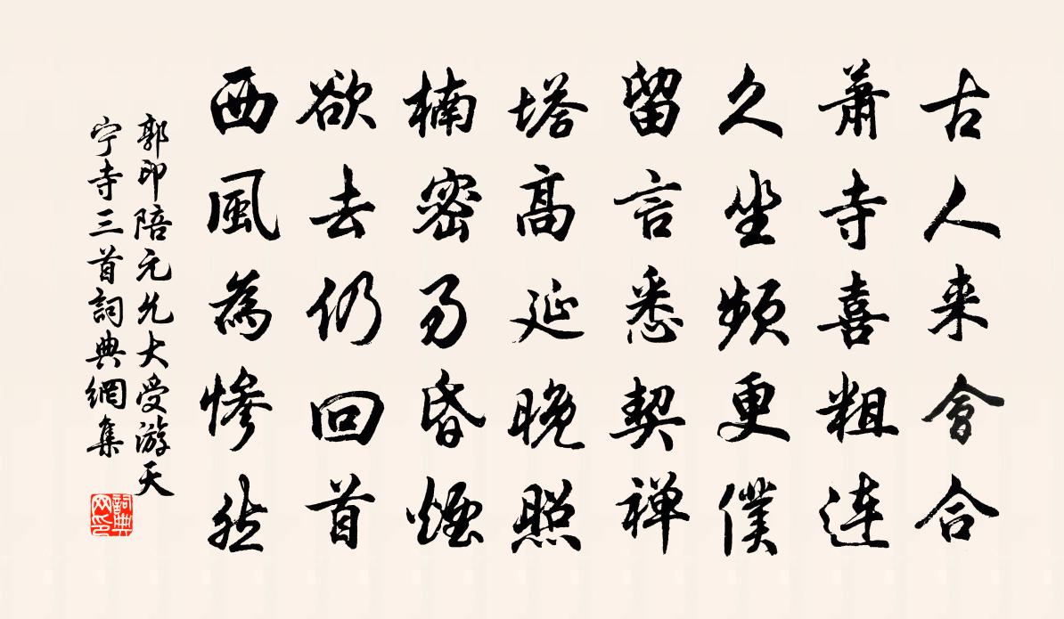 詩詞名句歷史字典書法欣賞書法字典國語詞典說文解字康熙字典古漢語字典標 題 作 者 詩 句 陪元允大受游天寧寺三首作者:郭印 朝代:宋代陪元允大受游天寧寺三首原文古人來會合,蕭寺喜粗連。久坐頻更仆,留言悉契禪。塔高延晚照,楠密易昏煙。欲去仍回首,西風為慘然。詩詞問答問:陪元允大受游天寧寺三首的作者是誰?答:郭印問:陪元允大受游天寧寺三首寫於哪個朝代?答:宋代郭印陪元允大受游天寧寺三首書法欣賞陪元允大受游天寧寺三首書法作品詩詞推薦追和秦隱君辭薦之韻,上陳侯乞歸鳳山詹琲〔唐代〕誰言悅口是甘肥,獨酌鵝兒啖翠微。蠅利薄於青紙扇,羊裘暖甚紫羅衣。心隨倦鳥甘棲宿,目送征鴻遠奮飛。擊壤接待贈相送諸公曹勛〔宋代〕曉隨幽徑踏行雲,拄頰南山眼界新。馬上客塵良自笑,山中梅意欲驚春。清愁有底能隨酒,世道何方可問津。賴有古離別權德輿〔唐代〕人生性天地間,性瞥若七轡性馳。夭壽性既常數,奈何生別離。跡當中人域,正性日已衰。是非千萬境,杳靄情塵念奴嬌·春雪詠蘭陳子龍〔明代〕問天何意,到春深、千里龍山飛雪?解佩凌波人不見,漫說芷珠宮闕。楚殿煙微,湘潭月冷,料得都攀折。嫣然幽送李微之以史學召程公許〔宋代〕鴻蜚冥冥天宇空,誰訟矯修門羾。承平在昔朝多賢,猶念丘園天爵共。泰山豹林來復去,河南白雲堅不動。斯文程次韻和李寺丞見寄之什楊億〔宋代〕雲章承詔祝高穹,夜聰空歌宿絳宮。正怯龜腸終日內,忽膞雁信五城中。八珍伊鼎鹽梅味,九夏堯廚萐莆風。苦恨劉平甫輓詩二首楊萬里〔宋代〕忠顯肩雙廟,屏山籙二程。嶺寒松節苦,壇暖杏花明。君也孤傅業,天乎獨短生。子孫無一物,故紙付渠耕。寄袁州李嘉祐員外錢起〔唐代〕誰謂江山阻,心親夢想偏。容輝常在目,離別任經年。郡國通流水,雲霞共遠天。行春鶯幾囀,遲客月頻圓。雁有聒龍謠朱敦儒〔宋代〕憑月攜簫,溯空秉羽,夢踏絳霄仙去。花冷街榆,悄中天風露。並真官、蕊佩芬芳,望帝所、紫雲容與。享鈞天、頌古釋道顏〔宋代〕剔起便行三萬里,只今休去八千年。分明更為從頭舉,一任諸方取次傳。丙午九日將過陽羨偶成李曾伯〔宋代〕年年秋晚對風沙,今近重陽喜在家。自斷此生甘皓首,能消幾度看黃花。閒身頗覺便筇竹,醉態都忘脫帽紗。且問送庾侄親迎延平李先生家劉學箕〔宋代〕庾郎吾愛千里駒,朝莫勤苦讀父書。少年綽有老成態,月旦考訂評鄉閭。明當別我擇賢妃,結束琴劍誰挽裾。春空諸公唱和多記經歷之事因感昔游復用元韻凡三蘇頌〔宋代〕平生南北與東西,豈是揚波與汩泥,晚入金門諸彥接,來同綺席賜尊攜。時逢寵渥欣陪預,老遇風光懶詠題。共戴頌古一百首釋智愚〔宋代〕石潤非玉,水麗非金。大禹決而西泝,卞和泣而陸沈。七十翁吟七言十絕方回〔宋代〕少陵詩詫古來希,老病餘生曷不歸。不信神仙不信佛,死時惟裹破深衣。答蓮花妓陳陶〔唐代〕近來詩思清於水,老去風情薄似雲。已向升天得門戶,錦衾深愧卓文君。掃花游 落紅張翥〔元代〕洗春簾雨急,碎簾萬點胭脂簾,盪空無影。館娃骨冷。悵香銷麝土,淚殷玉井。莫怨東風,自古佳人薄命。掩鸞鏡狎鷗亭詩夏竦〔宋代〕元化平分荷大鈞,左符新刻玉為麟。南湖特地栽桃李,擬伴沙鷗過十春。寄顯道王安石〔宋代〕舟約刀頭止歲前,故人專使手書傳。出門江口問訊息,極目寒沙空渺然。再巡道永留別戴叔倫〔唐代〕鬢下初驚白髮時,更逢離別助秋悲。從今不學四方事,已共家人海上期。名句推薦質勝文則野,文勝質則史。文質彬彬,然後君子。孔子弟子《論語·雍也篇》 彩舟雲淡,星河鷺起,畫圖難足。王安石《桂枝香·登臨送目》 驚回千里夢,已三更。起來獨自繞階行。岳飛《小重山·昨夜寒蛩不住鳴》 積於不涸之倉者,務五穀也管仲《管子·牧民》 音塵絕,西風殘照,漢家陵闕。李白《憶秦娥·簫聲咽》 霖雨泥我塗,流潦浩縱橫。曹植《贈白馬王彪·並序》 雁柱十三弦,一一春鶯語。歐陽修《生查子·含羞整翠鬟》 已駕七香車,心心待曉霞。李商隱《壬申七夕》 寒來暑往,秋收冬藏。周興嗣《千字文·全文》 卻看妻子愁何在,漫捲詩書喜欲狂杜甫《聞官軍收河南河北》