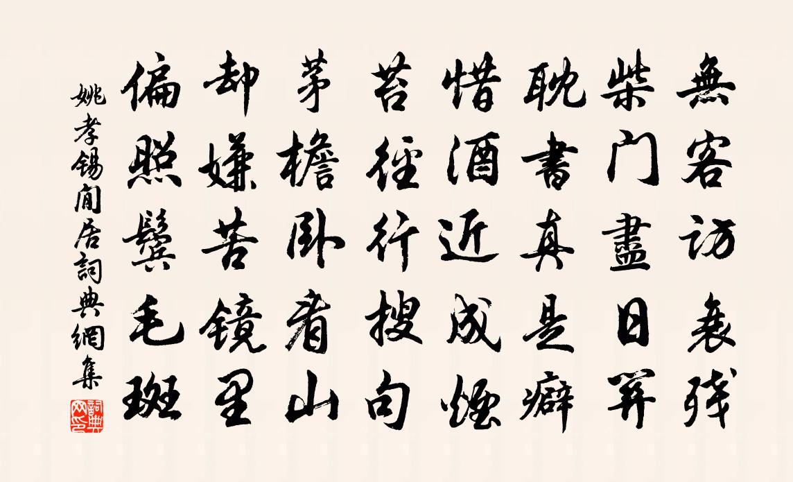 詩詞名句歷史字典書法欣賞書法字典國語詞典說文解字康熙字典古漢語字典標 題 作 者 詩 句 閒居作者:姚孝錫 朝代:宋代閒居原文無客訪衰殘,柴門盡日關。耽書真是癖,惜酒近成煙。苔逕行搜句,茅檐臥看山。卻嫌苦鏡里,偏照鬢毛斑。詩詞問答問:閒居的作者是誰?答:姚孝錫問:閒居寫於哪個朝代?答:宋代姚孝錫閒居書法欣賞閒居書法作品詩詞推薦水仙花項安世〔宋代〕意濃態遠十洲人,歲晏天寒七澤濱。奕奕雲冠疑映月,僛僛翠帶欲搖春。梅稍枉為行人瘦,柳眼虛隨酒市新。林下龜山寺納涼呈宗衍師孔武仲〔宋代〕寶洞然香罷,山堂問話中。日將秋共淡,心與境渾空。彈指看浮世,披襟納遠風。因知宴坐者,白首樂無窮。題謫仙回舟臥據錦袍圖李洪〔宋代〕太白狂歌一酒船,錦袍夜醉楚江邊。此時應向剡中宿,逼耳清猿月滿川。菩薩蠻侯置〔宋代〕東君管盡閒花草。紅紅白白知多少。末後一奩香。綠庭春晝長。道人心似海。夢冷屏山里。莫剪最長條。從教玉步霖雨劉子翬〔宋代〕霖雨遂兼旬,瘴霧盈川谷。霏陰入戶浮,澗氣滋帷褥。溟濛飛澤遠,散漫何時足。驟響決流渠,驚洪發平陸。翔禽門前路陸龜蒙〔唐代〕門前向城路,一直復一曲。曲去日中還,直行日暮宿。何必日中還,曲途荊棘間。金剛隨機無盡頌妙行無住分第四釋印肅〔宋代〕妙行無拘執,三界非出入。相對且無言,巍巍獨足立。憩古寺曾豐〔宋代〕綠繞青圍春一窩,精廬突兀在煙蘿。地容牆壁剩無幾,山視樓台高不多。馴爵諳知僧自在,吠尨怪見客相過。古音姜林居別業柴元彪〔宋代〕結廬塵外境,流水繞平田。三逕故人菊,一池君子蓮。塔懸當戶月,鍾翳隔溪煙。自得平生趣,漁竿老渭川。哭李常侍嶧二首杜甫〔唐代〕一代風流盡,修文地下深。斯人不重見,將老失知音。短日行梅嶺,寒山落桂林。長安若個畔,猶想映貂金。青瑣思在山居日偶成此詠邀松陽子同作李德裕〔唐代〕閒思昔歲事,忽忽念伊川。乘月步秋坂,滿山聞石泉。回塘碧潭映,高樹綠蘿懸。露下叫田鶴,風來嘶晚蟬。懷茲洞仙歌吳潛〔宋代〕□□□□,□□□□瘦。□□□□□□酒。□□深,碎蕊殘萼都收,歸簟枕,誰道梔橐敢就。月邊偏愛惜,冰玉肌道州北池放鵝呂溫〔唐代〕我非好鵝癖,爾乏鳴雁姿。安得免沸鼎,澹然游清池。見生不忍食,深情固在斯。能自遠飛去,無念稻粱為。次韻趙繡使題金鰲穩處艾可叔〔宋代〕突兀霜崖俯雪洲,時時登覽喚漁舟。溪分南北地初合,月在山間天共流。三兩可人曾此會,百千年後復誰游。桑田聞威州諸羌退聽,邊事已寧,少城籌邊樓闌檻范成大〔宋代〕籌邊樓上美髯翁,赤白囊飛笑語中。勃律天西元采玉,蓬婆雪外昨分弓。踏筵舞罷平闌月,橫槊詩成滿袖風。諸校題醉翁圖釋文珦〔宋代〕所畫者誰子,將非高陽兒。滿腹常貯酒,何異於鴟夷。陶陶以自樂,禮法不可縻。釀酒用老瓦,漉酒脫接?。寧復季夏郊墅即事程公許〔宋代〕自隨官牒卻居間,樵叟漁童慣往還。種竹且教疏見月,開窗莫遣礙看山。題曾氏山園十一詠菊隱張栻〔宋代〕不肯競桃李,甘心同艾蒿。德人一題品,愈覺風味高。望海潮(上太原知府王君貺尚書)沈唐〔宋代〕山光凝翠,川容如畫,名都自古井州。簫鼓沸天,弓刀似水,連營十萬貔貅。金騎走長楸。少年人一一,錦帶吳鉤賊平賀本路史禽良叔彌忠四首王邁〔宋代〕六十青蚨米五升,兒童滿口說常平。方愁餞火無聊賴,一沐恩波得並生。真佛現身來救度,老天著眼自分明。從今名句推薦樹繞村莊,水滿陂塘。秦觀《行香子·樹繞村莊》 蓼岸荻花中,隱映竹籬茅舍。張昪《離亭燕·一帶江山如畫》 長驅入,歌台舞榭,風卷落花愁徐君寶妻《滿庭芳·漢上繁華》 罔談彼短,靡恃己長。周興嗣《千字文·全文》 與人不求備,檢身若不及佚名《尚書·商書·伊訓》 牽衣頓足攔道哭,哭聲直上乾雲霄。杜甫《兵車行》 君子養心莫善於誠荀子《荀子·不苟》 夢回人遠許多愁,只在梨花風雨處。辛棄疾《玉樓春·風前欲勸春光住》 力勝貧,謹勝禍,慎勝害,戒勝災。劉向《說苑·談叢》 春路雨添花,花動一山春色。秦觀《好事近·夢中作》