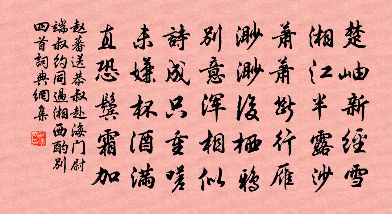 詩詞名句歷史字典書法欣賞書法字典國語詞典說文解字康熙字典古漢語字典標 題 作 者 詩 句 送恭叔赴海門尉端叔約同過湘西酌別四首作者:趙蕃 朝代:宋代原文楚岫新經雪,湘江半露沙。蕭蕭斷行雁,渺渺後棲鴉。別意渾相似,詩成只重嗟。未嫌杯酒滿,直恐鬢霜加。詩詞問答問:《送恭叔赴海門尉端叔約同過湘西酌別四首》的作者是誰?答:趙蕃問:該詩寫於哪個朝代?答:宋代書法欣賞送恭叔赴海門尉端叔約同過湘西酌別四首書法作品詩詞推薦宮詞二首(一作顧況詩)馬逢〔唐代〕金吾持戟護軒檐,天樂傳教萬姓瞻。樓上美人相倚看,紅妝透出水晶簾。玉樓天半起笙歌,風送宮人笑語和。月影壽張京尹十首彭龜年〔宋代〕欲頌公侯學魯人,怕沖大尹罷能吟。亦知已有長生訣,四益齋中四益箴。妙庭觀麋師旦〔宋代〕不尋銅鼎不求丹,從許琉璃碎舊盤。阿母堂前幾春夢,耳邊猶聽玉笙寒。念奴嬌仲並〔宋代〕練江風靜,臥冰奩百尺,朱闌飛入。江遠浮天天在水,水滿半天雲濕。白鳥明邊,青山斷處,眼冷江頭立。月明潮秋夜張鎡〔宋代〕疎星曆歷間銀河,天澹渾疑瀉素波。牆角影低遮月少,樹頭聲壯著風多。平生但念長閒好,萬事從教若夢過。要足聞鷓鴣尤侗〔清代〕鷓鴣聲里夕陽西,陌上征人首盡低。遍地關山行不得,為誰辛苦盡情啼?浣溪沙·脂粉塘空遍綠苔納蘭性德〔清代〕脂粉塘空遍綠苔,掠泥營壘燕相催。妒他飛去卻飛回。一騎近從梅里過,片帆遙自藕溪來。博山香燼未全灰。送以道赴漢東兵官因呈繡使吳勝這同年兼簡李曹彥約〔宋代〕久入功名會,新攜辟召書。忠勤曾策勵,奮迅此權輿。當路心知己,長城指望渠。只將真實地,持守足安居。千周風歌程公許〔宋代〕華清舞徹霓裳散,五音繁會宵達旦。人間何限失意人,西商淒切離騷亂。我所思兮在東周,小雅盡廢心之憂。更堪雜曲歌辭。妾薄命張籍〔唐代〕薄命婦,良家子,無事從軍去萬里。漢家天子平四夷,護羌都尉裹屍歸。念君此行為死別,對君裁縫泉下衣。與君陽台曲楊維楨〔元代〕月落望夫山,高台十二鬟。楚宮多妒女,雲雨夢中還。小重山(吳鬆浮天閣送別)蔡伸〔宋代〕樓外江山展翠屏。沈沈虹影畔,彩舟橫。一尊別酒為君傾。留不住,風色太無情。斜日半山明。畫欄重倚處,獨銷令狐相公自天平移鎮太原以詩申賀劉禹錫〔唐代〕北都留守將天兵,出入香街宿禁扃。鼙鼓夜聞驚朔雁,旌旗曉動拂參星。孔璋舊檄家家有,叔度新歌處處聽。夷落扇子詩李石〔宋代〕缺月空雲弄晚晴,讀書燈影度微明。梧桐未肯收殘雨,猶作窗間打葉聲。乞身不獲再和吳芾〔宋代〕老合休官況七旬,我非辭富欲居貧。也知光景無多日,更覺筋骸不逮人。豈謂九重恩未替,復頒一札意猶親。囊封夜泊平望楊萬里〔宋代〕夜來微雪曉還晴,平望維舟嫩月生。道是燭花總無恨,為誰須暗為誰明。蠟梅四絕楊冠卿〔宋代〕阿嬌厭貯黃金屋,洗尺鉛華兒女妝。香魂寒夜伴幽獨,青燈相對吟胡床。句李宗諤〔宋代〕門外溪山荊渚路,馬前梅杏漢江春。湖上陳師道〔宋代〕湖上難為別,梅梢已著春。林喧烏啄啄,風過水鱗鱗。緣有三年盡,情無一日親。白頭厭奔走,何地與為鄰。偈頌一百零二首釋紹曇〔宋代〕人家競賞元宵,佛隴百無一有。管宴雖愧空疏,賓主不分新舊。隴頭月助放光明,谷口松編排節奏。春風舞袖樂升名句推薦昔歲逢太平,山林二十年。元結《賊退示官吏》 柳葉雙眉久不描,殘妝和淚污紅綃。江采萍《謝賜珍珠》 最是秋風管閒事,紅他楓葉白人頭。趙翼《野步》 能勝強敵者,先自勝者也。商鞅《商君書·畫策》 觀今宜鑑古,無古不成今。佚名《增廣賢文·上集》 十年愁眼淚巴巴。今日思家。明日思家。汪元量《一剪梅·懷舊》 得天下英才而教育之,三樂也!孟子《孟子·盡心章句上·第二十節》 鼙鼓動時雷隱隱,獸頭凌處雪微微。盧肇《競渡詩 / 及第後江寧觀競渡寄袁州剌史成應元》 嘆寄與路遙,夜雪初積。姜夔《暗香疏影》 人無禮則不生,事無禮則不成,國家無禮則不寧。荀子《荀子·修身》