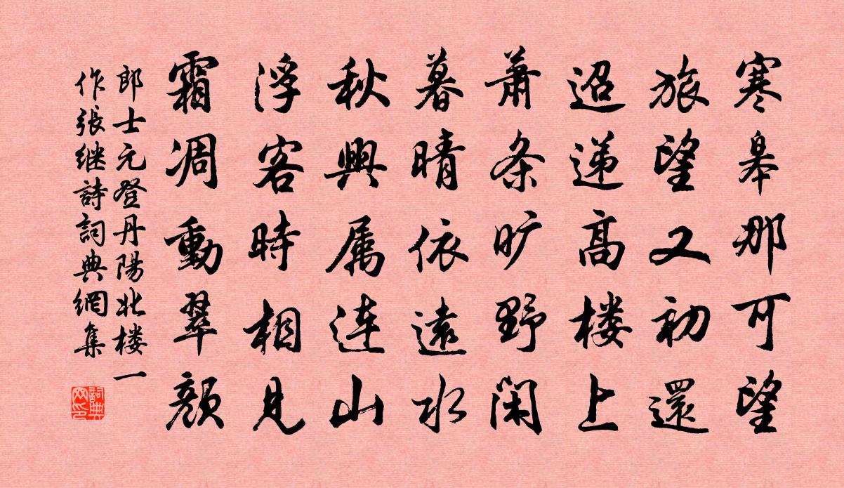 詩詞名句歷史字典書法欣賞書法字典國語詞典說文解字康熙字典古漢語字典標 題 作 者 詩 句 登丹陽北樓(一作張繼詩)作者:郎士元 朝代:唐代登丹陽北樓(一作張繼詩)原文寒皋那可望,旅望又初還。迢遞高樓上,蕭條曠野閒。暮晴依遠水,秋興屬連山。浮客時相見,霜凋動翠顏。詩詞問答問:登丹陽北樓(一作張繼詩)的作者是誰?答:郎士元問:登丹陽北樓(一作張繼詩)寫於哪個朝代?答:唐代郎士元登丹陽北樓(一作張繼詩)書法欣賞登丹陽北樓(一作張繼詩)書法作品注釋全唐詩:卷248_35詩詞推薦長安惜春羅鄴〔唐代〕千門共惜放春回,半鎖樓台半復開。公子不能留落日,南山遮莫倚高台。殘紅似怨皇州雨,細綠猶藏畫蠟灰。畢竟獻淮寧軍節度使李相公劉長卿〔唐代〕建牙吹角不聞喧,三十登壇眾所尊。家散萬金酬士死,身留一劍答君恩。漁陽老將多回席,魯國諸生半在門。白馬洞仙歌(元宵詞)丘崈〔宋代〕□□春□,□畫□□處。十里紅蓮照歌舞。望鰲山天際,寶篆翻空,看未了,湧出珠宮貝宇。錦江橋那畔,羅綺重同喻宣仲鷲峰寺聽秋鶯林古度〔清代〕物候推移傷客魂,啼鶯何意戀山村。不因落葉林間滿,猶道啼春在寺門!人月圓 再過真定贈蔡特夫王寂〔元代〕錦標彩追行樂,管領鎮陽春。而今重到,鶯花應笑,老眼黃塵。憑君問舍雕丘側,準擬乞閒身。北潭漲雨,西樓冷泉憑欄陳起〔宋代〕此山泉石勝,還思日日登。那知三生前,不是住山僧。金在熔白行簡〔唐代〕巨橐方熔物,洪爐欲範金。紫光看漸發,赤氣望逾深。焰熱晴雲變,煙浮晝景陰。堅剛由我性,鼓鑄任君心。踴躍精思秦觀〔宋代〕精思洞元化,白日升高旻。俯仰凌倒景,龍行速如神。半道過紫府,弭節聊逡巡。金床設寶幾,璀璨明月珍。僊者寓陳雜詩十首張耒〔宋代〕傳舍不可久,束裝投新居。新居亦苟完,佳木頗扶疏。灑掃尋丈地,琴書遣朝晡。風雲中夜變,大雨如決渠。落點次韻因老見贈王之道〔宋代〕扁舟歷陽來,訪君得少息。登堂默無語,見老稱目擊。去年糝江上,群盜羅劍戟。君時濡須游,入山笑相揖。肩擔題陳宰戲彩亭梅堯臣〔宋代〕仕宦固已美,及親此其難。況慕五彩戲,而奉興居安。翁喜君亦喜,翁餐君亦餐。嗷嗷園中禽,口哺心違丸。邑大雪中尋梅陸游〔宋代〕莫遣扁舟興盡回,正須沖雪看江梅。楚人原未知真色,施粉何曾太白來!次韻汪解元留別衛博〔宋代〕留別詩成語更酸,誰憐索米困長安。聖朝有意台萊詠,高士無嫌桂柏寒。聞道新書行入奏,少陪征棹慰餘歡。一封吳姬曲 其六王冕〔元代〕吳姬歸,湖風吹冷日色微。滿船箏鼓不敢動,隔林恐攪殘花飛。涌金門外馬如練,銀燈照水紅輝輝。紅輝輝,吳姬春日書懷,寄東洛白二十二楊八二庶子劉禹錫〔唐代〕曾向空門學坐禪,如今萬事盡忘筌。眼前名利同春夢,醉里風情敵少年。野草芳菲紅錦地,遊絲撩亂碧羅天。心知游清潭呂資益蟠谷絕漱玉劉過〔宋代〕帝所森瑞寂不喧,九關虎豹守天門。何人奏事含風殿,日晏鳴珂下紫垣。和主司王起(一作奉和主司王僕射答周侍郎賀放榜作)盧肇〔唐代〕嵩高降德為時生,洪筆三題造化名。鳳詔佇歸專北極,驪珠搜得盡東瀛。褒衣已換金章貴,禁掖曾隨玉樹榮。明日以古畫觀音易眉子石硯歌李廌〔宋代〕疇昔翰林蘇謫仙,溪藤寫贈眉石篇。欲尋此硯副此什,婺源煙水空茫然。君家寶硯多奇古,一一玄圭與蒼璧。此硯醉蓬萊(天寧節作)葛勝仲〔宋代〕望蔥蔥佳氣,虹渚祥開,斗樞光繞。析木天津,正靈暉騰照。鷺綴分班,象胥交貢,奉御觴清曉。玉殿寒輕,金徒過洞庭湖裴說〔唐代〕浪高風力大,掛席亦言遲。及到堪憂處,爭如未濟時。魚龍侵莫測,雷雨動須疑。此際情無賴,何門寄所思。名句推薦佳人彩雲里,欲贈隔遠天。李白《折荷有贈》 人去空流水,花飛半掩門。秦觀《南歌子·香墨彎彎畫》 日長睡起無情思,閒看兒童捉柳花。楊萬里《閒居初夏午睡起》 回樂烽前沙似雪,受降城外月如霜。李益《夜上受降城聞笛》 故人遠,問誰搖玉佩,檐底鈴聲。蔣捷《聲聲慢·秋聲》 人告之以有過則喜。孟子《孟子·公孫丑章句上·第八節》 娉娉裊裊十三餘,豆蔻梢頭二月初。杜牧《贈別二首》 但願人長久,千里共嬋娟。蘇軾《水調歌頭·丙辰中秋》 鏡水夜來秋月,如雪。溫庭筠《荷葉杯·鏡水夜來秋月》 誰念遷客歸來,老大傷名節。李綱《六么令·次韻和賀方回金陵懷古鄱陽席上作》